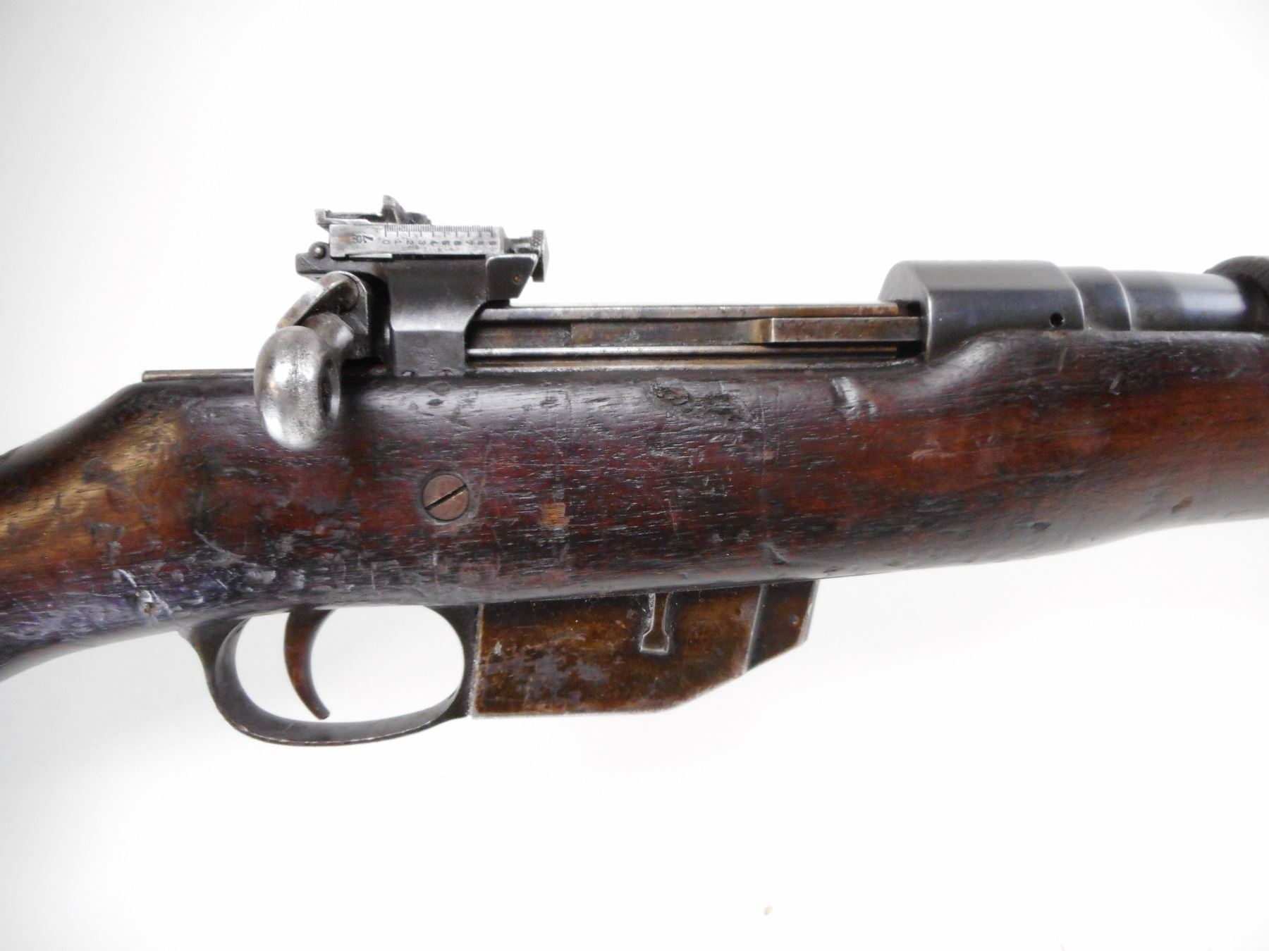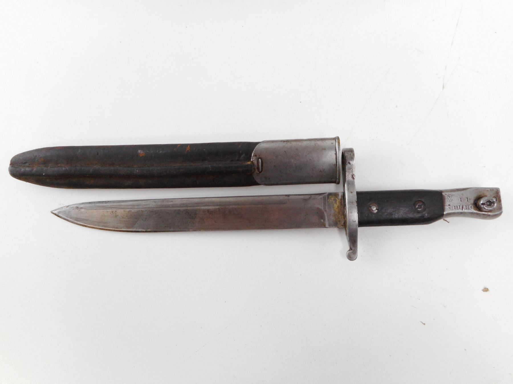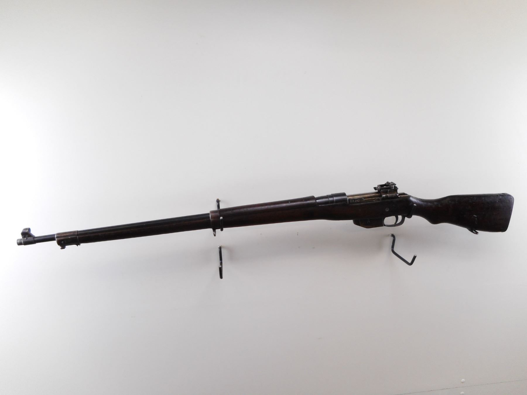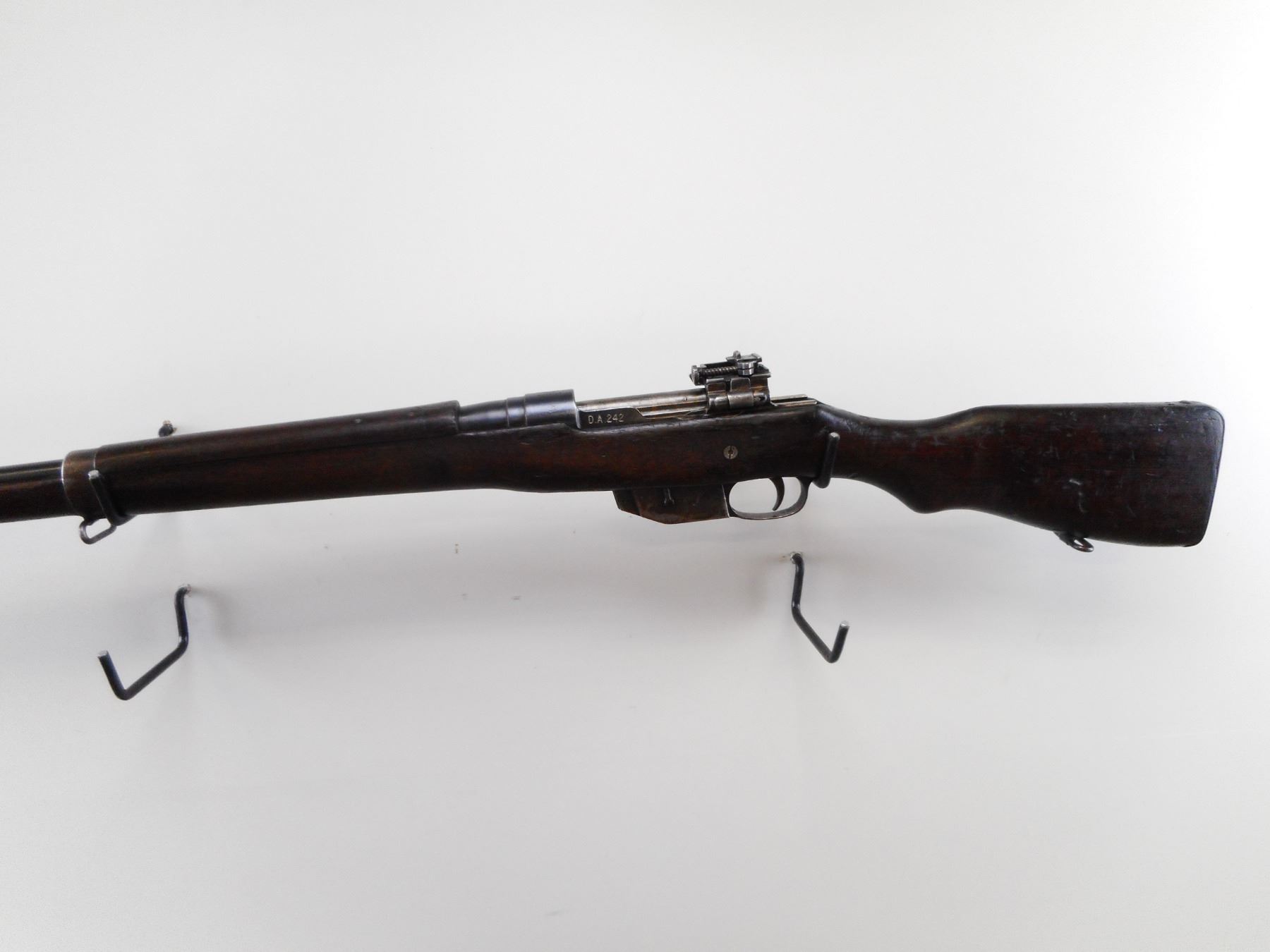 RARE, ROSS , MODEL: 1910 MKIII , CALIBER: 303 BR , COMES WITH MATCHING BAYONET, WITH BRITISH TYPE SCABBARD. BORE IS GOOD, WORN WITH LIGHT PITTING. BLADE FRONT SIGHT WITH HOOD. ADJUSTABLE REAR PEEP SIGHT. BLUED FINISH ON METAL PARTS. UNPINNED COLOUR CASE HARDENED BOLT. SMOOTH STEEL BUTT PLATE WITH BRASS TRAP. 4 SWIVELS. 2 STAMPED BARREL BANDS. BAYONET LUG. RIGHT SIDE OF BUTT STOCK MARKED "31ST BN CEF." LEFT SIDE OF RECEIVER MARKED "DA 242" THIS # WAS SOLD TO ENGLAND FOR USE ON H.M.S. CANADA, SHIP AND RIFLES SOLD TO CHILEAN NAVY MARKED WITH "DA" AND RACK # THE BAYONET IS MATCHING TO THIS. BLUEING SHOWS SOME WEAR AND LIGHT RUST SPECKLES. STOCK SHOWS HANDLING MARKS AND WEAR. , SERIAL # 365ES , ACTION: STRAIGHT PULL BOLT , BARREL LENGTH: 30 1/2" , CONDITION: 6/10 , CLASS: CANADIAN NON RESTRICTED CLASS. CONSIGNOR STATES. "The following two Ross rifles were sent overseas with the CEF, then exchanged to the British for SMLE's. The British reissued them to the Royal Navy stamped with British ownership numbers, and they became part of the on board Armory of various warships. The battleship HMS Canada, was ordered by Chile prior to the start of WWI but not delivered. With the outbreak of war, the British appropriated the battleship. After the war, HMS Canada and several destroyers were sent to Chile, and their on board rifles and bayonets were included. The Chilean Navy renamed the battleship the Almirante Latorre, and stamped the Ross rifles with a DA Navy ownership number on the receiver. The bayonets were stamped to match the rifles. These rifles are early production, with CEF stamps, Royal Navy stamps, and Chilean Navy stamps."
