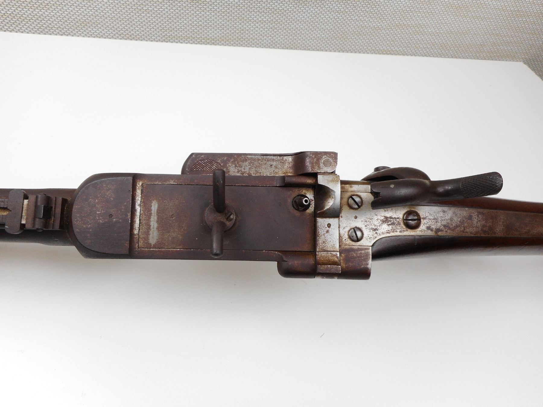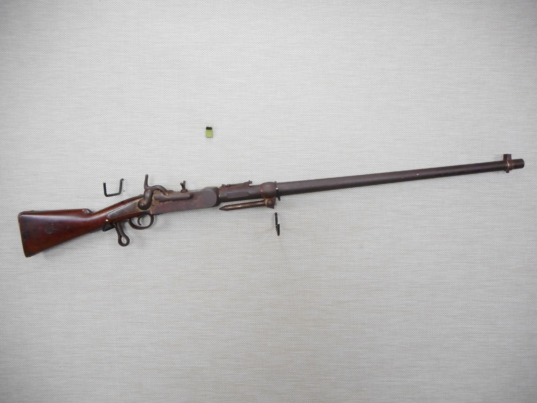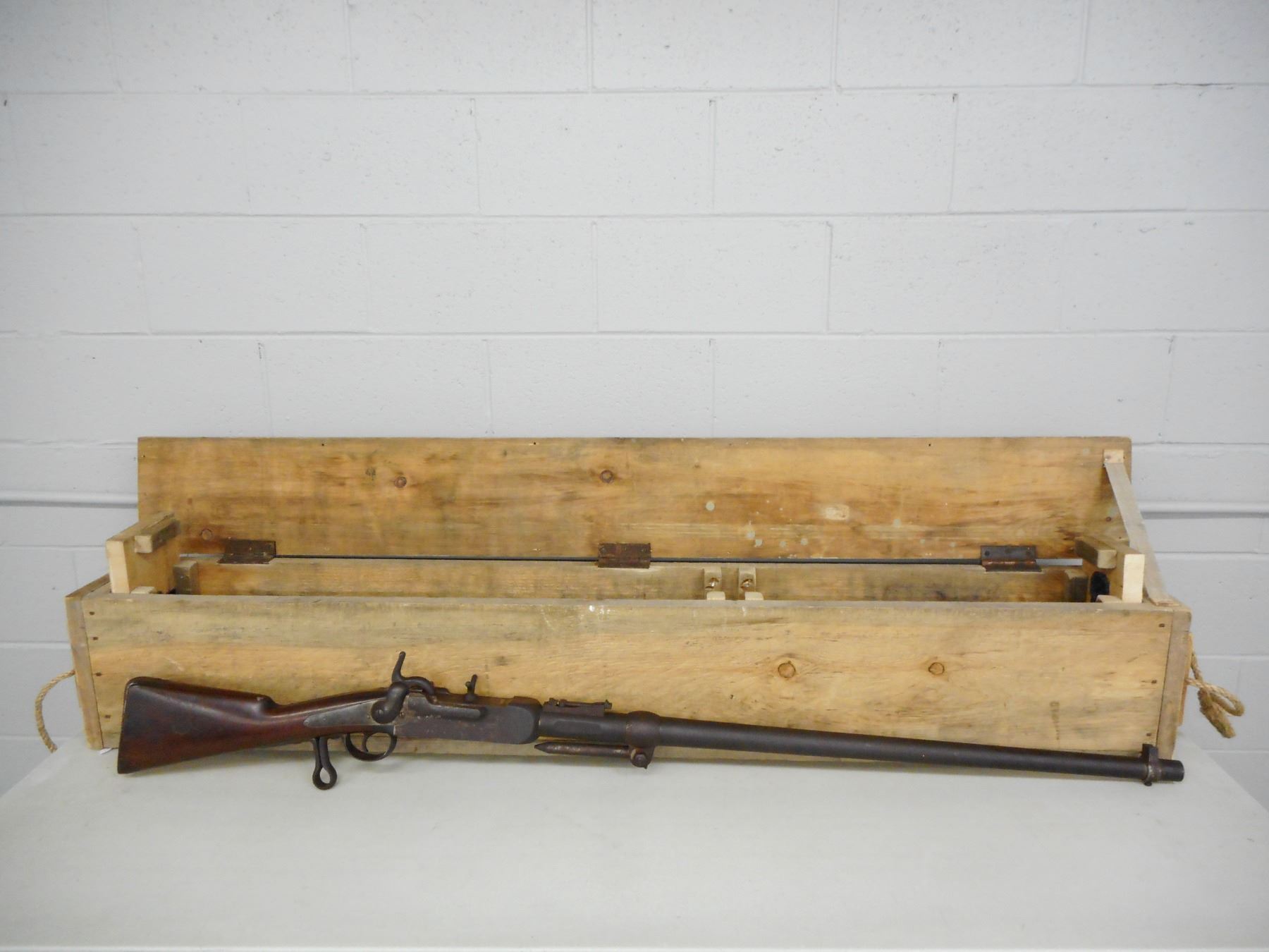 https://www.rockislandauction.com/detail/69/3218/belgian-percussion-wallfortress-gun COMES WITH HOMEMADE ROUGH WOOD CASE, DATED 1866 ON THE BARREL WITH A LIEGE MAKER'S MARK ON THE STOCK, BORE IS VERY GOOD WITH SOME LIGHT RUST SPECKLES , METAL SURFACES HAVE A BROWN PATTINA, THIS ARM WAS PRODUCED AS A HEXAGONALLY RIFLED WALL OR RAMPART GUN AND FITTED WITH A QUICK RELEASE RECTANGULAR BREECHBLOCK. SUCH ARMS, EFFECTIVELY A MIDPOINT BETWEEN THE SHOULDER FIRED RIFLE AND CREW SERVED ARTILLERY, WERE TYPICALLY PLACED IN FIXED POSITIONS WHERE BARRICADES AND WALLS COULD SERVE TO BEAR THE WEIGHT OF THE ARM AND USED TO HARASS THE ENEMY AT RANGES EXCEEDING CONVENTIONAL RIFLE FIRE. THIS PARTICULAR EXAMPLE WEIGHTS IN AT APPROXIMATELY 33 POUNDS. BLADE FRONT AND FOLDING LADDER REAR SIGHTS, WITH A 360 DEGREE SWIVELING PINTLE AHEAD OF THE REAR SIGHT, AND A NUMBER OF SMALL PROOFS "M" IN A CIRCLE AS WELL AS A LION / M IN A RECTANGLE ON THE BARREL, FRAME AND LOCK PLATE. THE RECTANGULAR STEEL BREECHBLOCK CONTAINS THE CHAMBER AND CAN BE RAPIDLY REMOVED BY DEPLOYING A LEVER ON THE FRAME. SMOOTH HALF STOCK WITH A STEEL PISTOL GRIP AND BUTTPLATE, AS WELL AS "MANUFACT. D'ARMES/18 LIEGE 66" STAMPED ON THE RIGHT SIDE. INCLUDED WITH THE ARM IS A PAIR OF WOODEN DISPLAY STANDS. A VERY SIMILAR WALL GUN HAS BEEN ATTRIBUTED TO PIERRE MALHERBE OF LIEGE , STOCK # , SERIAL # 65 , ACTION: REMOVEABLE BREECH BLOCK SINGLE SHOT , BARREL LENGTH: 39" , CONDITION: 8/10 , CLASS: CLASS: CANADIAN ANTIQUE CLASS NO LICENSE REQUIRED