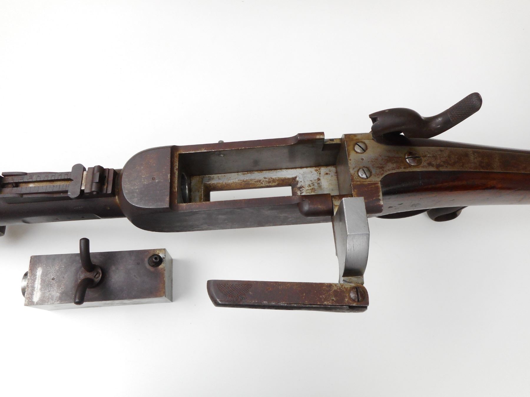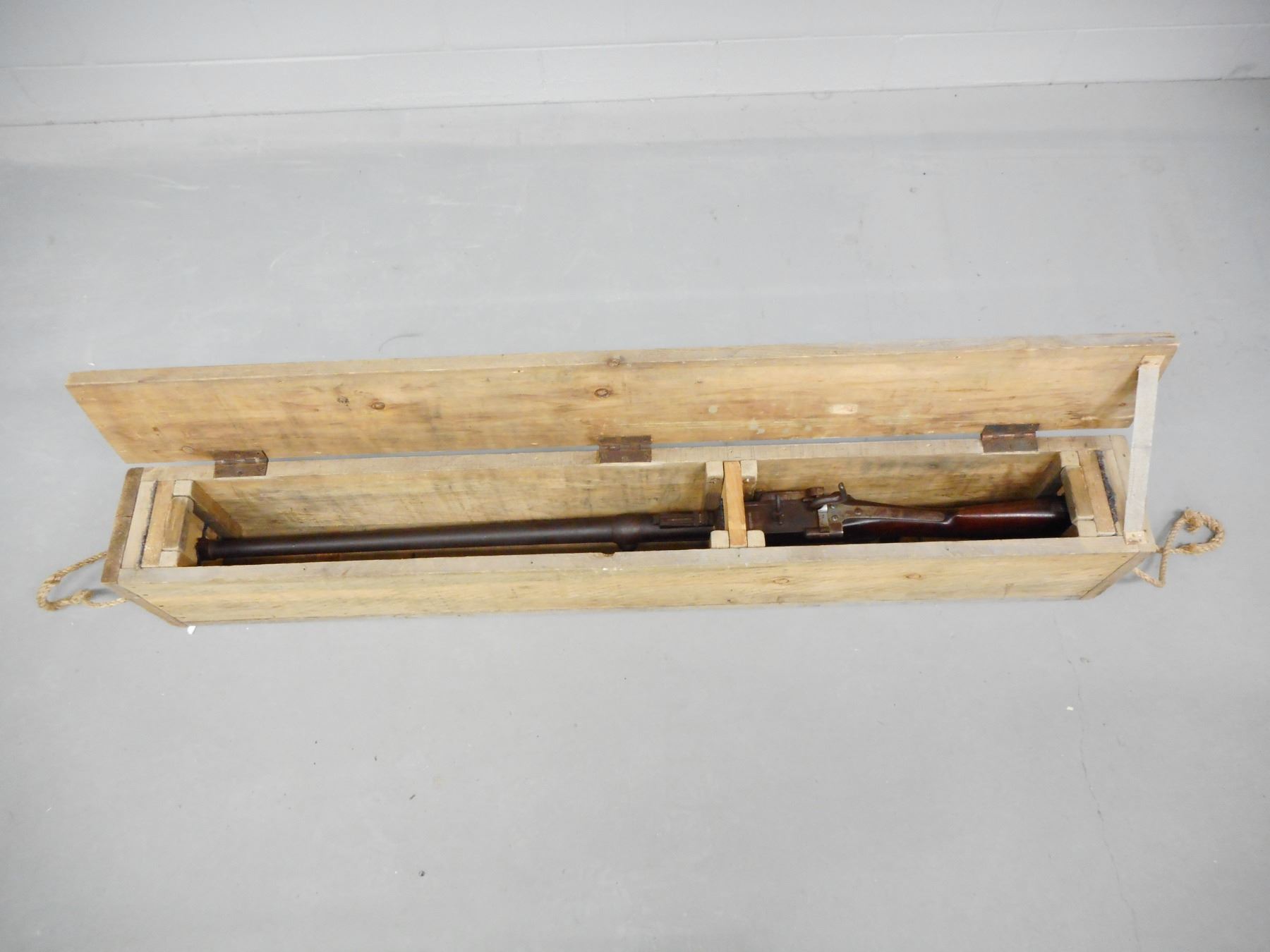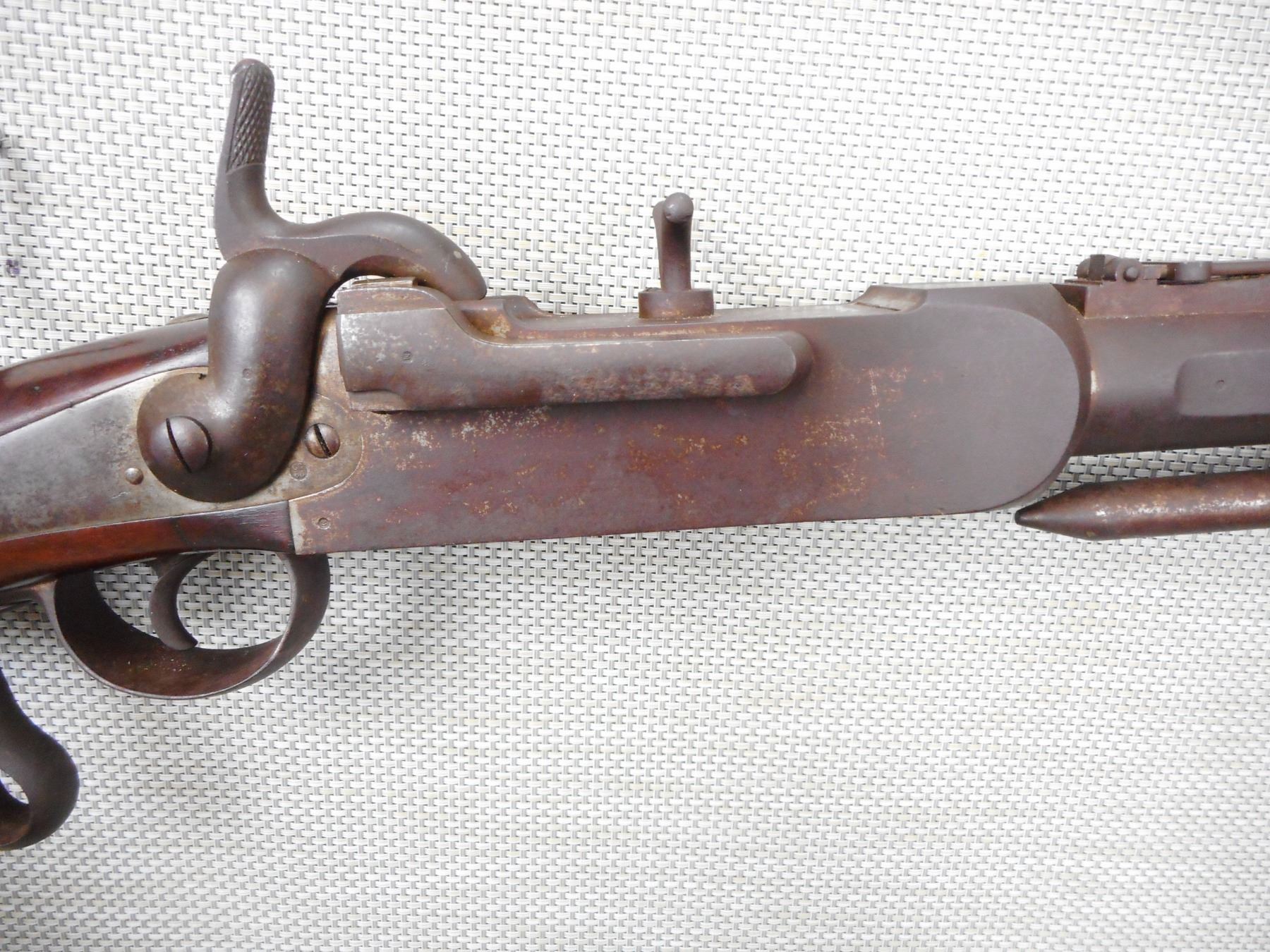 https://www.rockislandauction.com/detail/69/3218/belgian-percussion-wallfortress-gun COMES WITH HOMEMADE ROUGH WOOD CASE, DATED 1866 ON THE BARREL WITH A LIEGE MAKER'S MARK ON THE STOCK, BORE IS VERY GOOD WITH SOME LIGHT RUST SPECKLES , METAL SURFACES HAVE A BROWN PATTINA, THIS ARM WAS PRODUCED AS A HEXAGONALLY RIFLED WALL OR RAMPART GUN AND FITTED WITH A QUICK RELEASE RECTANGULAR BREECHBLOCK. SUCH ARMS, EFFECTIVELY A MIDPOINT BETWEEN THE SHOULDER FIRED RIFLE AND CREW SERVED ARTILLERY, WERE TYPICALLY PLACED IN FIXED POSITIONS WHERE BARRICADES AND WALLS COULD SERVE TO BEAR THE WEIGHT OF THE ARM AND USED TO HARASS THE ENEMY AT RANGES EXCEEDING CONVENTIONAL RIFLE FIRE. THIS PARTICULAR EXAMPLE WEIGHTS IN AT APPROXIMATELY 33 POUNDS. BLADE FRONT AND FOLDING LADDER REAR SIGHTS, WITH A 360 DEGREE SWIVELING PINTLE AHEAD OF THE REAR SIGHT, AND A NUMBER OF SMALL PROOFS "M" IN A CIRCLE AS WELL AS A LION / M IN A RECTANGLE ON THE BARREL, FRAME AND LOCK PLATE. THE RECTANGULAR STEEL BREECHBLOCK CONTAINS THE CHAMBER AND CAN BE RAPIDLY REMOVED BY DEPLOYING A LEVER ON THE FRAME. SMOOTH HALF STOCK WITH A STEEL PISTOL GRIP AND BUTTPLATE, AS WELL AS "MANUFACT. D'ARMES/18 LIEGE 66" STAMPED ON THE RIGHT SIDE. INCLUDED WITH THE ARM IS A PAIR OF WOODEN DISPLAY STANDS. A VERY SIMILAR WALL GUN HAS BEEN ATTRIBUTED TO PIERRE MALHERBE OF LIEGE , STOCK # , SERIAL # 65 , ACTION: REMOVEABLE BREECH BLOCK SINGLE SHOT , BARREL LENGTH: 39" , CONDITION: 8/10 , CLASS: CLASS: CANADIAN ANTIQUE CLASS NO LICENSE REQUIRED