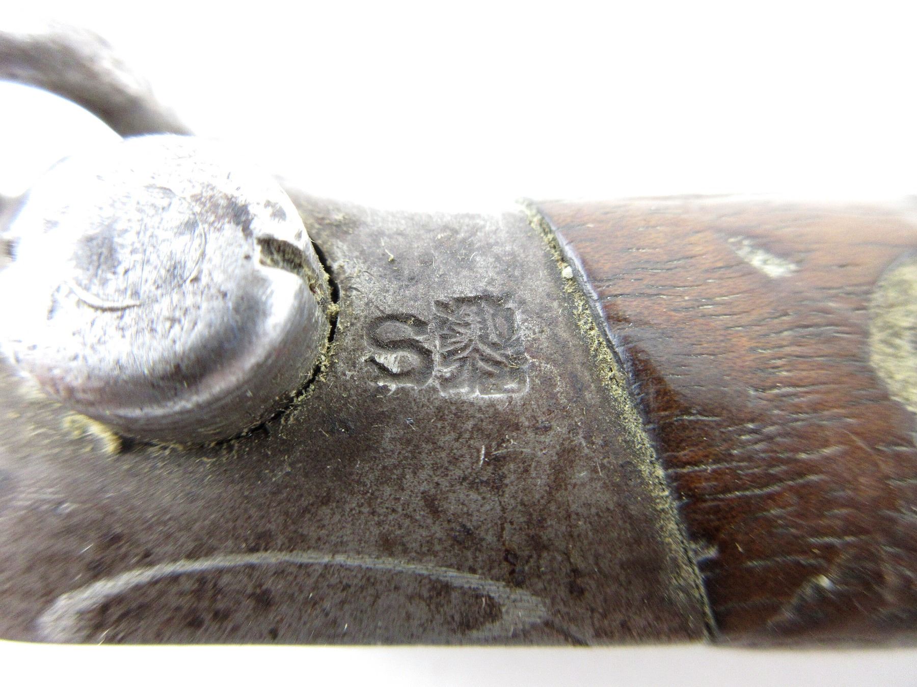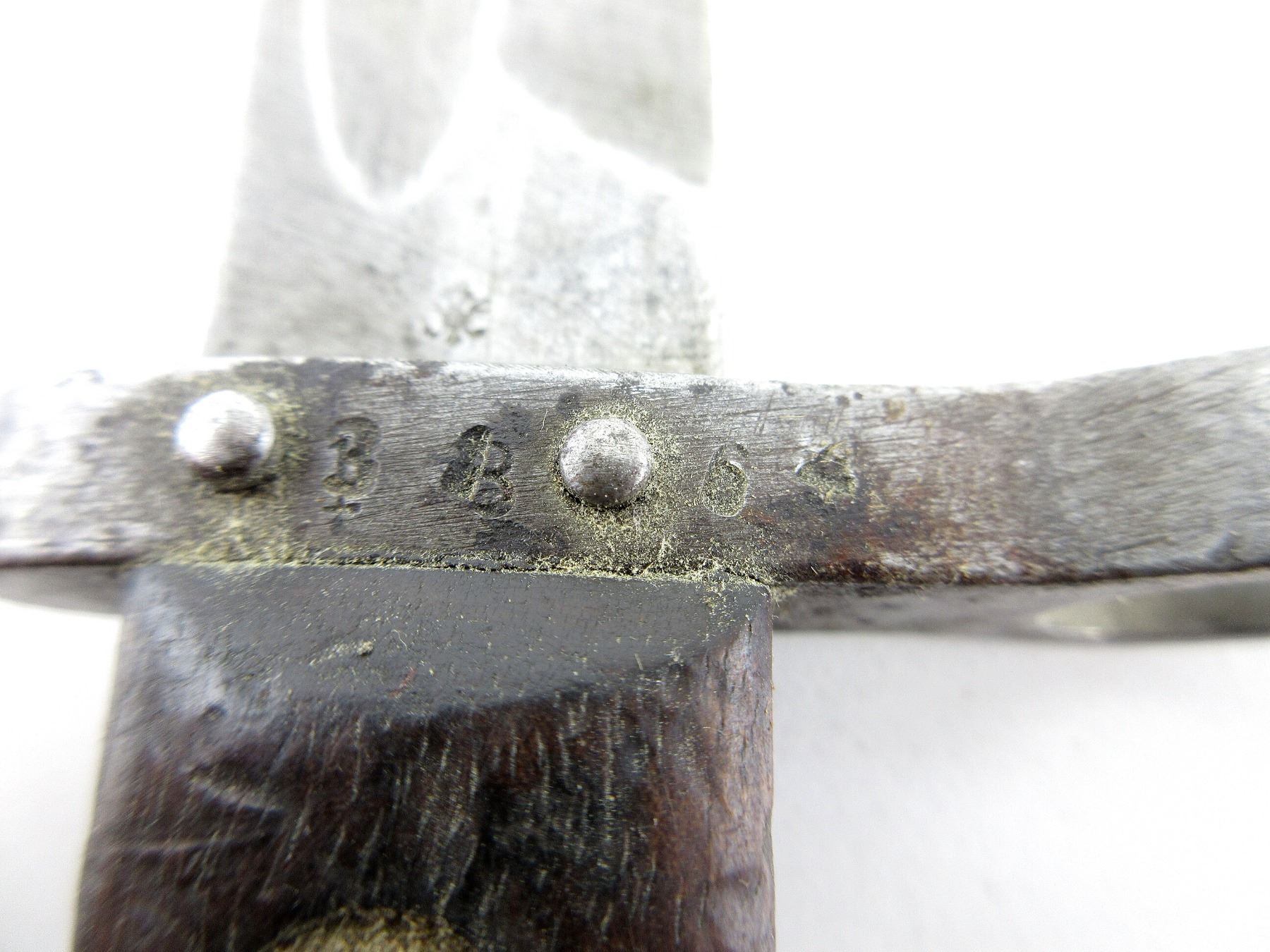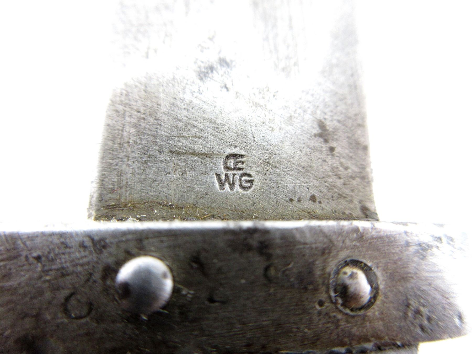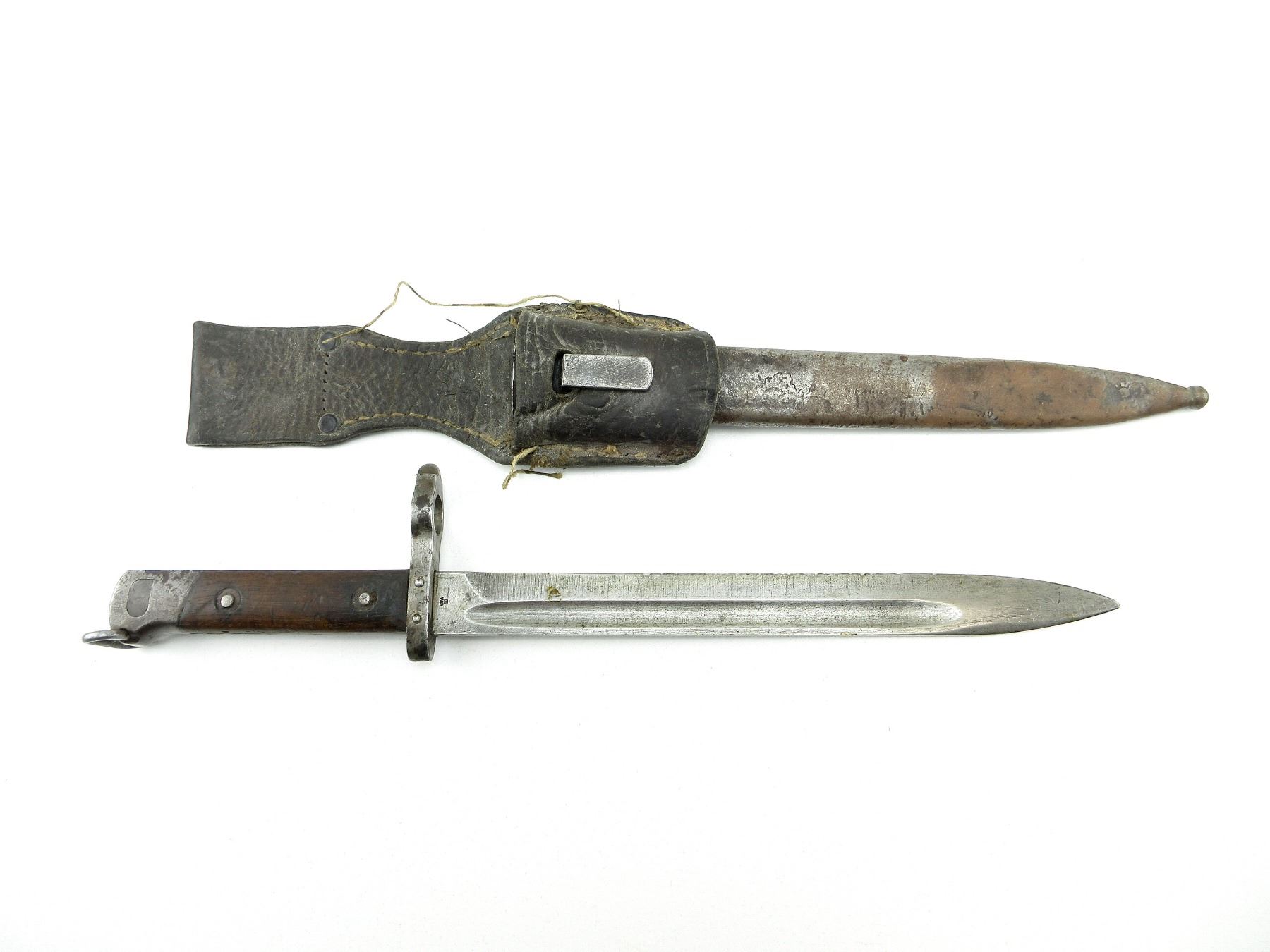 (1) FITS 8X50MMR MANNLICHER M1895 CAVALRY CARBINES, RICASSO MARKED: "CE" OVER "WG", OTHER-SIDE MARKED WITH PROOF MARK, CROSS-PIECE MARKED: "3364" STAMPED OVER OTHER MARKINGS, FRONT SIGHT FITTED ON TOP OF CROSSGUARD, 2-PIECE WOOD GRIP, METAL POMMEL WITH SWIVEL, POMMEL MARKED: "S" & PROOF MARK, STEEL SCABBARD WITH LEATHER FROG, NO VISIBLE MARKINGS, BLADE APPROX. 9.75" & OAL APPROX. 14 1/8". SEE PHOTOS.