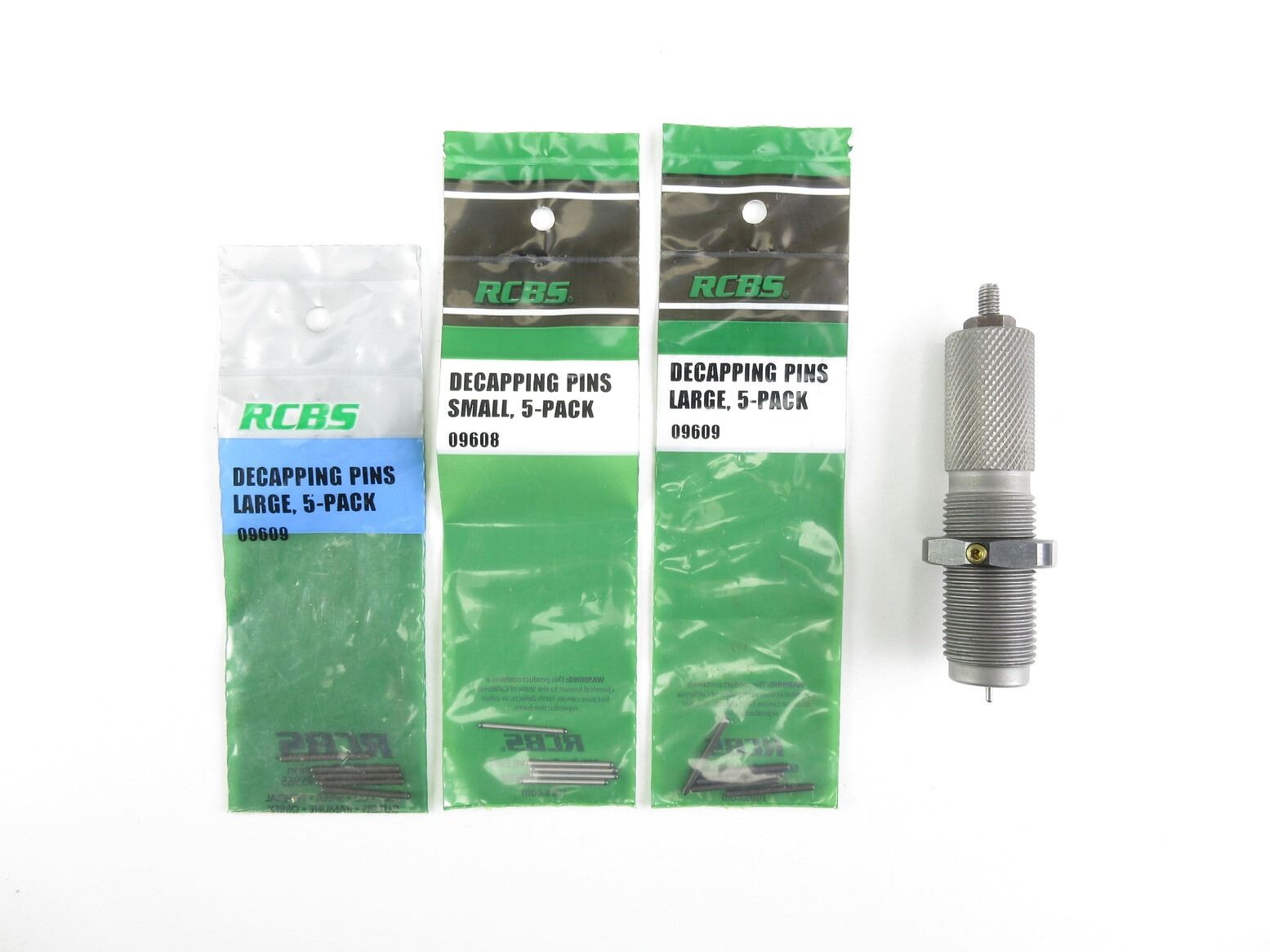 RCBS UNIVERSAL DECAPPING DIES AND PINS LOT. LOT INCLUDES; (1) RCBS UNIVERSAL DECAPPING DIE, (1) RCBS LARGE DECAPPING PINS, 5PK, UN-OPENED ORIGINAL PACKAGING (1) RCBS LARGE DECAPPING PINS, 5PK, UN-OPENED ORIGINAL PACKAGING & (1) RCBS SMALL DECAPPING PINS, 5PK, UN-OPENED ORIGINAL PACKAGING. SEE PHOTOS.