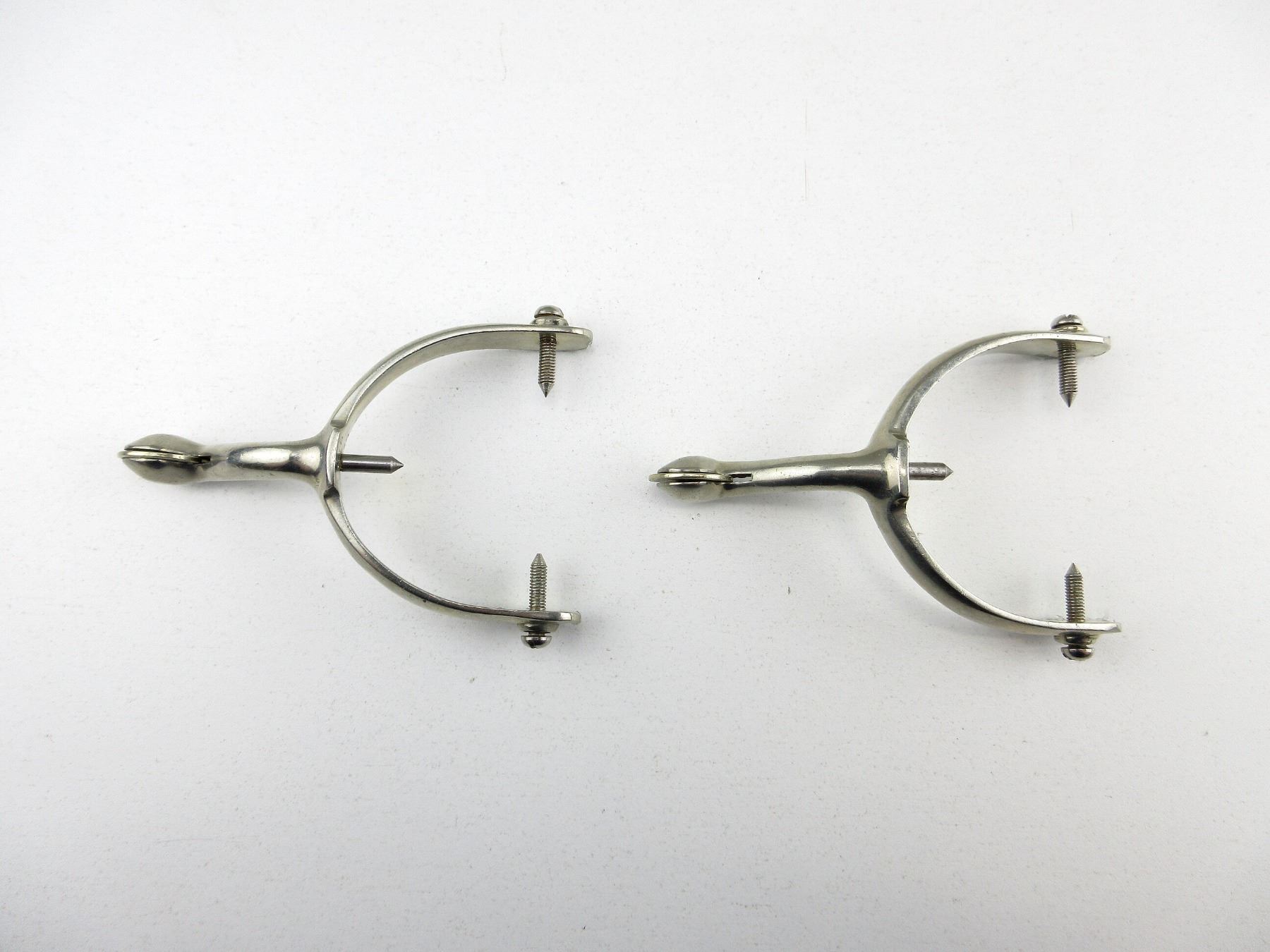 (1) PAIR OF METAL SPURS, CONSIGNOR STATES: "RCMP SPURS FOR WELLINGTON BOOTS, WITH POINTED SCREWS", MARKED: "M.H. 78, 975-1579", APPROX. 4 3/8" L X 2.5" W. SEE PHOTOS. **PLEASE CHECK YOUR PROVINCIAL LAWS / RESTRICTIONS BEFORE BIDDING ON THIS ITEM. WE WILL NOT SHIP THIS ITEM TO NOVA SCOTIA.**