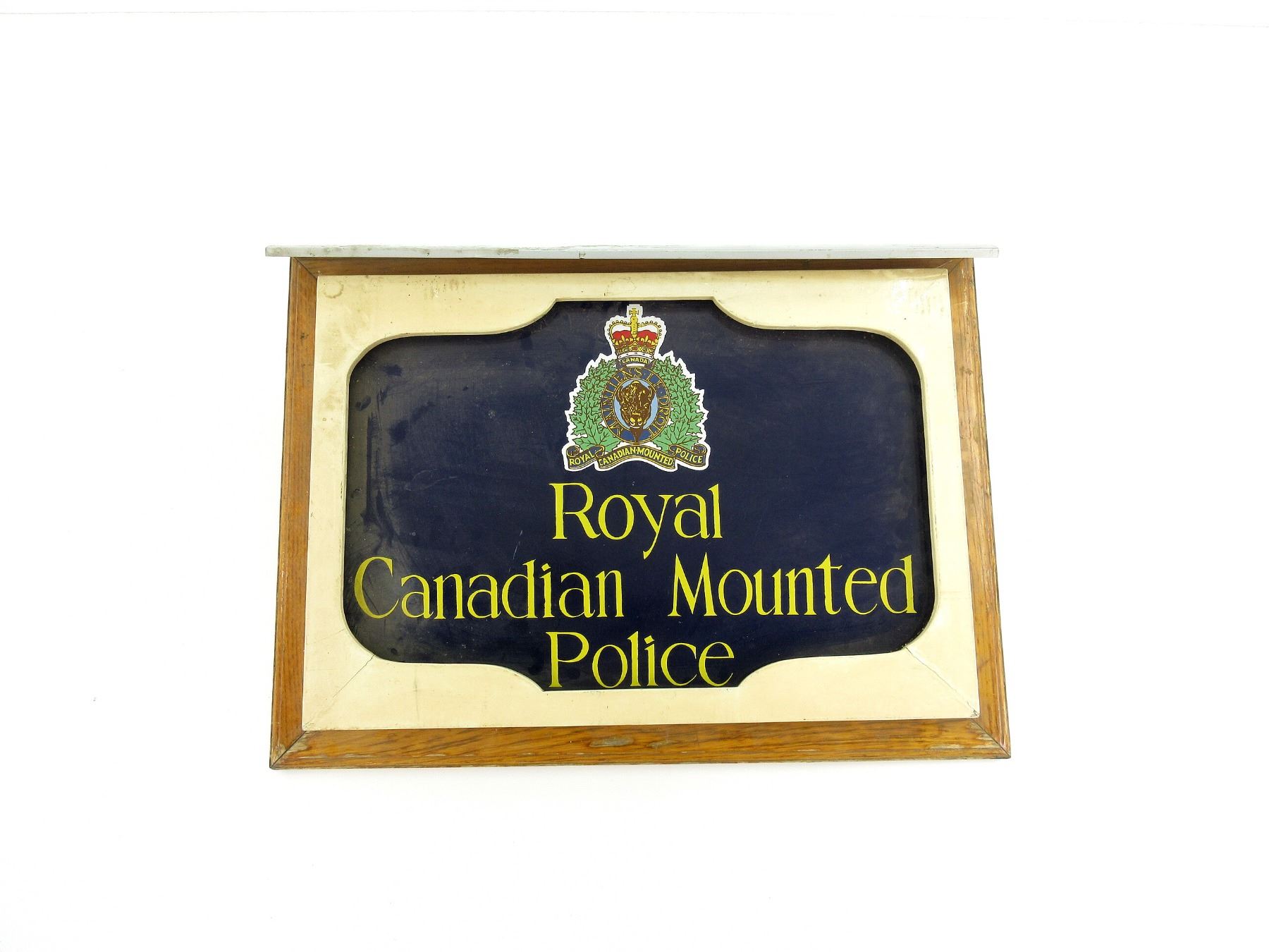 (1) RCMP CREST / LOGO METAL SIGN AFFIXED TO WOODEN FRAME, EMBOSSED / PAINTED METAL, APPROX. 27 3/8" X 20" X 3.25" MEASUREMENT INCLUDES WOODEN FRAME & METAL PIECE ALONG TOP. SEE PHOTOS.
