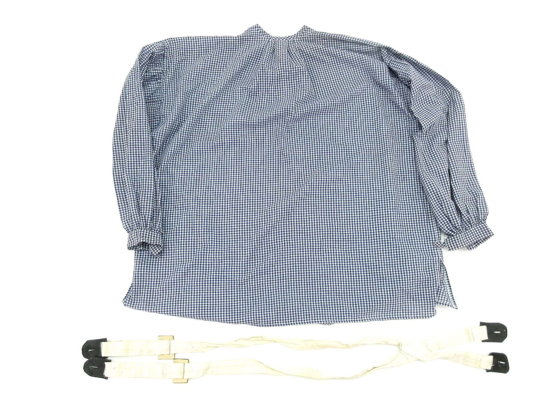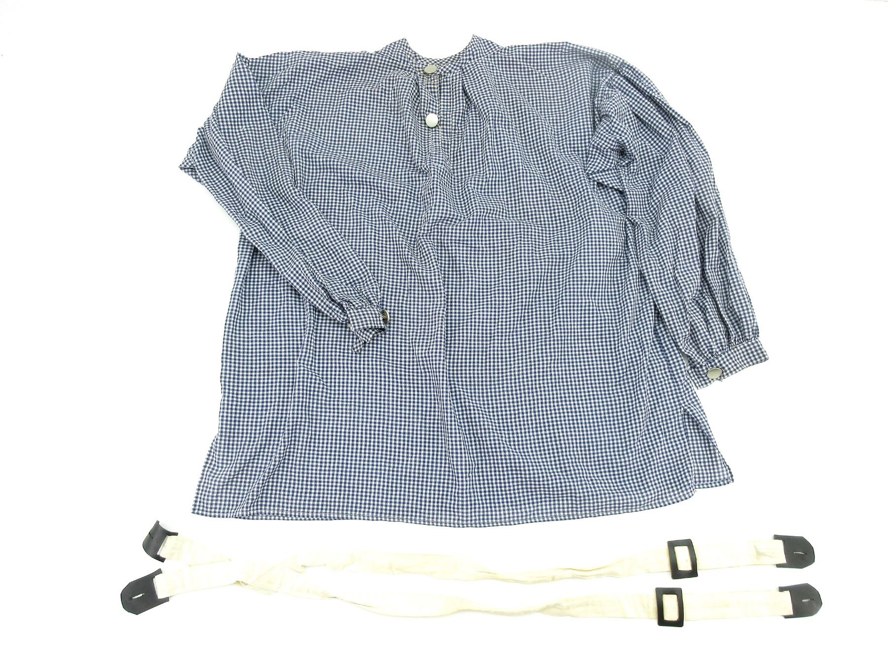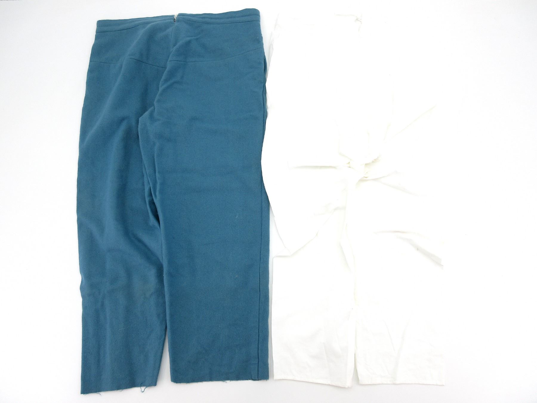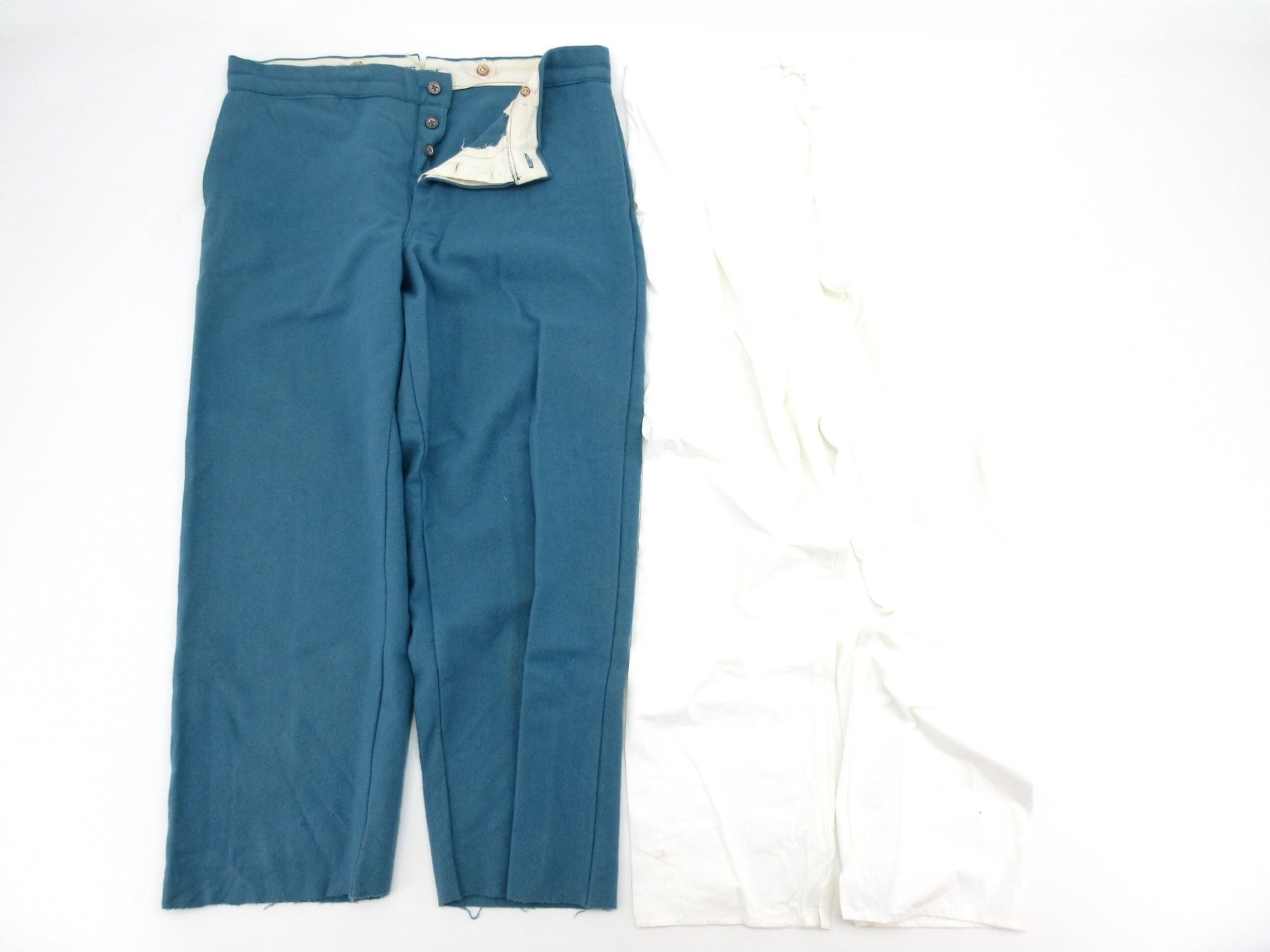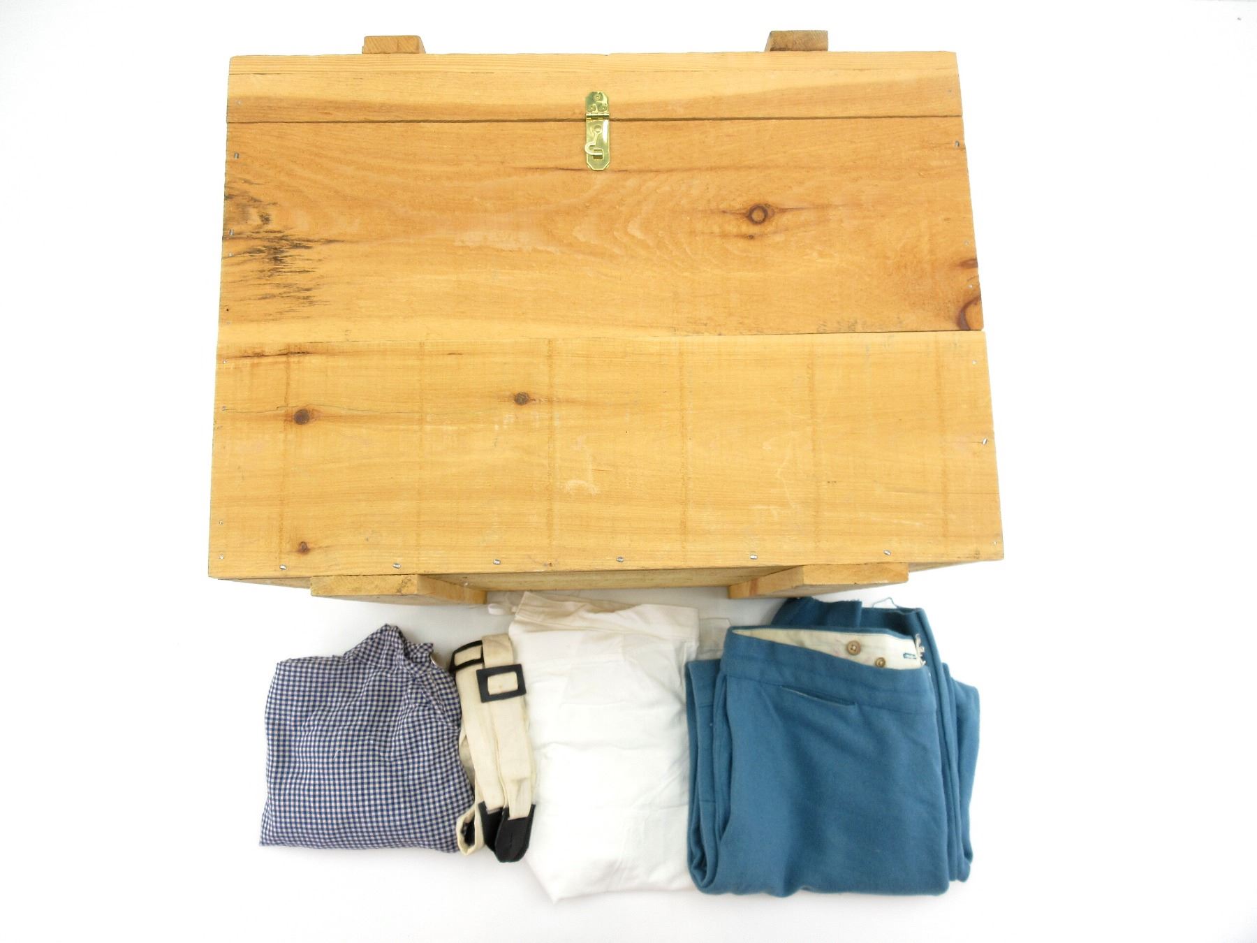 LOT INCLUDES; (1) PAIR OF LIGHT BLUE WOOL STYLE PANTS, NO VISIBLE MARKINGS, CONSIGNOR STATES: "SIZE LARGE", BUTTON-FLY, SHOWS WEAR, WAIST APPROX. 41", (1) WHITE CANVAS & LEATHER SUSPENDERS, (1) WHITE COTTON / LINEN STYLE LONG-JOHNS, NO VISIBLE MARKINGS, CONSIGNOR STATES: "SIZE LARGE", BUTTON-FLY, TIE IN BACK, WAIST APPROX. 40", SLIGHTLY ADJUSTABLE WITH TIE IN BACK, (1) BLUE / WHITE PLAID COTTON / LINEN STYLE LONG-SLEEVED SHIRT, NO VISIBLE MARKINGS, CONSIGNOR STATES: "SIZE LARGE", BUTTON-UP COLLAR, SHOULDER WIDTH APPROX. 25.5" & (1) WOODEN RE-ENACTMENT CSA TRUNK, HINGES MARKED: "MADE IN CHINA", NO OTHER VISIBLE MARKINGS / LABELS, METAL CARRY HANDLES, METAL LATCH & APPROX. 24" X 16.5" X 18.25". SEE PHOTOS.