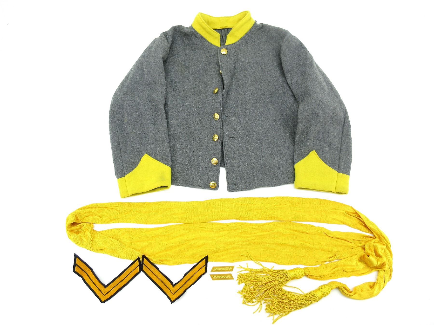 LOT INCLUDES; (1) GREY / YELLOW WOOL STYLE COAT, NO VISIBLE MARKINGS / LABELS, CONSIGNOR STATES: "SIZE LARGE", BUTTON-FRONT, BRASS BUTTONS MARKED: "CSA", SHOULDER WIDTH APPROX. 21.75", (1) YELLOW SASH WITH ROPE TASSELS, NO VISIBLE MARKINGS / LABELS, OAL APPROX. 128", (2) YELLOW / BLUE WOOL CORPORAL RANK CHEVRONS & (2) GOLD COLLAR TABS. SEE PHOTOS.