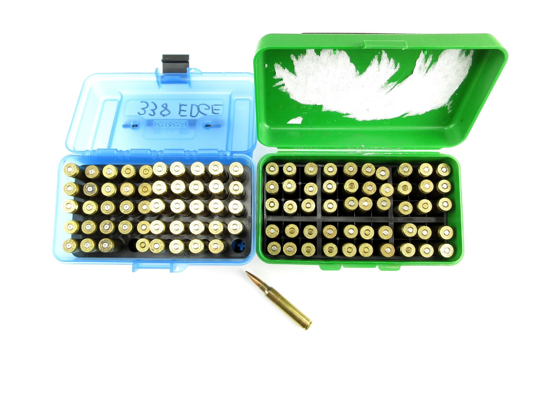 LOT INCLUDES; APPROX. (28) RNDS, MADE FROM .300 REM ULTRA MAG BRASS CASES, (56) PRIMED .300 REM ULTRA MAG BRASS CASES, CONSIGNOR STATES; "FORMED TO .338 EDGE", MAY NEED TO BE FORMED, (15) NON-PRIMED BRASS CASES, (2) CASE-GARD PLASTIC AMMO BOXES.