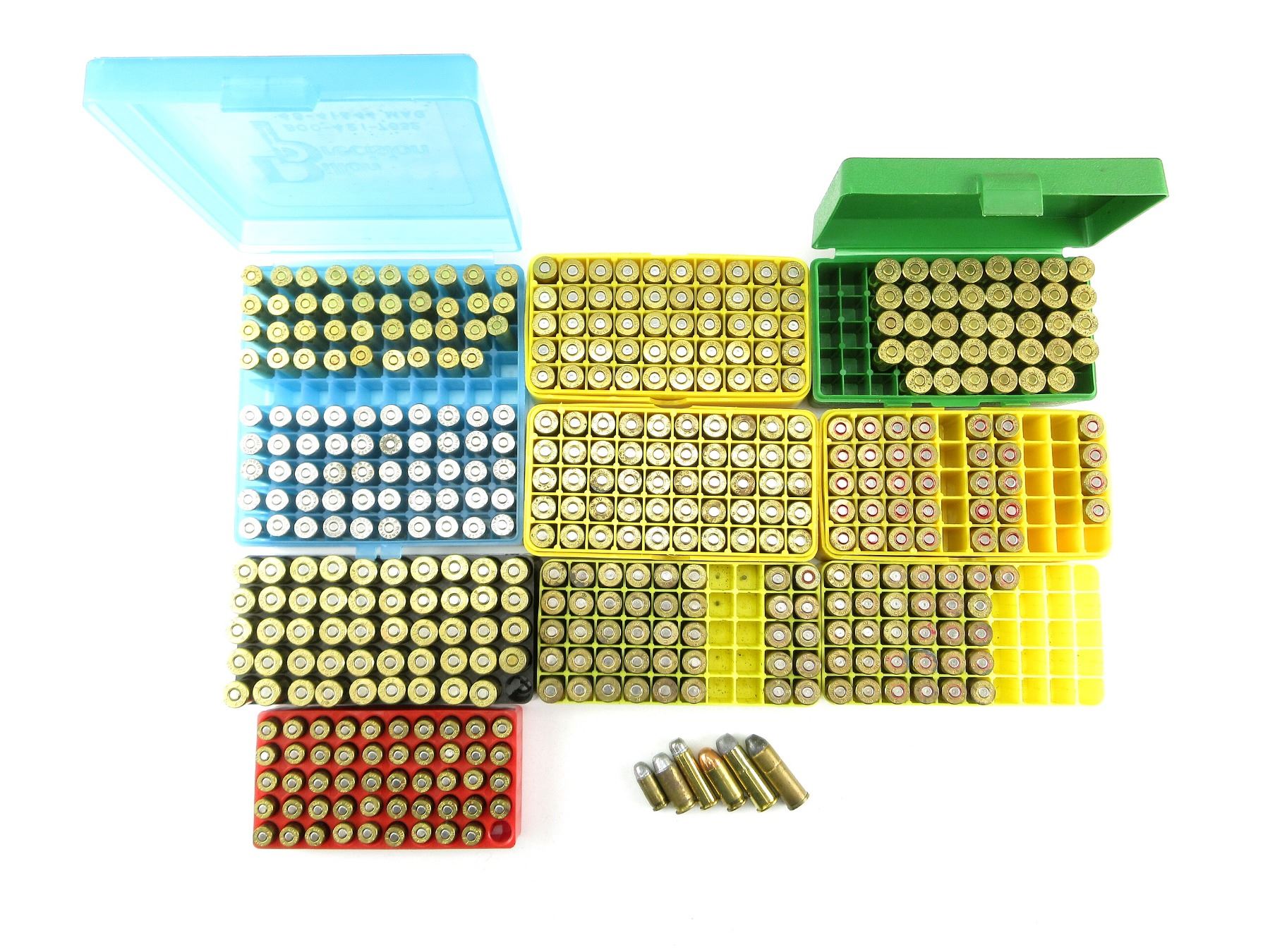 LOT INCLUDES; APPROX. (386) RNDS, VARIOUS CALIBERS INCLUDING; .38 SPL, .380 AUTO, .45 AUTO,.44-40, .45 COLT, (50) PRIMED .38 SPL NICKEL CASES, (4) PLASTIC AMMO BOXES.
