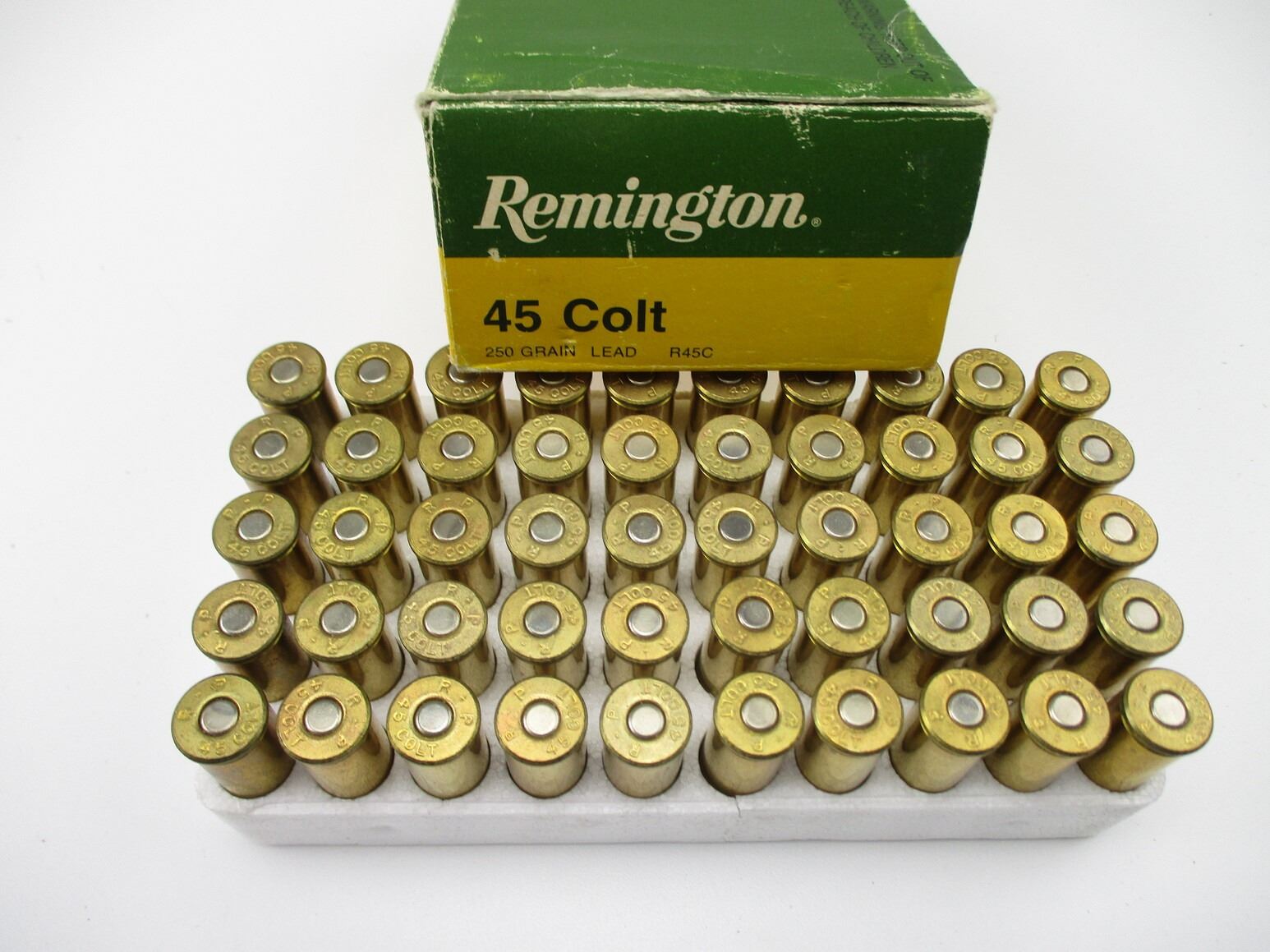 REMINGTON .45 COLT AMMO , 50 RNDS, LEAD, SOME CORROSION. , THERE ARE NEW SHIPPING RESTRICTIONS, PLEASE MAKE SURE YOU HAVE READ AND CONFIRMED WE CAN SHIP TO YOU BEFORE BIDDING ON THIS LOT. PLEASE SEE LOT 0 IN THIS SESSION. NO REFUNDS WILL BE ISSUED, OR BIDS RETRACTED.