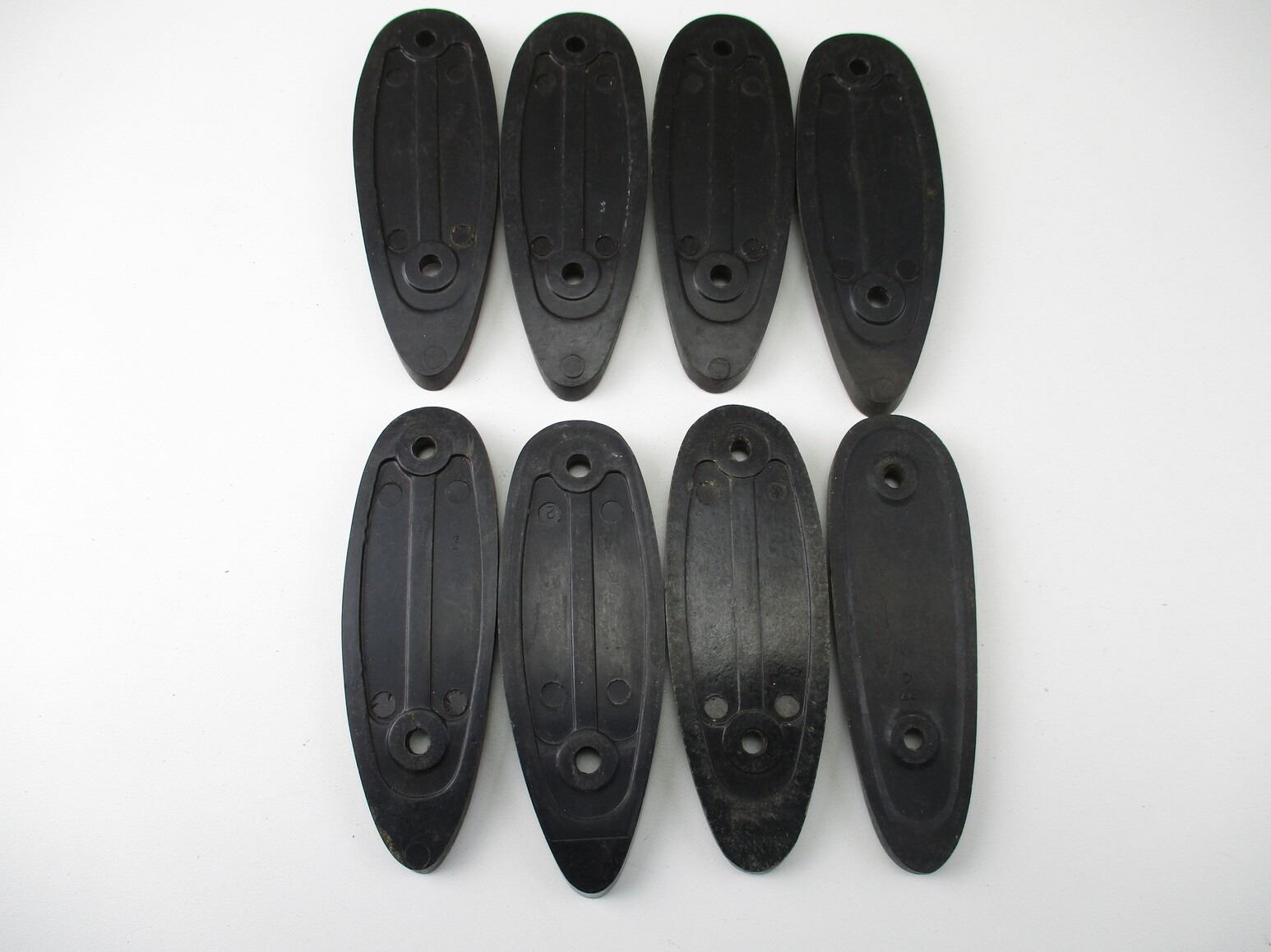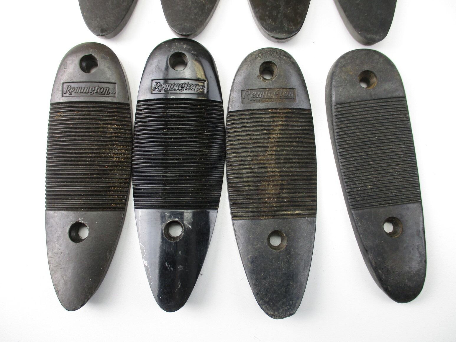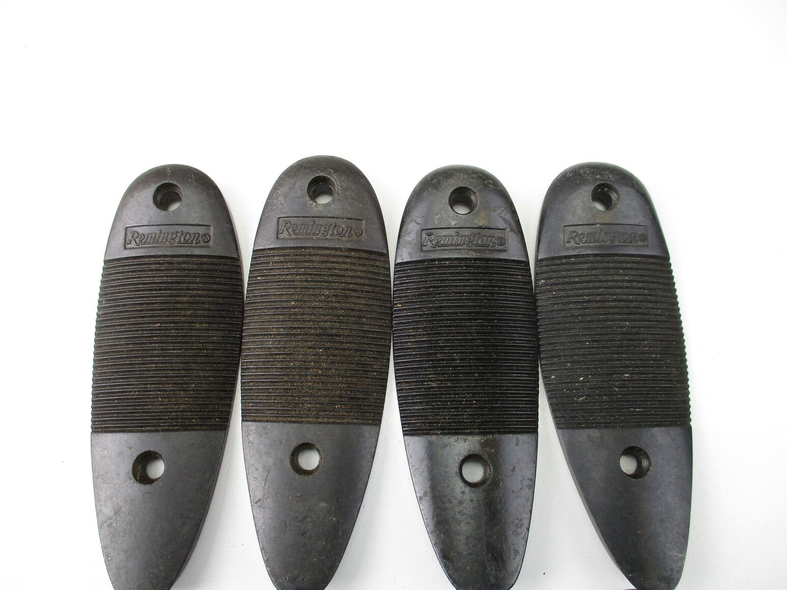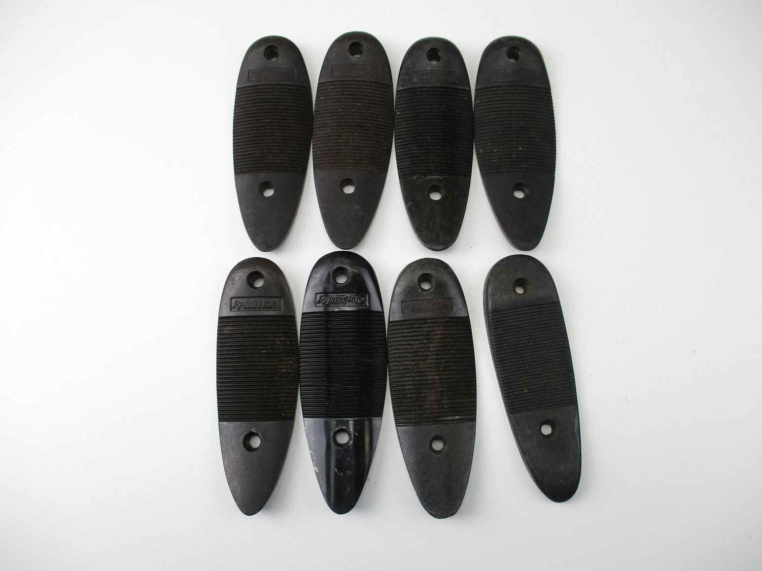 REMINGTON BUTTPLATES , LOT OF 8. APPROX. 4-7/8" X 1.75", APPROX. 3.38" SCREW SPACING. PLATES MARKED REMINGTON. MAY REQUIRE FITTING. PLASTIC CONSTRUCTION