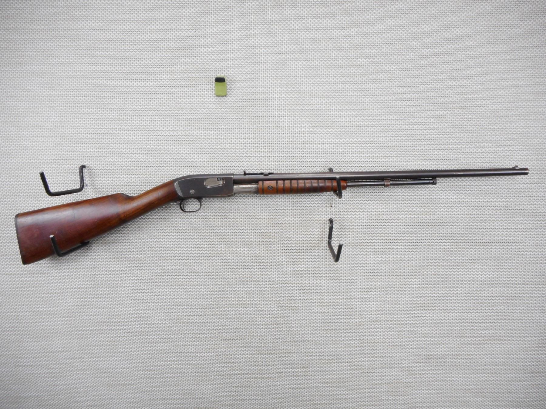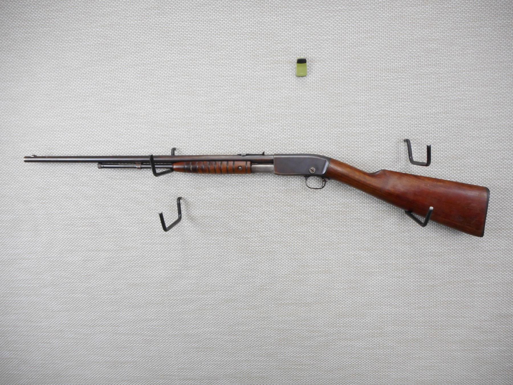 REMINGTON , MODEL: 12 , CALIBER: 22 LR , BORE IS GOOD, BLADE FRONT AND ADJUSTABLE REAR SIGHT MISSING THE ELEVATOR, THE REAR SIGHT HAS ALSO BEEN REPAIRED, TWO PIECE HARDWOOD STOCK WITH PLASTIC BUTT PLATE, SHOWS SOME HANDLING MARKS , STOCK # 9760 , SERIAL # 206860 , ACTION: PUMP ACTION RIFLE , BARREL LENGTH: 22" , CONDITION: 5/10 , CLASS: CLASS: CANADIAN NON RESTRICTED CLASS