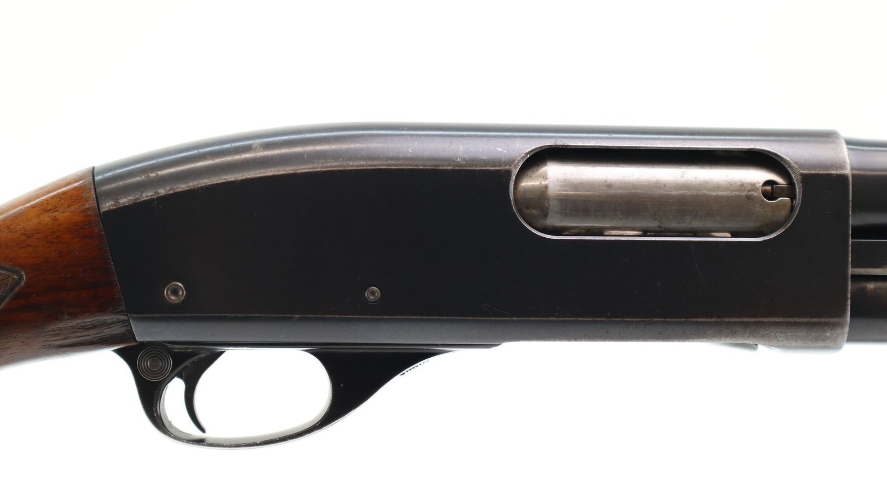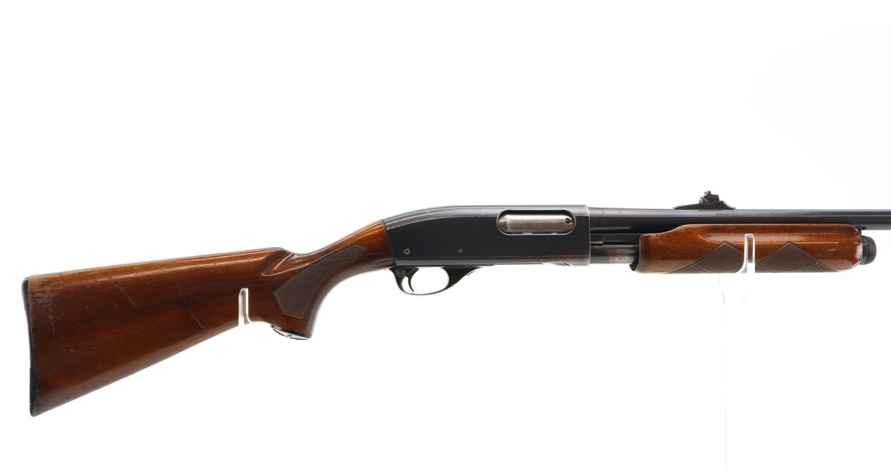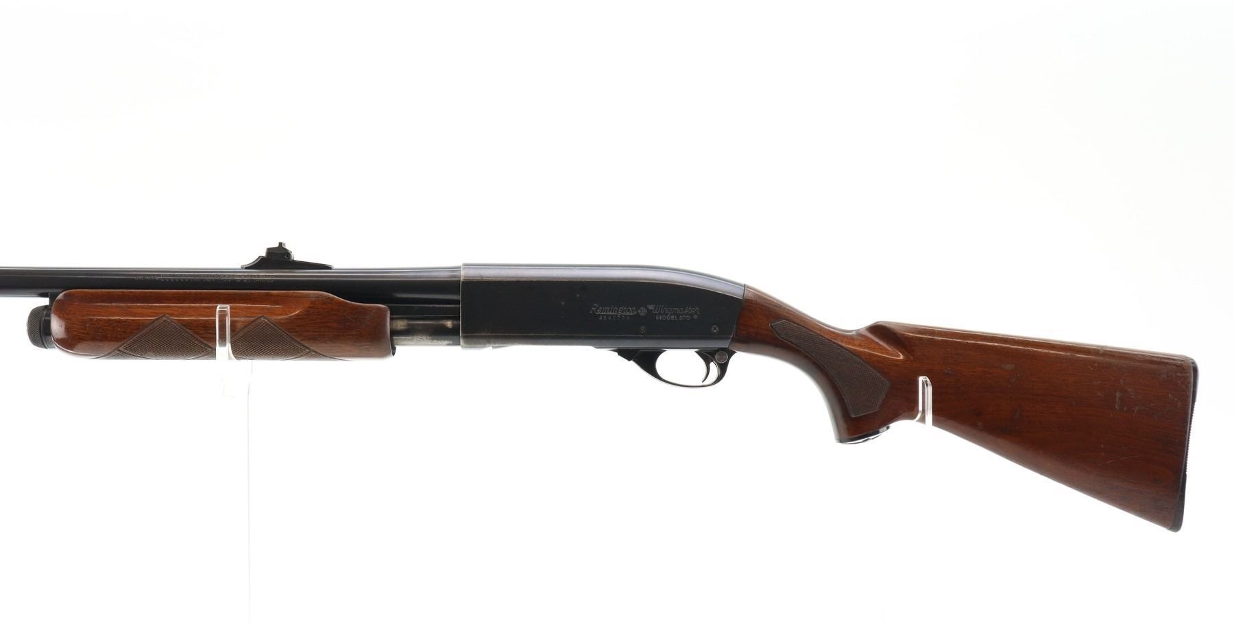 6/10. REMINGTON. MODEL: 870 WINGMASTER. CALIBER: 12 G X 2 3/4". BORE IS EXCELLENT. REMOVABLE MOD CHOKE. BLADE FRONT SIGHT WITH RAMP, ADJUSTABLE U NOTCHED REAR SIGHT, BLUED FINISH. TWO PIECE WOOD STOCKS, CHECKERED FOREARM, CHECKERED PISTOL GRIP CRACKED AND CHIPPED BEHIND RECEIVER, GROOVED BLACK POLYMER BUTT PLATE, PISTOL GRIP CAP. METAL FINISH SHOWS SOME LIGHT RUST SPECKLES, SCRATCHES, HANDLING MARKS AND WEAR. STOCKS SHOW SOME MARKS, SCRATCHES AND WEAR. ACTION: PUMP ACTION SHOTGUN. BARREL LENGTH: 20". SERIAL # 484277V. CONDITION: 6/10. CLASS: CANADIAN NON RESTRICTED CLASS