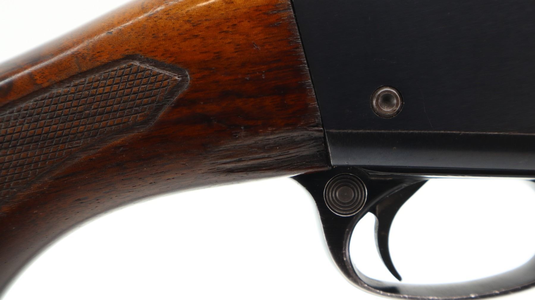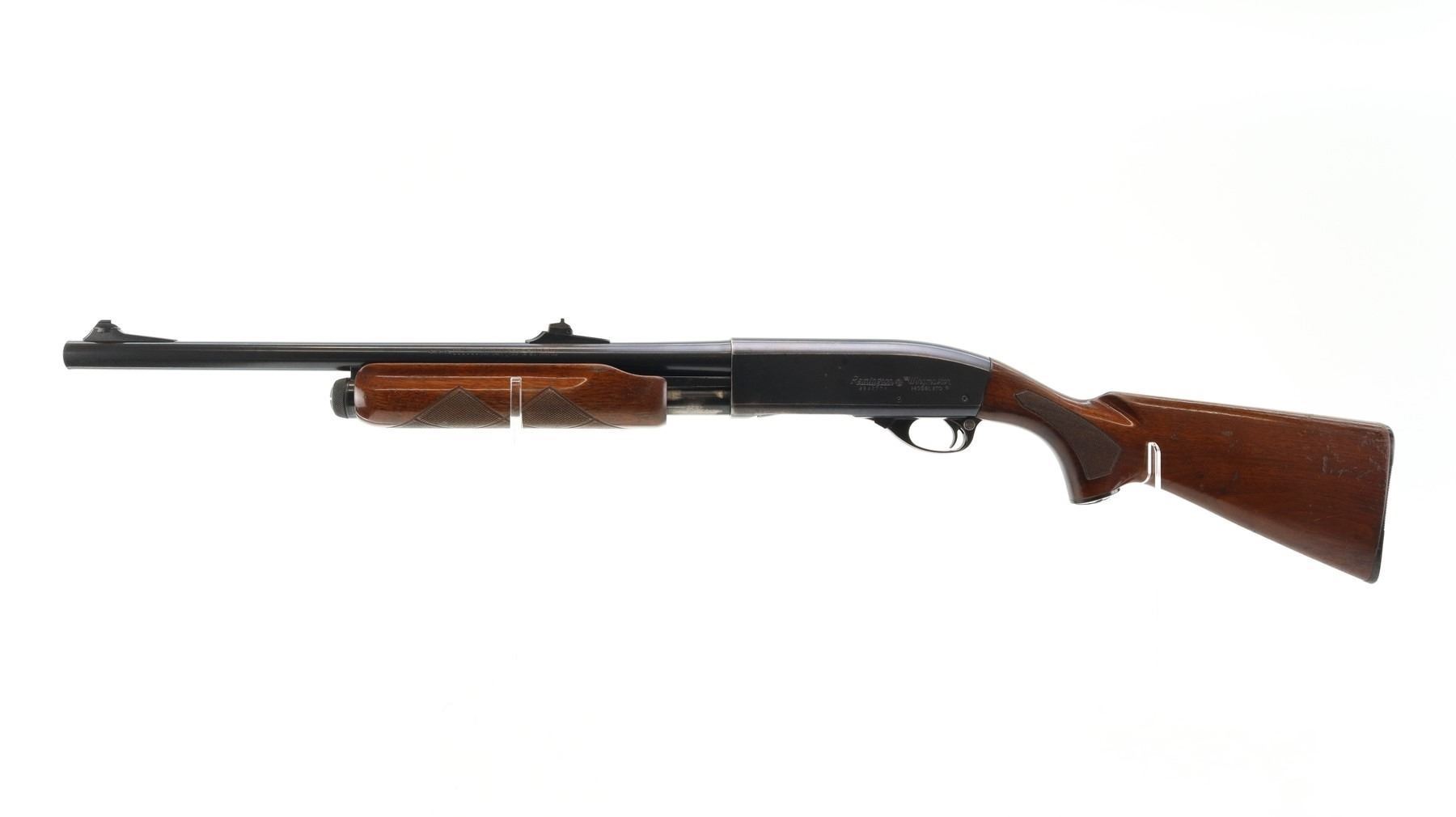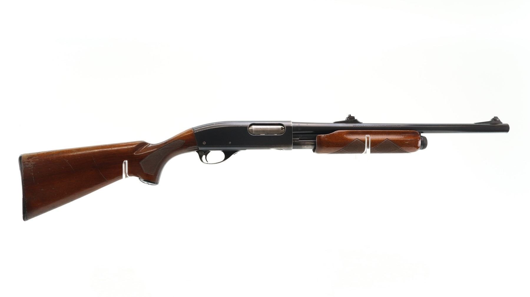 6/10. REMINGTON. MODEL: 870 WINGMASTER. CALIBER: 12 G X 2 3/4". BORE IS EXCELLENT. REMOVABLE MOD CHOKE. BLADE FRONT SIGHT WITH RAMP, ADJUSTABLE U NOTCHED REAR SIGHT, BLUED FINISH. TWO PIECE WOOD STOCKS, CHECKERED FOREARM, CHECKERED PISTOL GRIP CRACKED AND CHIPPED BEHIND RECEIVER, GROOVED BLACK POLYMER BUTT PLATE, PISTOL GRIP CAP. METAL FINISH SHOWS SOME LIGHT RUST SPECKLES, SCRATCHES, HANDLING MARKS AND WEAR. STOCKS SHOW SOME MARKS, SCRATCHES AND WEAR. ACTION: PUMP ACTION SHOTGUN. BARREL LENGTH: 20". SERIAL # 484277V. CONDITION: 6/10. CLASS: CANADIAN NON RESTRICTED CLASS
