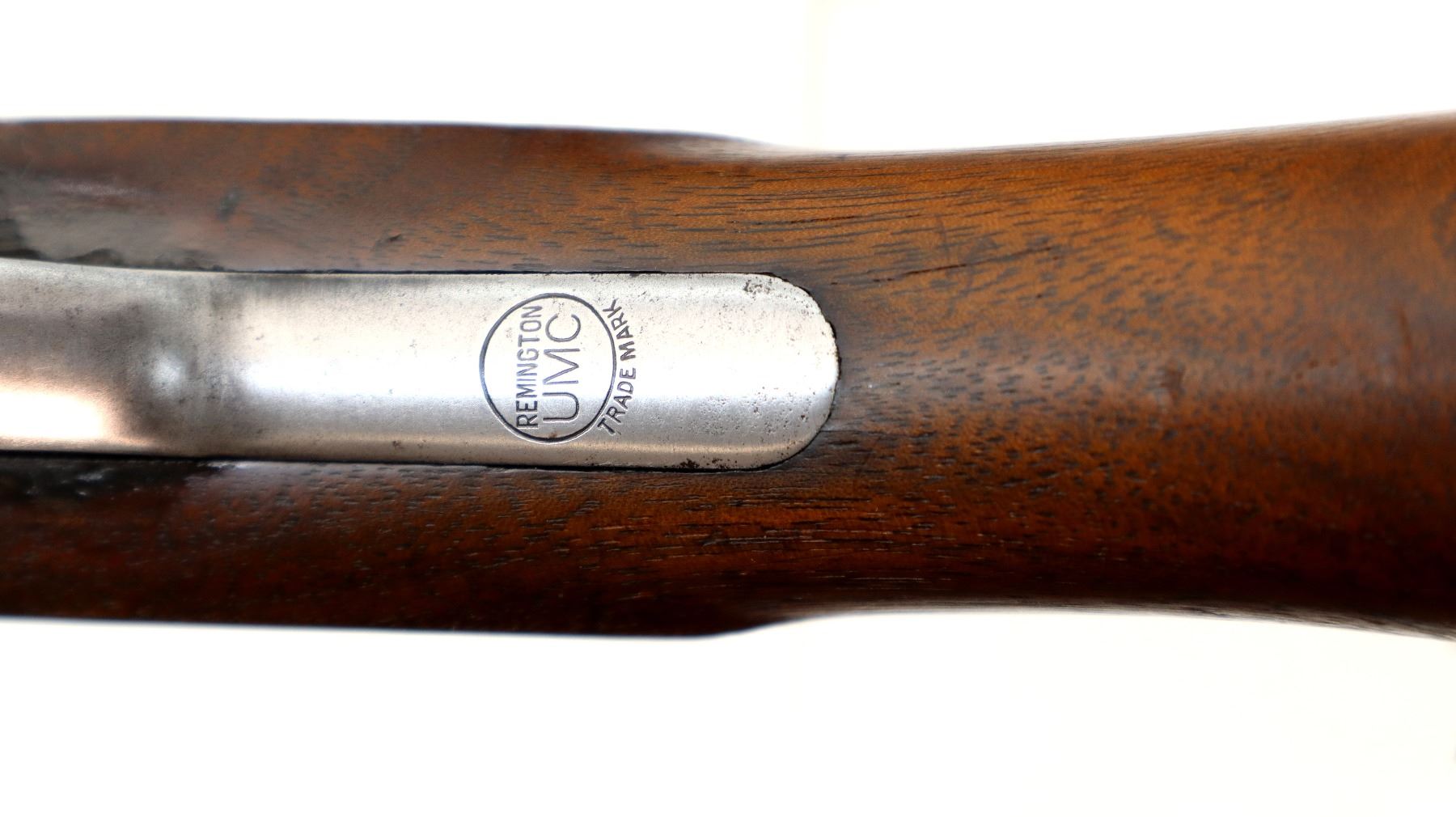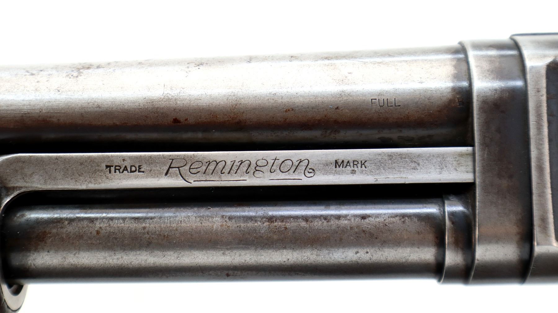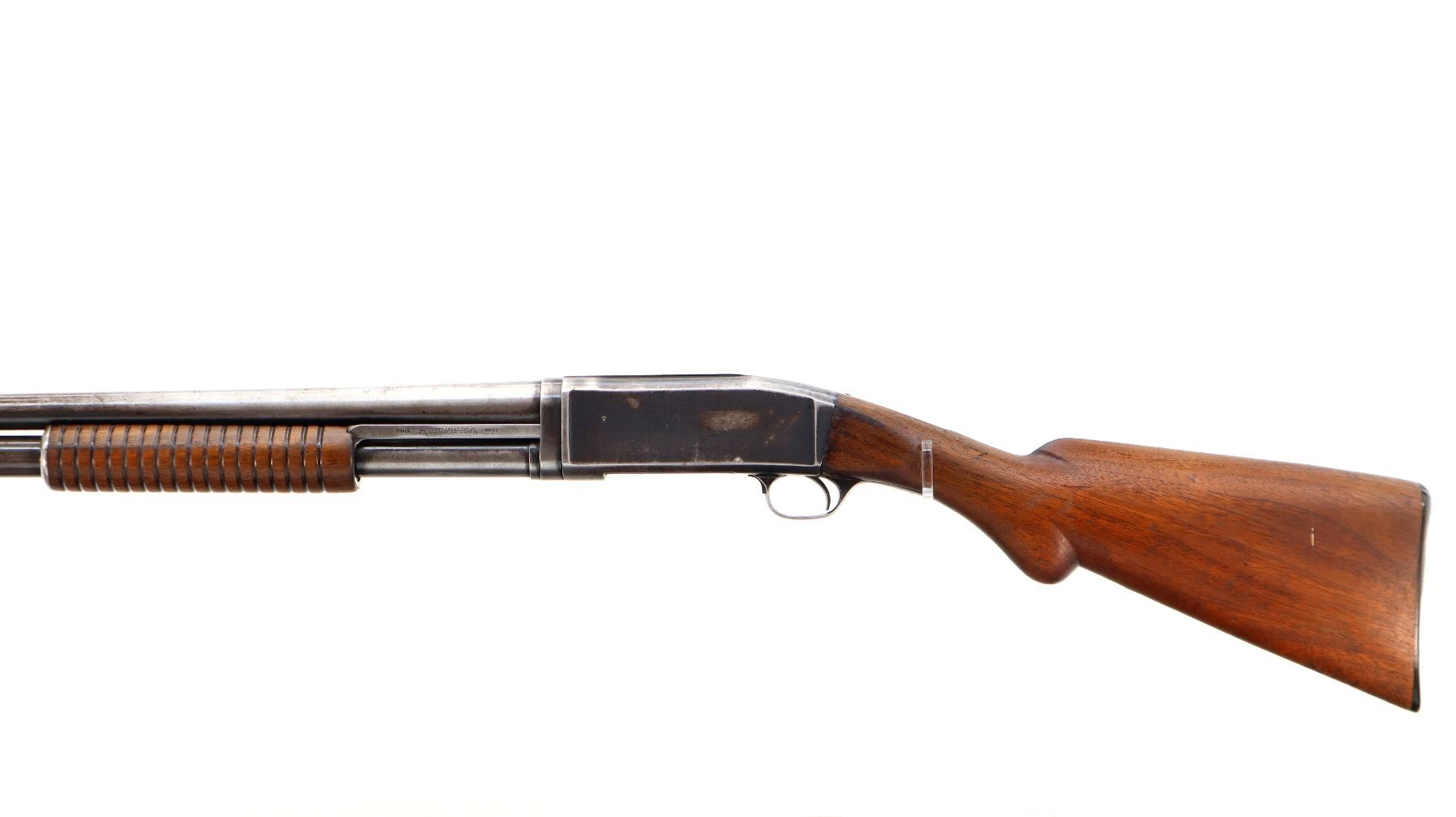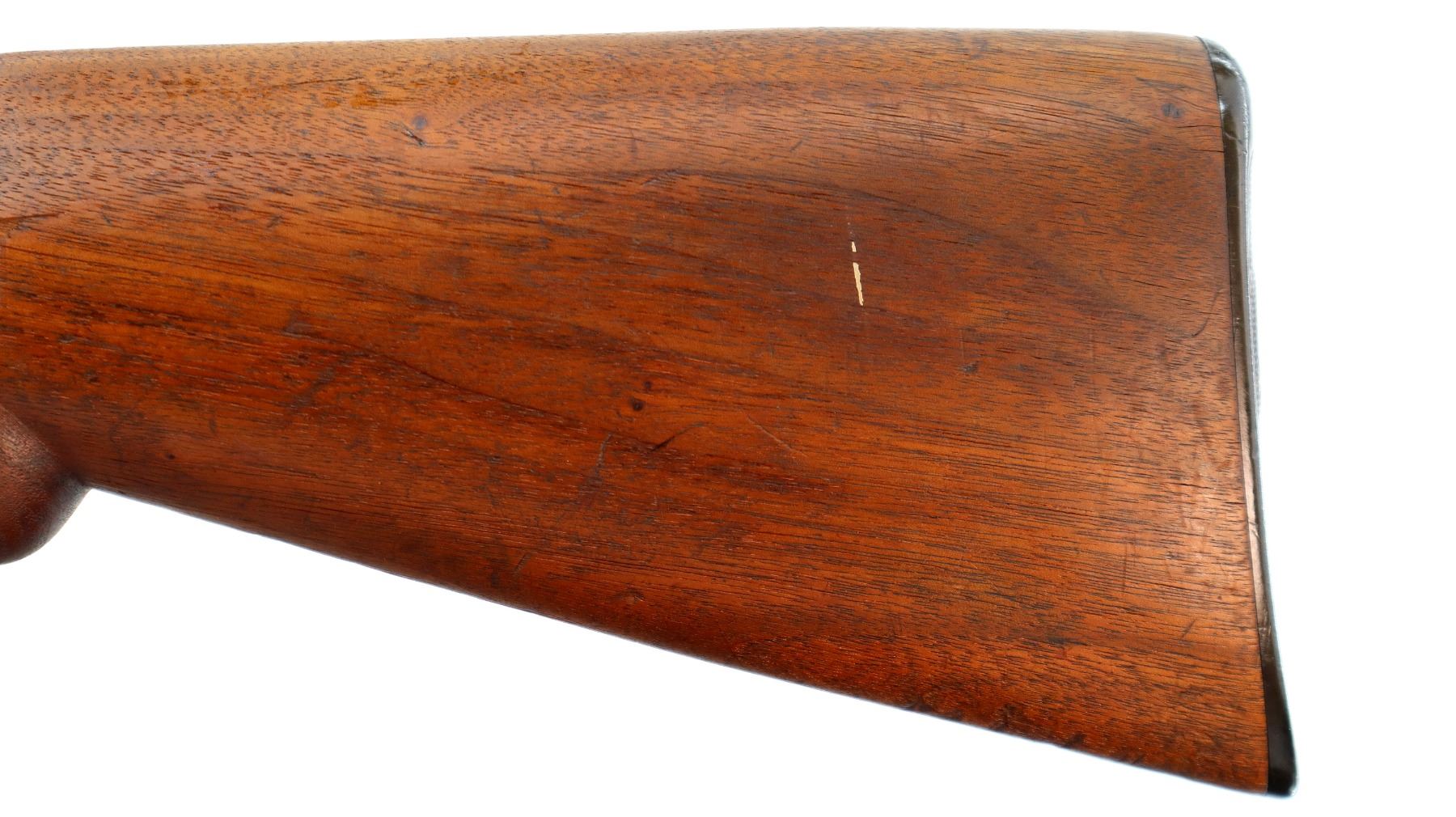 Main Description: Brass bead, shortened round barrel. Two piece wood stocks, grooved forearm, pistol grip chipped and cracked behind receiver, checkered black polymer butt plate.