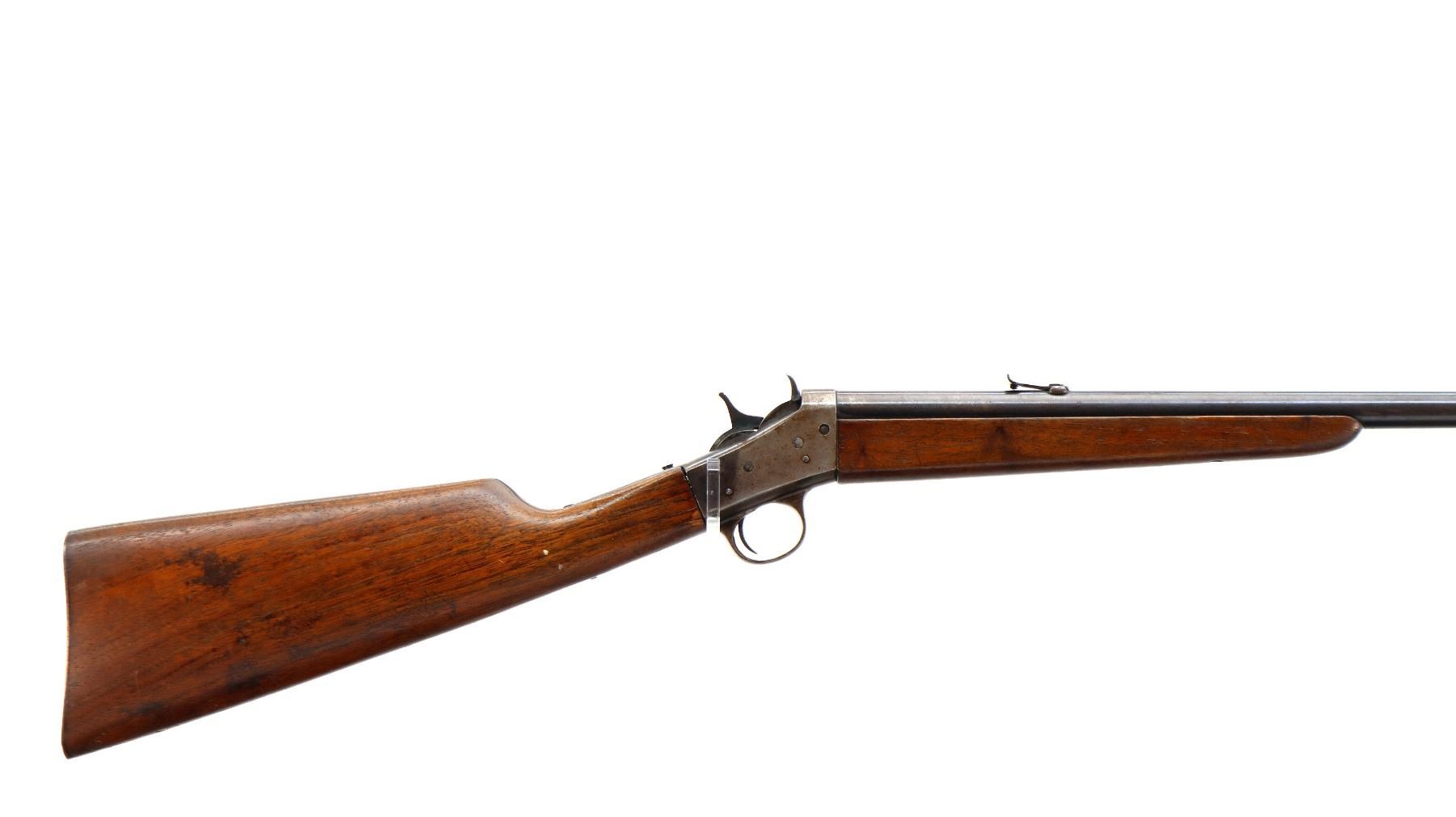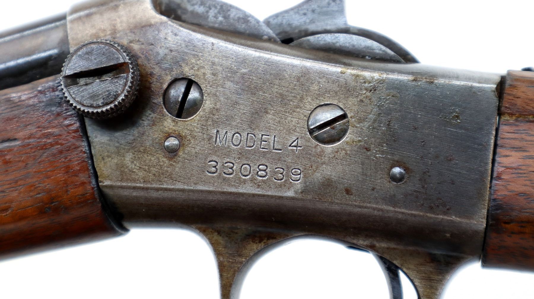Main Description: Blade front sight, adjustable u notched rear sight, blued finish, round barrel, grooved spur hammer and opening lever, extractor is present, tang may have been repaired. Two piece wood stocks, forend tip is cracked, straight grip chipped and cracked behind receiver, smooth steel butt plate.