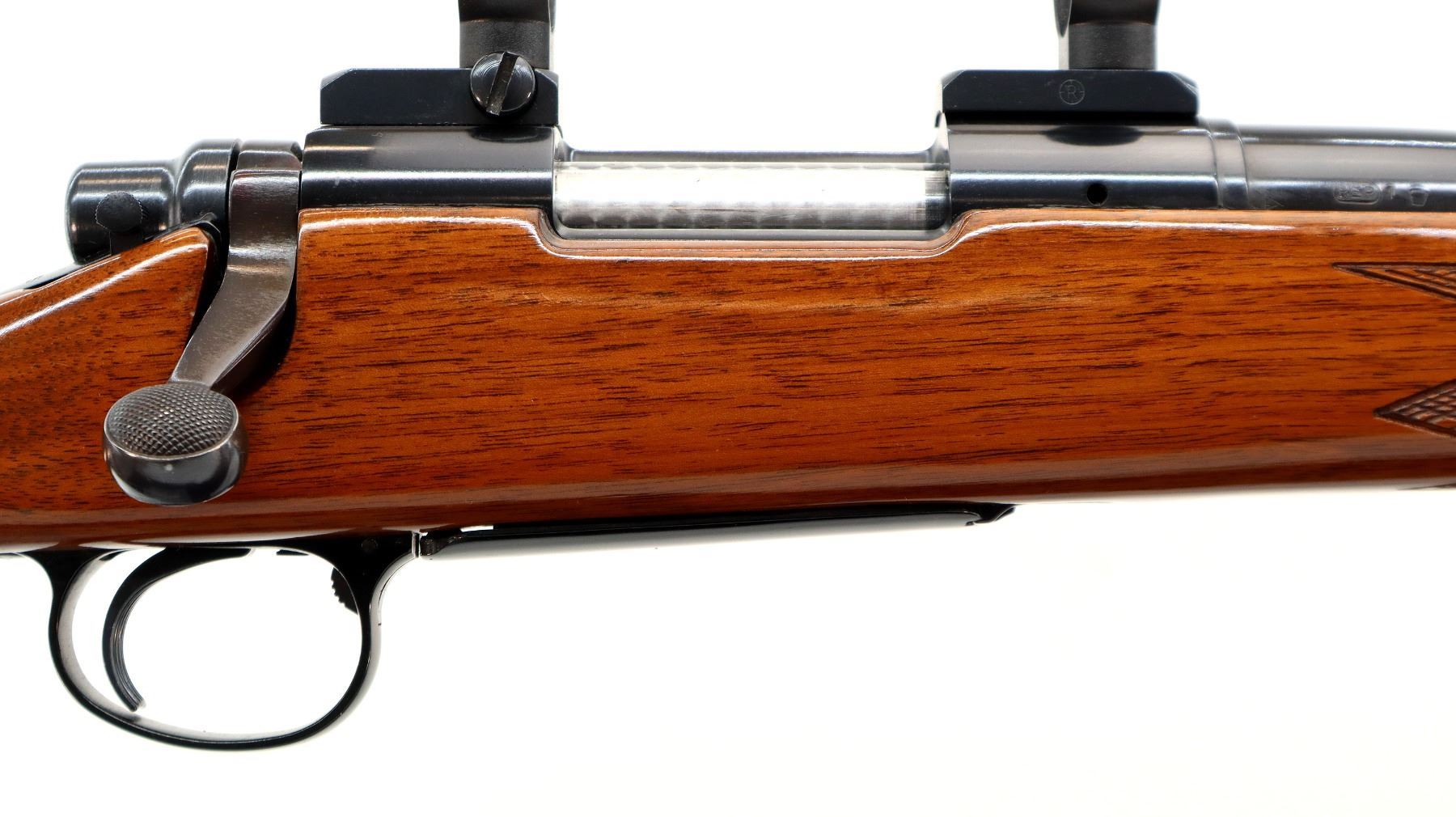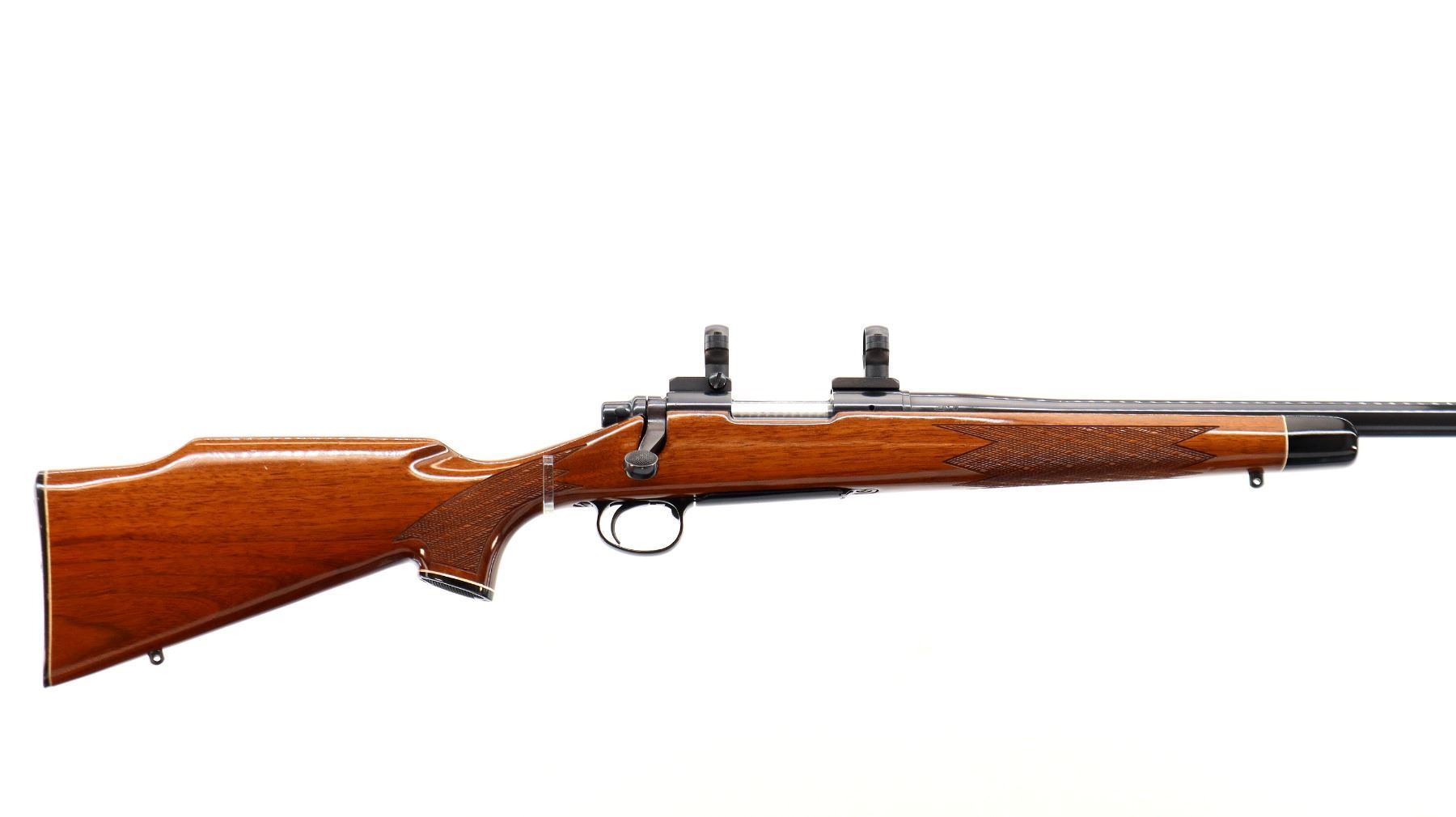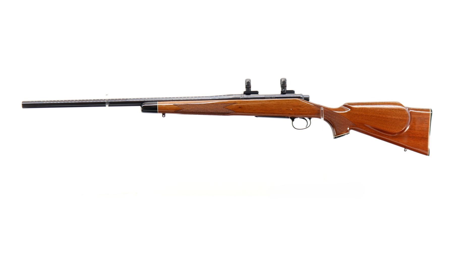 Main Description: No sights, polish blued finish, heavy barrel, receiver drilled and tapped with two piece 1" turn in rings and bases installed, jewelled bolt with checkered knob. One piece wood stock, black polymer forend and pistol grip caps, checkered forearm, pistol grip and black polymer butt plate, cheek rest, hinged floor plate, swivel studs.