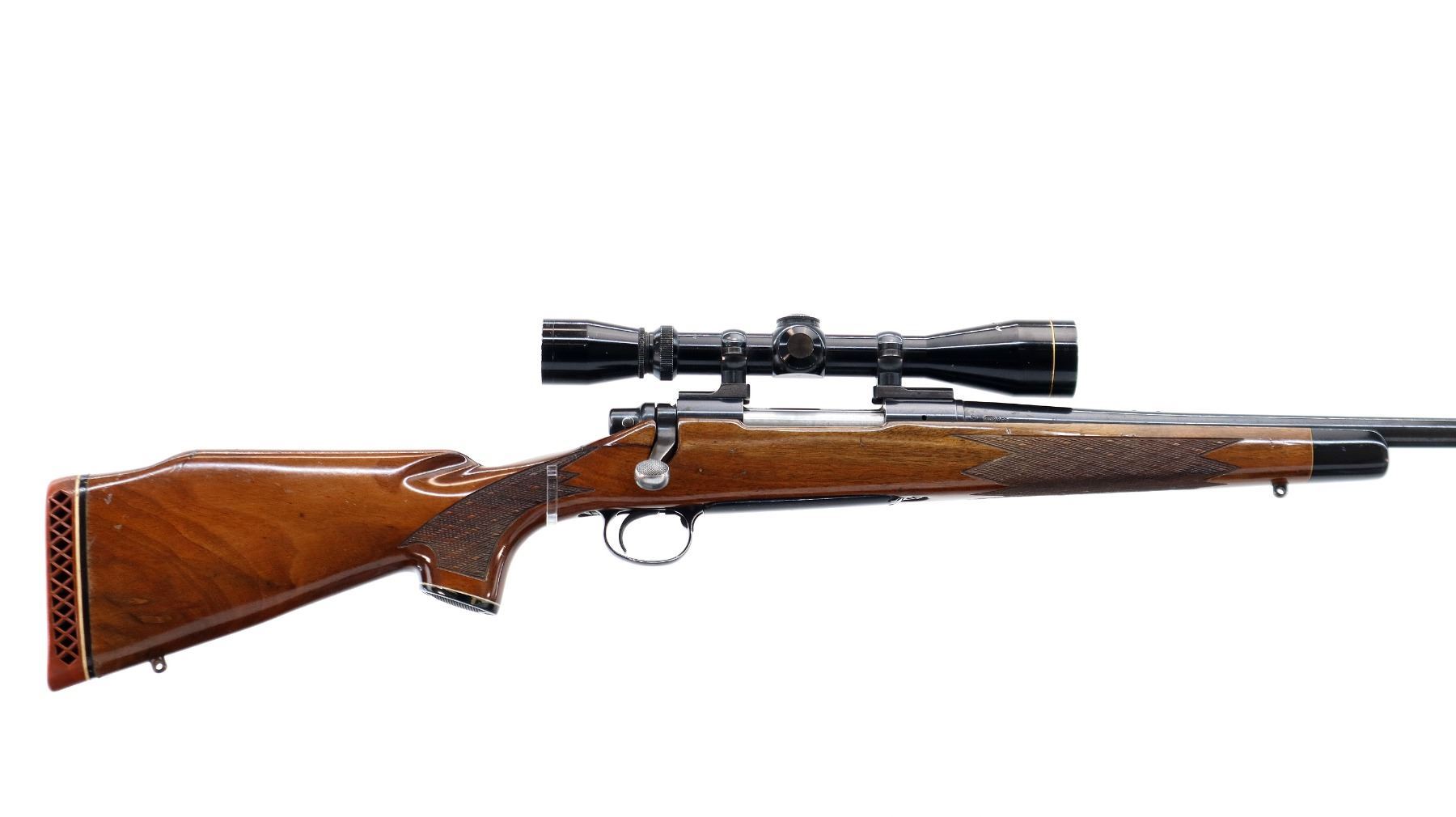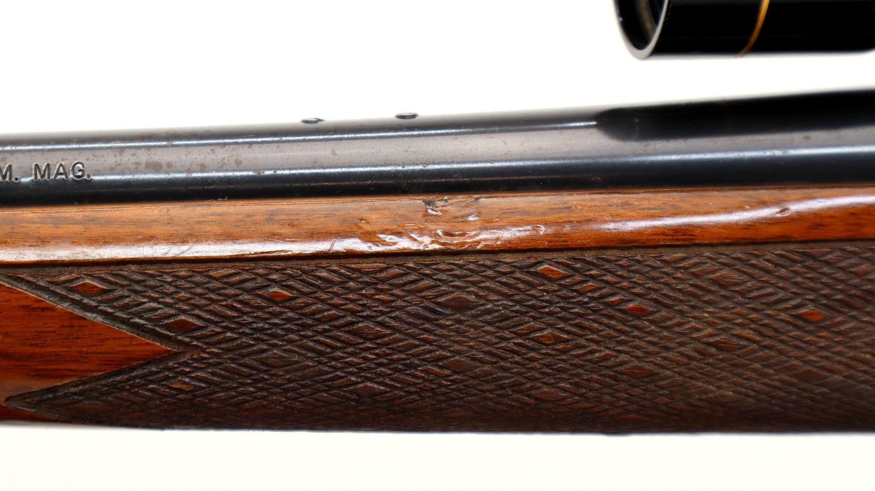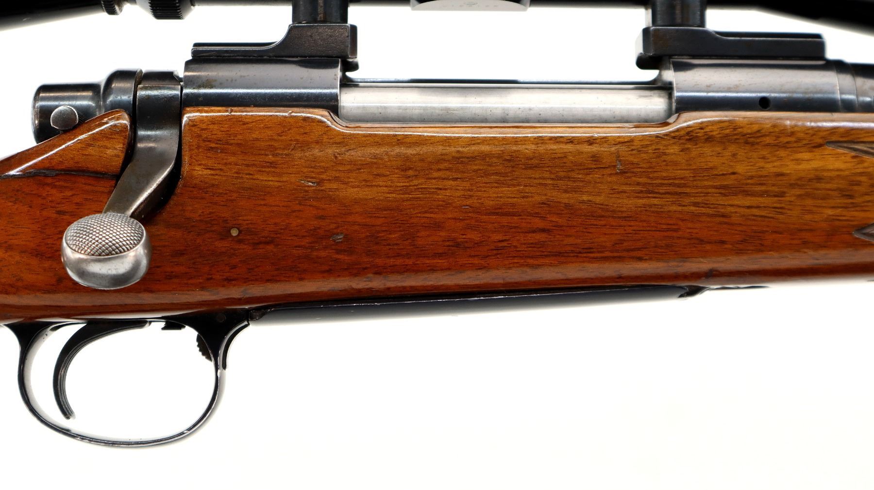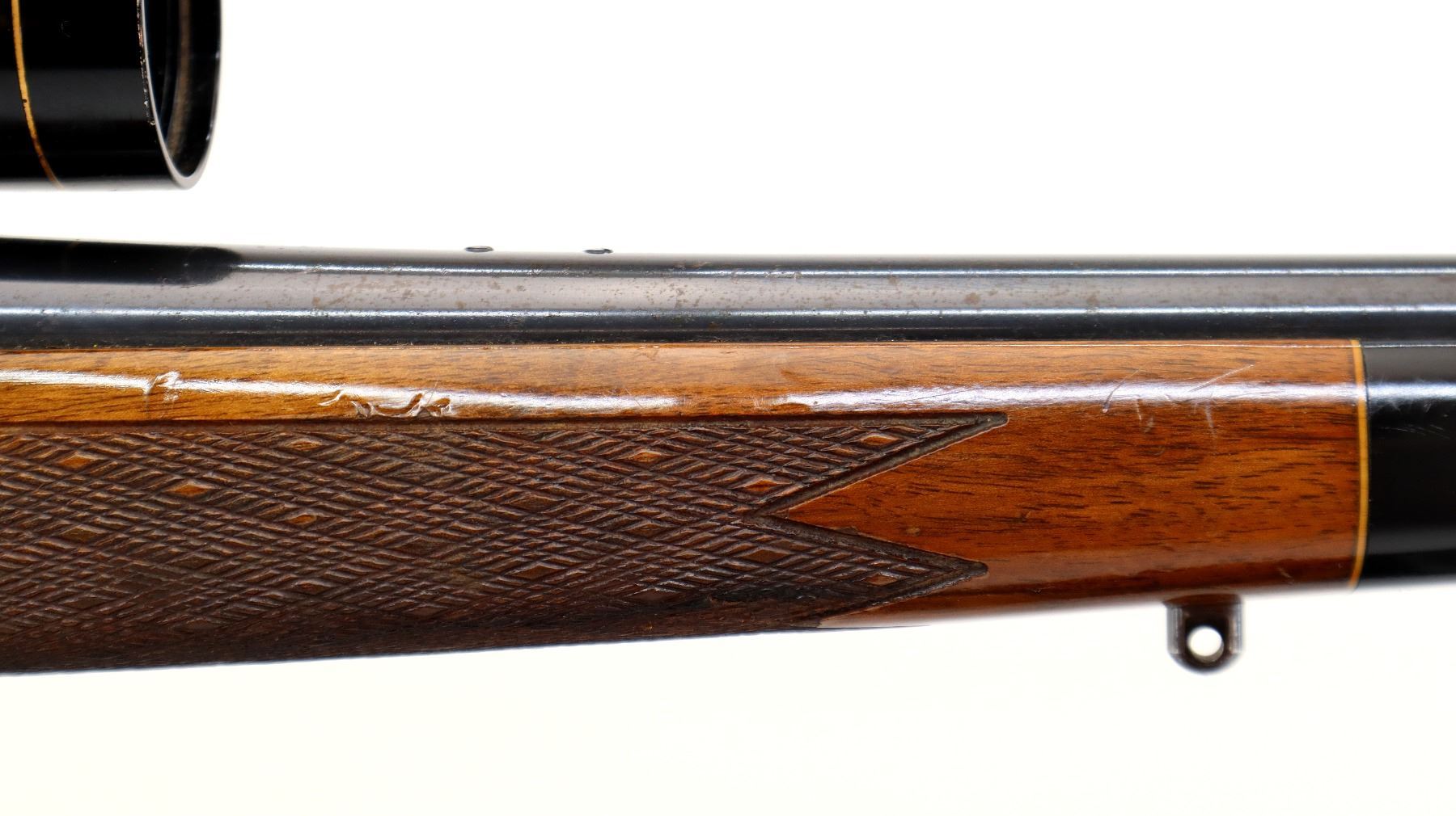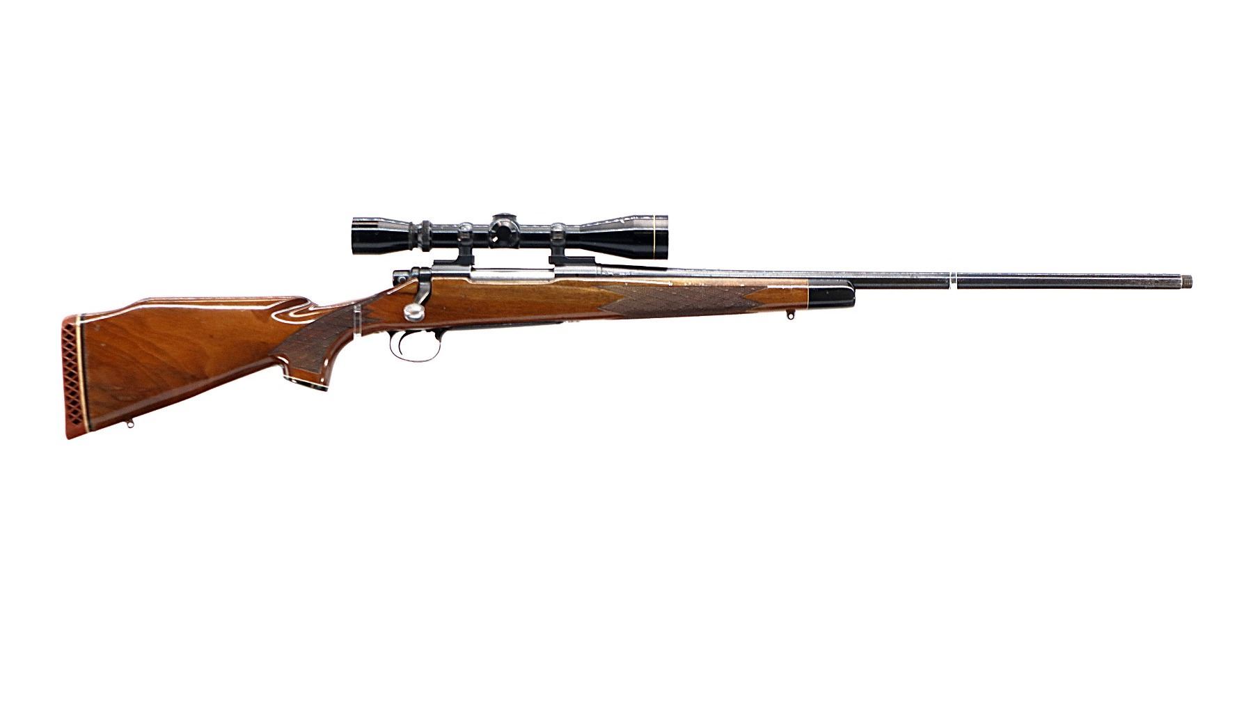 Main Description: Missing sights threaded holes filled with plug screws, blued finish, threaded muzzle with no cap, receiver drilled and tapped with Leupold VXII 3-9 scope installed, clear optics with duplex crosshair. Jewelled bolt with checkered knob. One piece wood stock, black polymer forend and pistol grip caps, checkered forearm and pistol grip cracked behind bolt handle, cheek rest, red vented rubber recoil pad, 13.25" LOP, hinged floor plate, swivel studs.