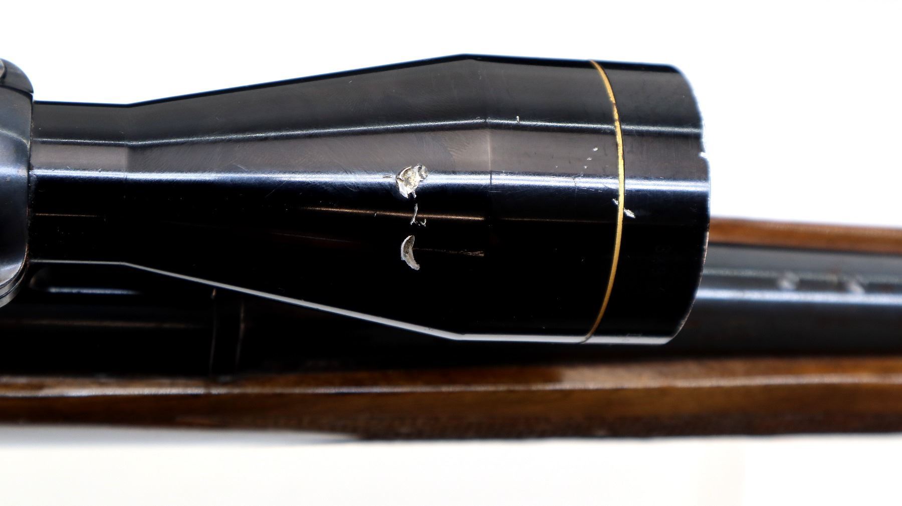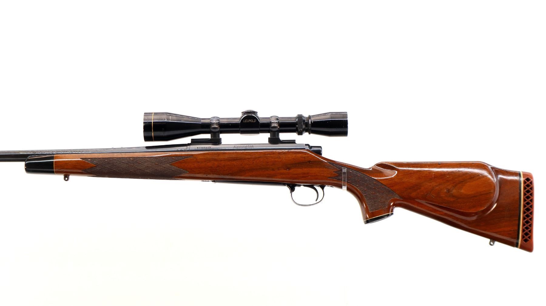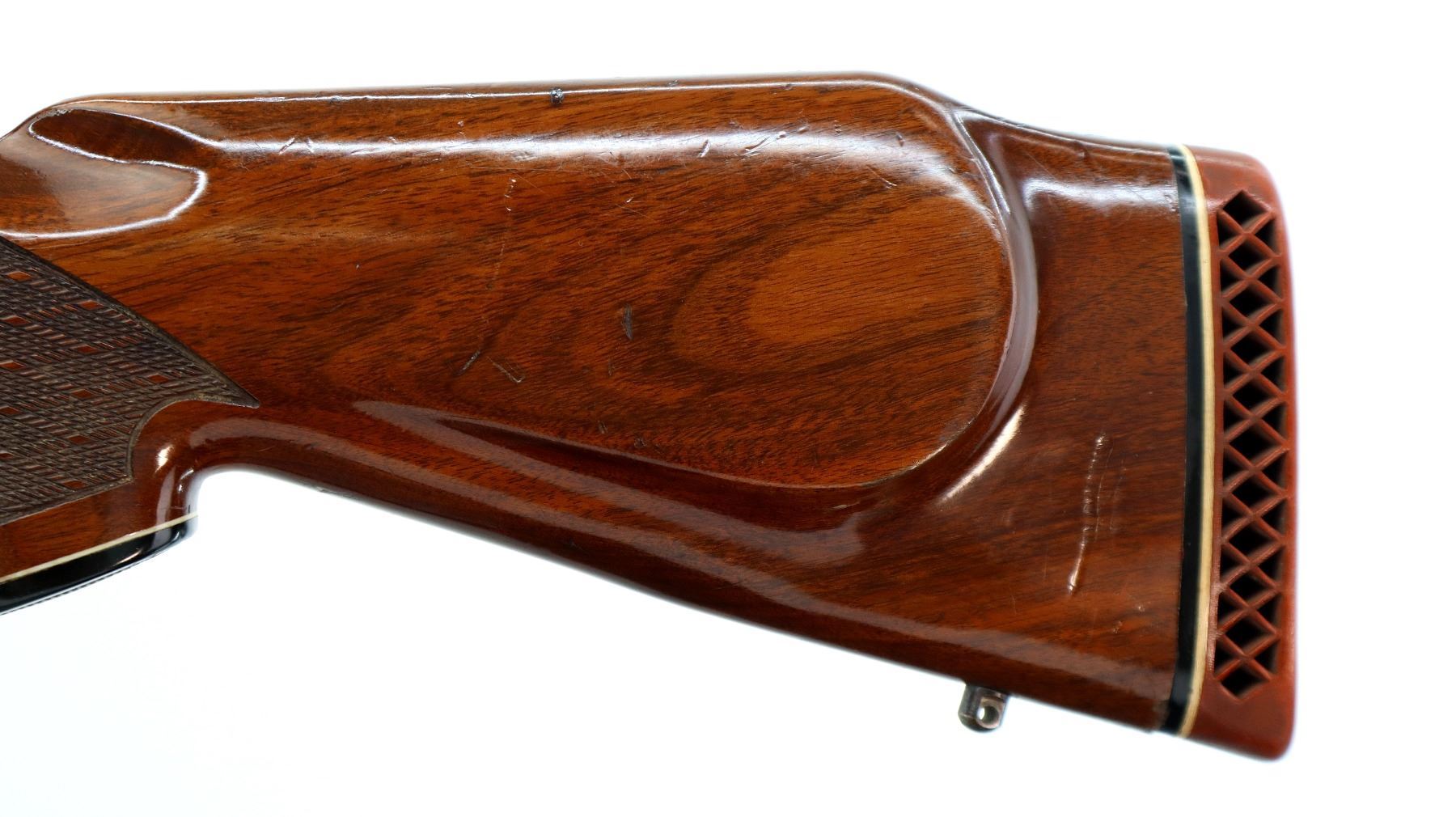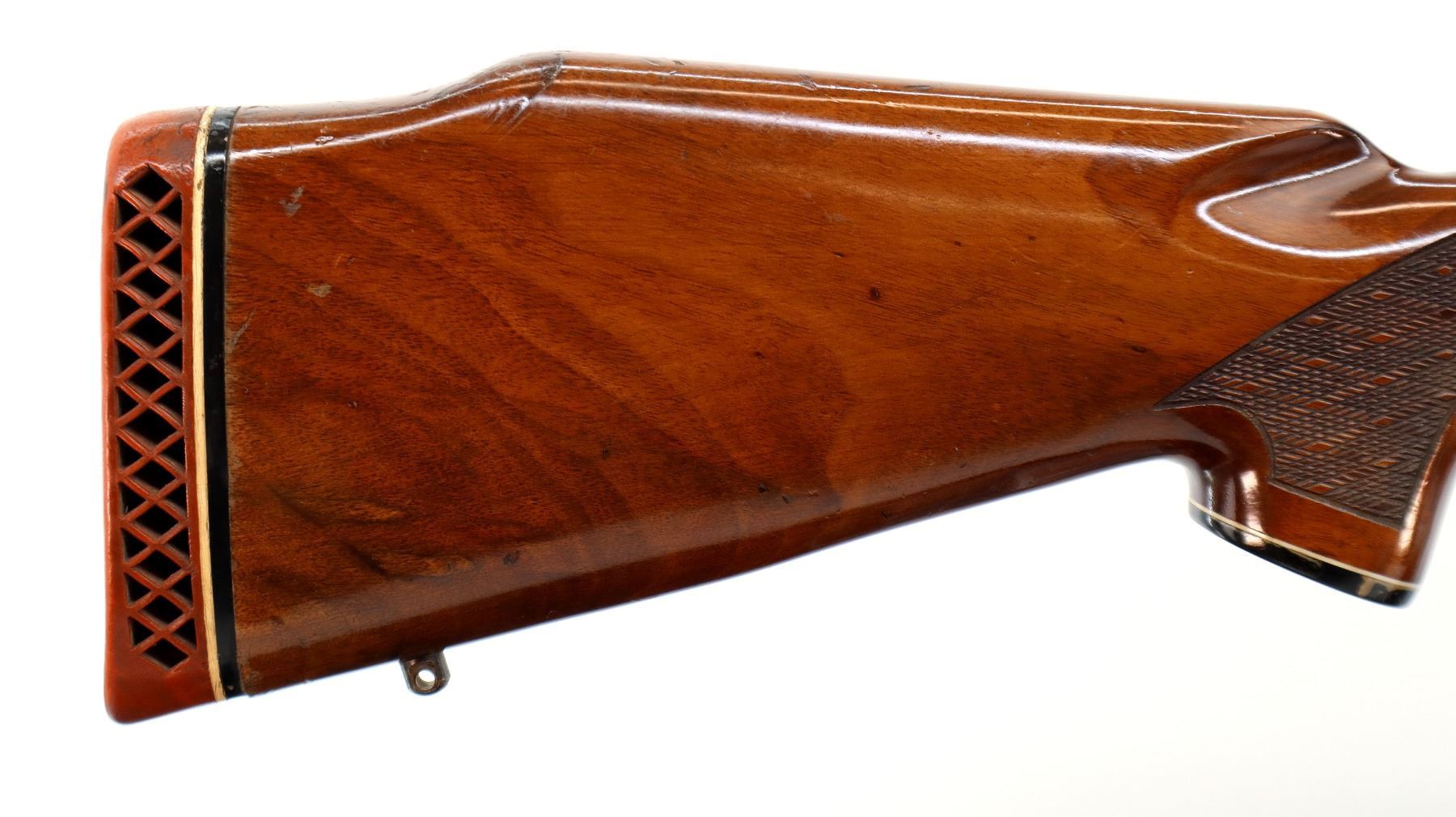 Main Description: Missing sights threaded holes filled with plug screws, blued finish, threaded muzzle with no cap, receiver drilled and tapped with Leupold VXII 3-9 scope installed, clear optics with duplex crosshair. Jewelled bolt with checkered knob. One piece wood stock, black polymer forend and pistol grip caps, checkered forearm and pistol grip cracked behind bolt handle, cheek rest, red vented rubber recoil pad, 13.25" LOP, hinged floor plate, swivel studs.