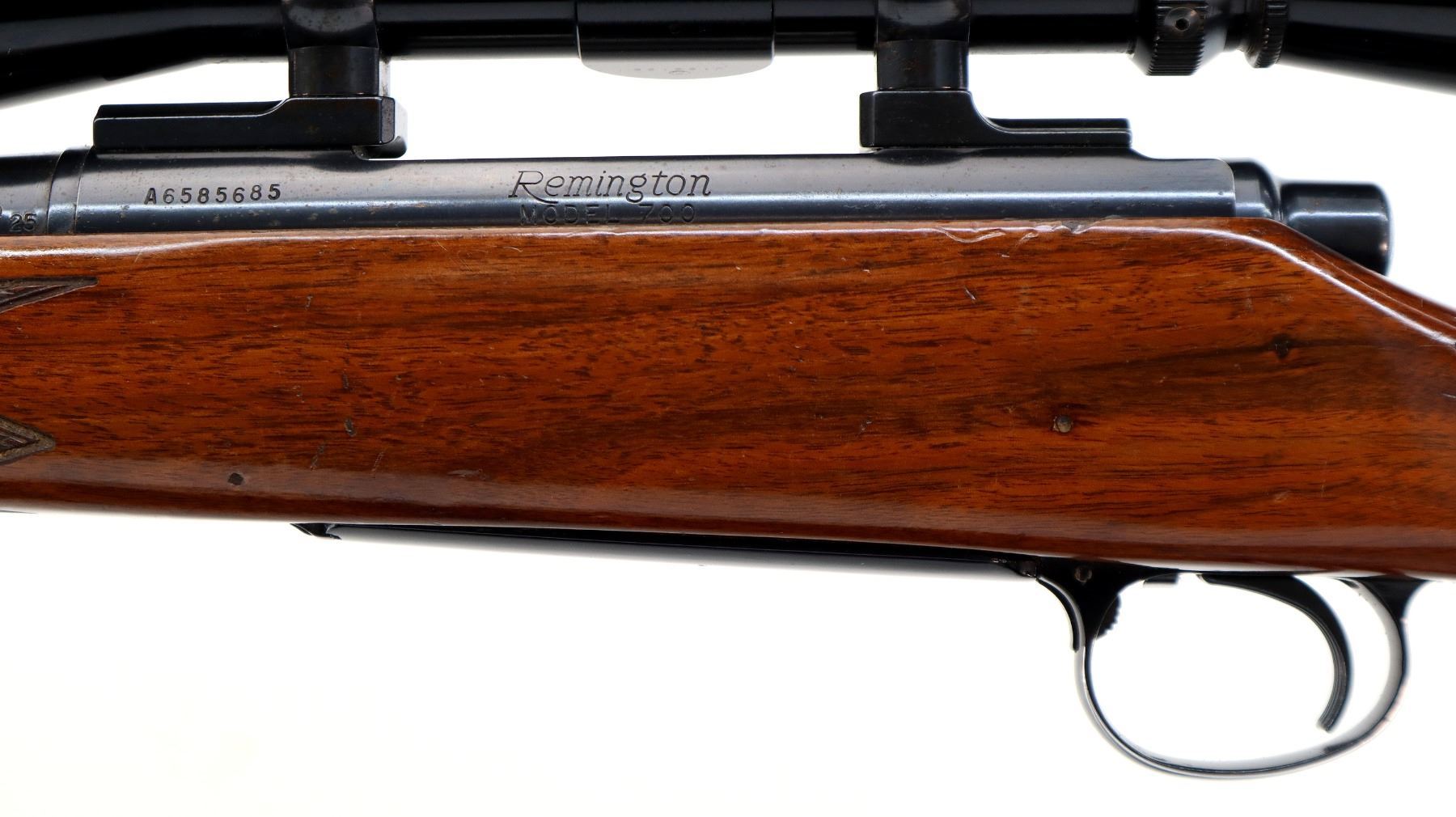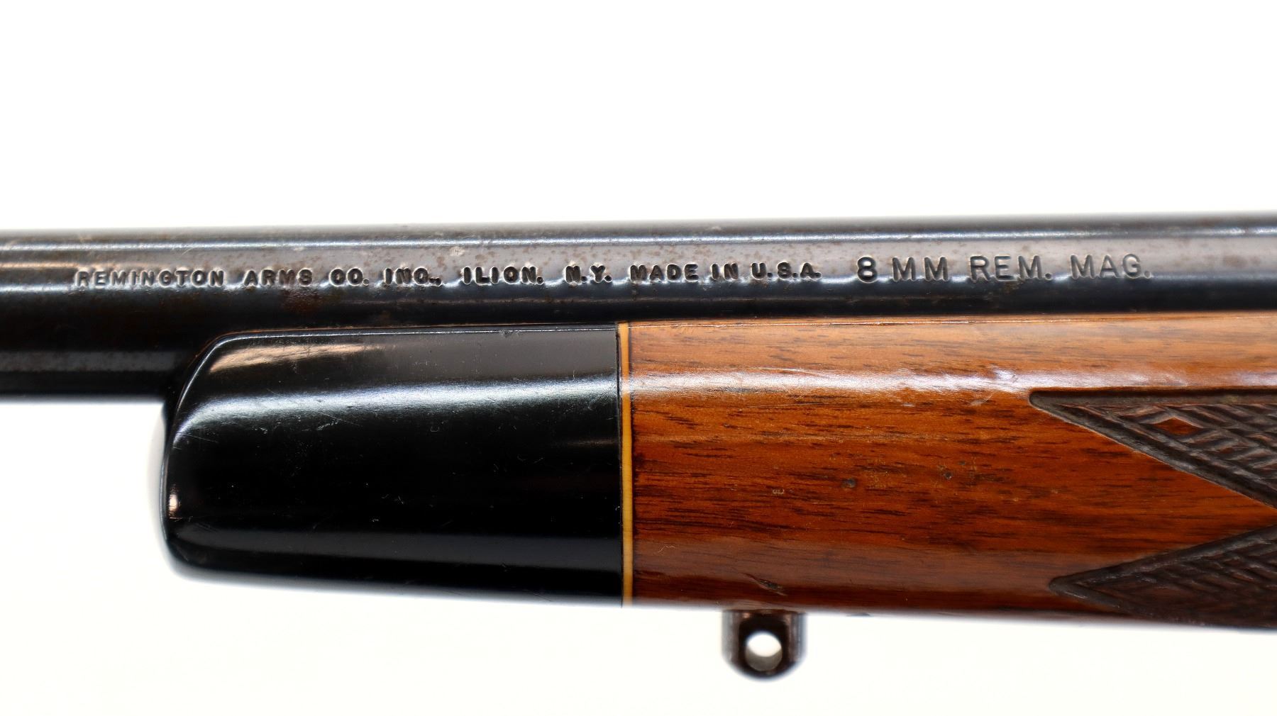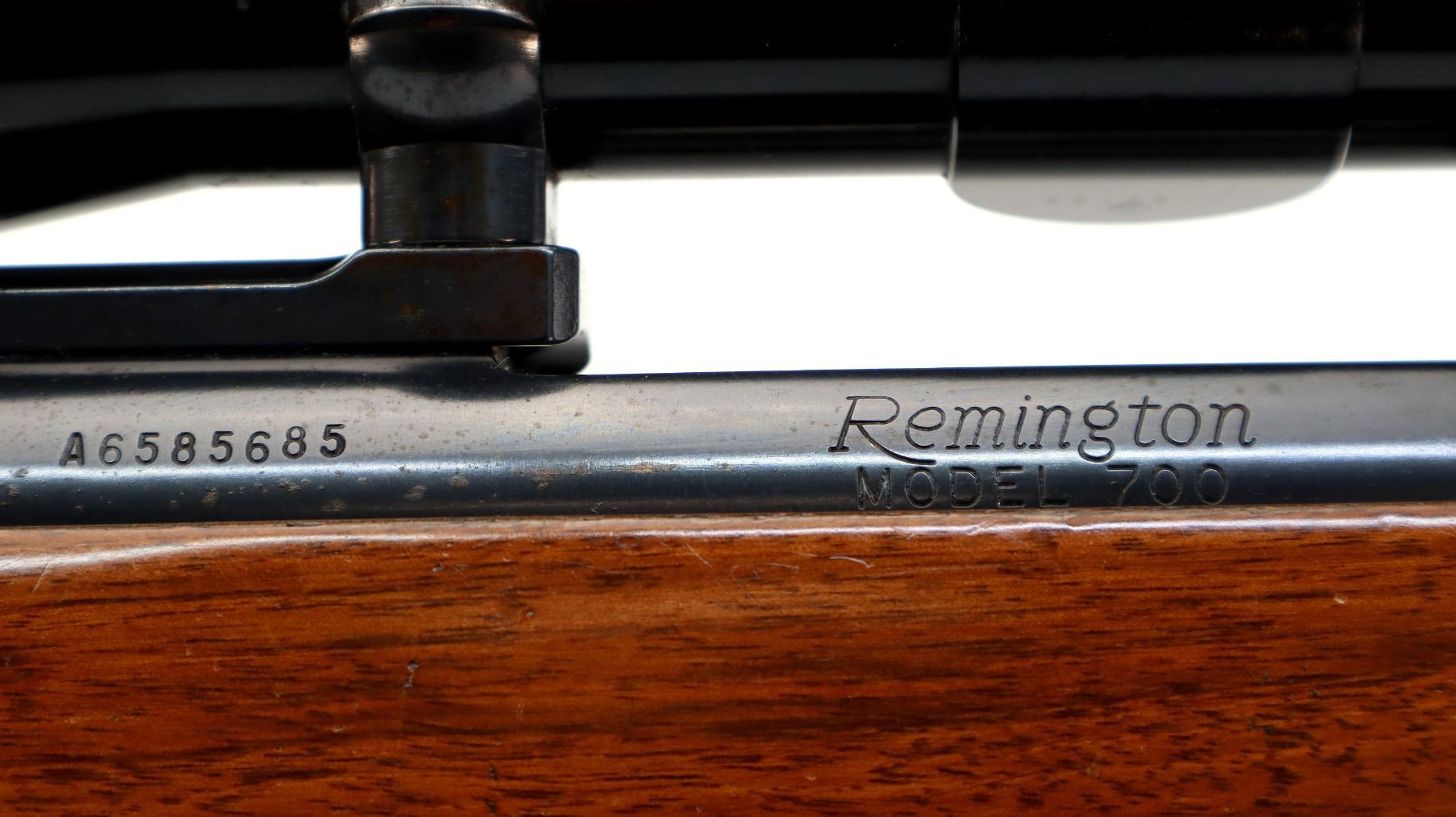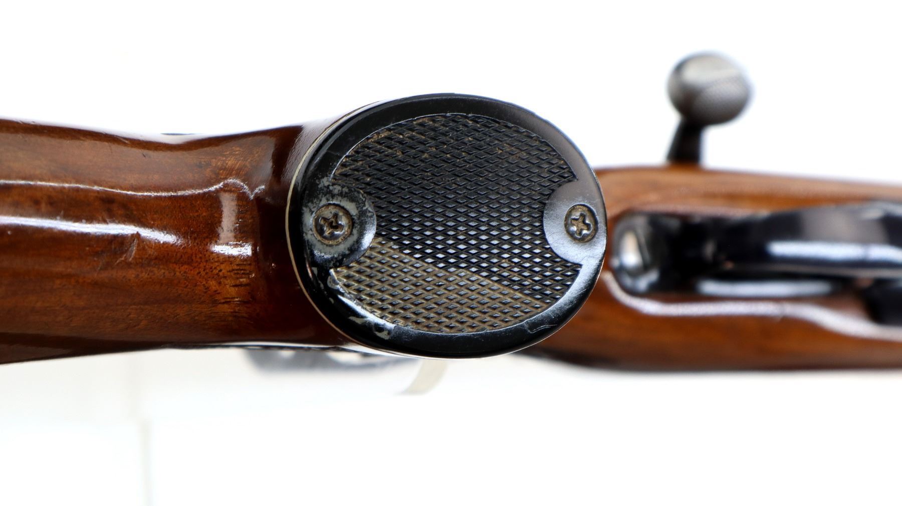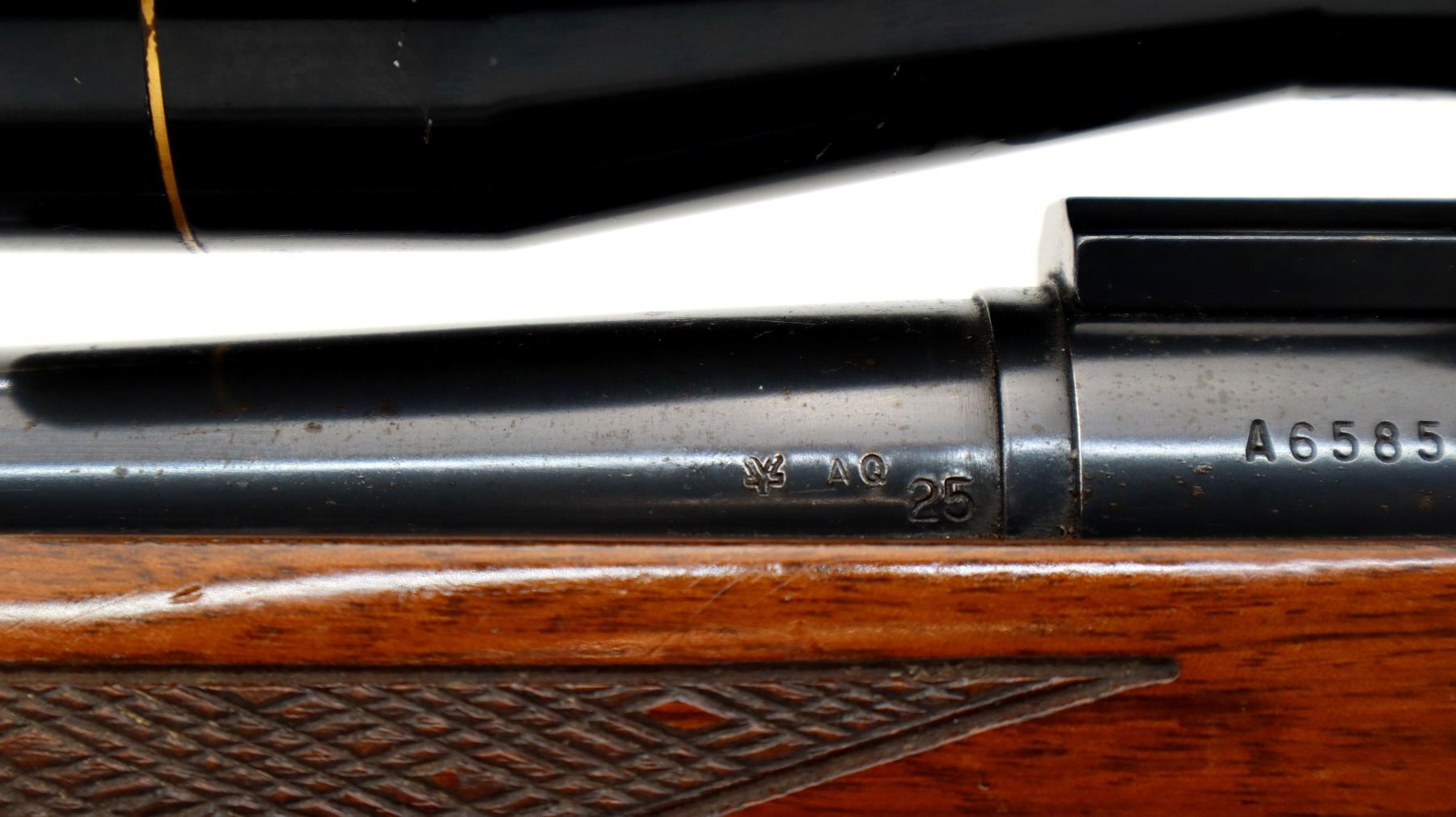 Main Description: Missing sights threaded holes filled with plug screws, blued finish, threaded muzzle with no cap, receiver drilled and tapped with Leupold VXII 3-9 scope installed, clear optics with duplex crosshair. Jewelled bolt with checkered knob. One piece wood stock, black polymer forend and pistol grip caps, checkered forearm and pistol grip cracked behind bolt handle, cheek rest, red vented rubber recoil pad, 13.25" LOP, hinged floor plate, swivel studs.