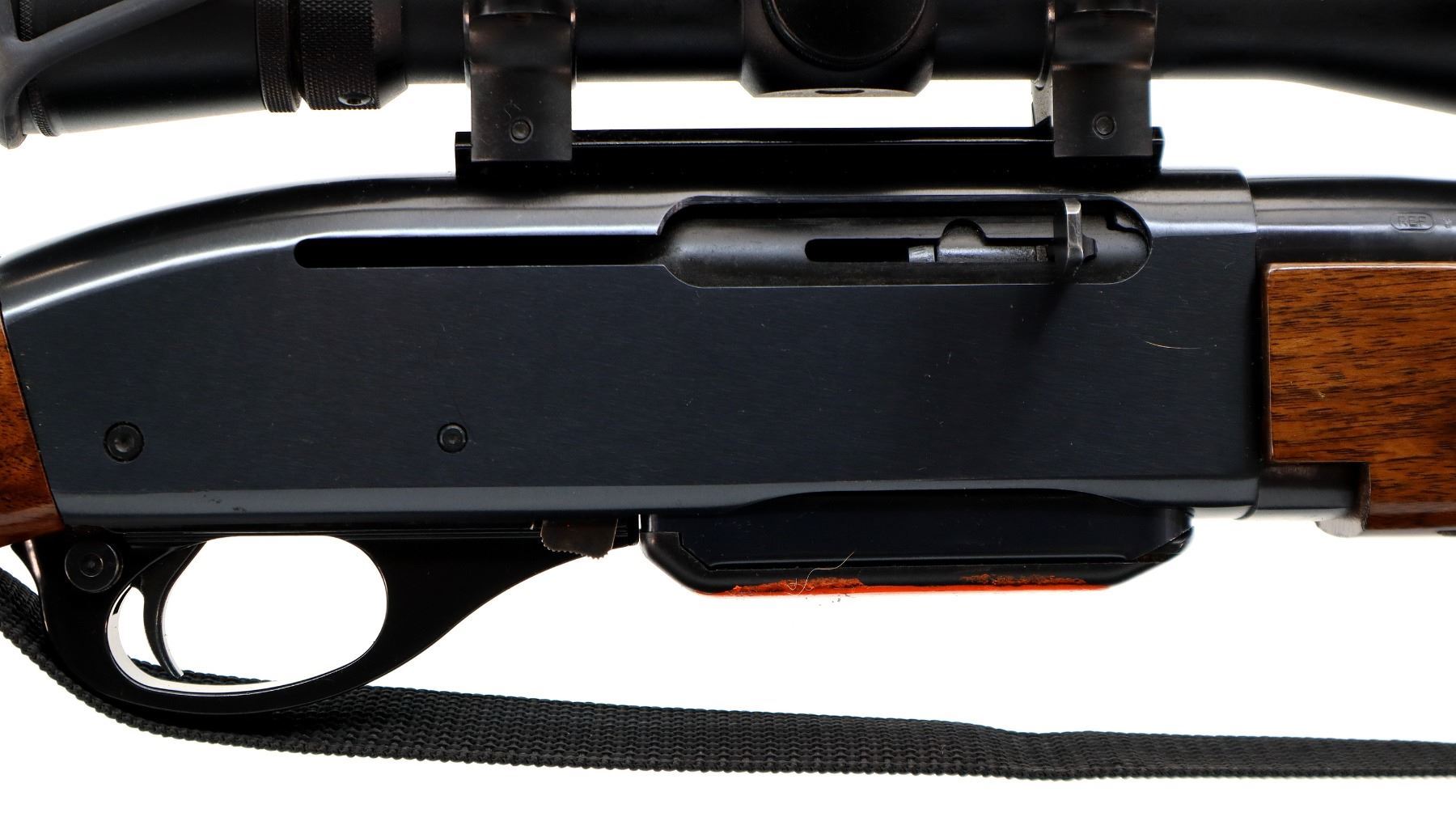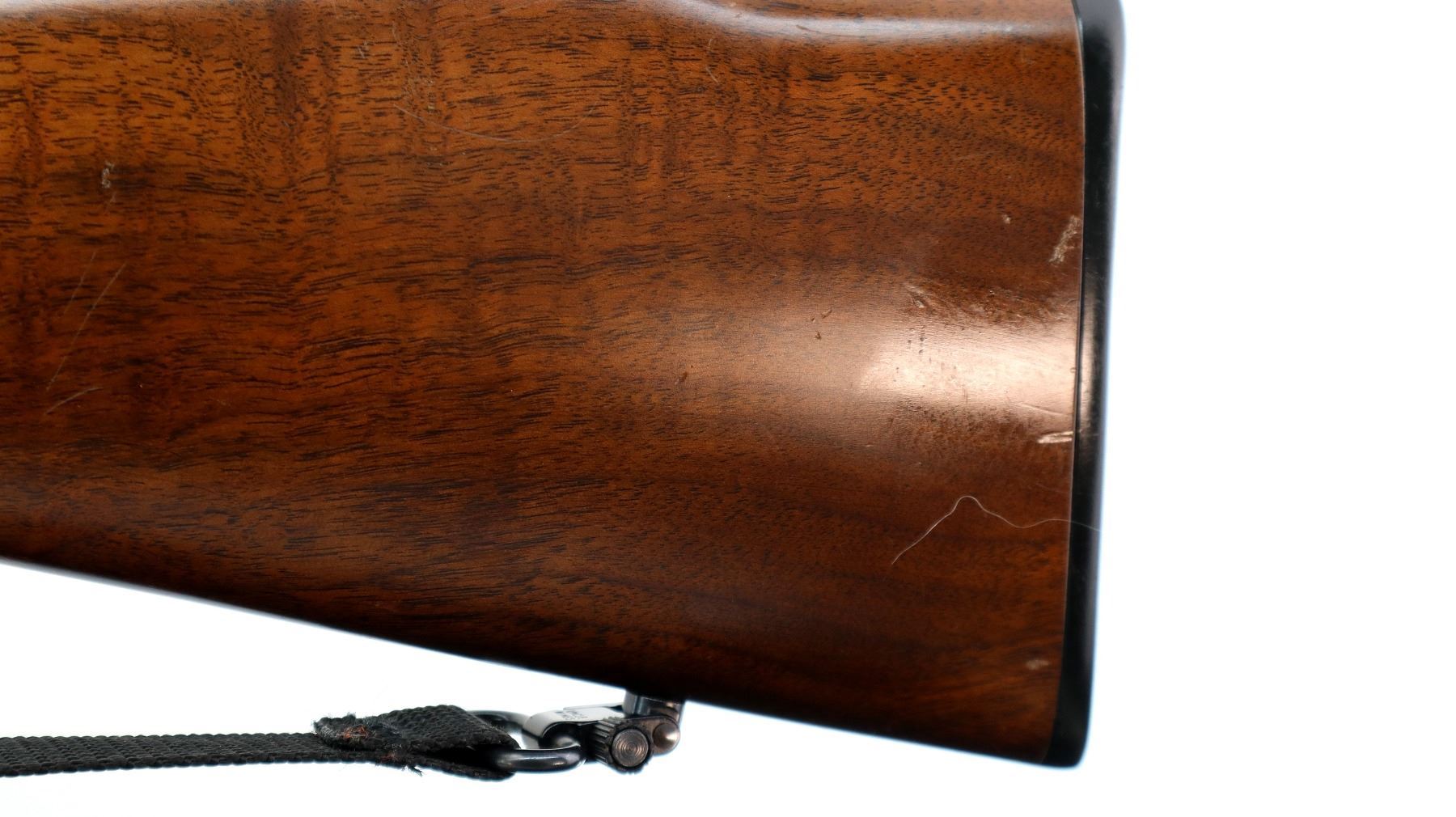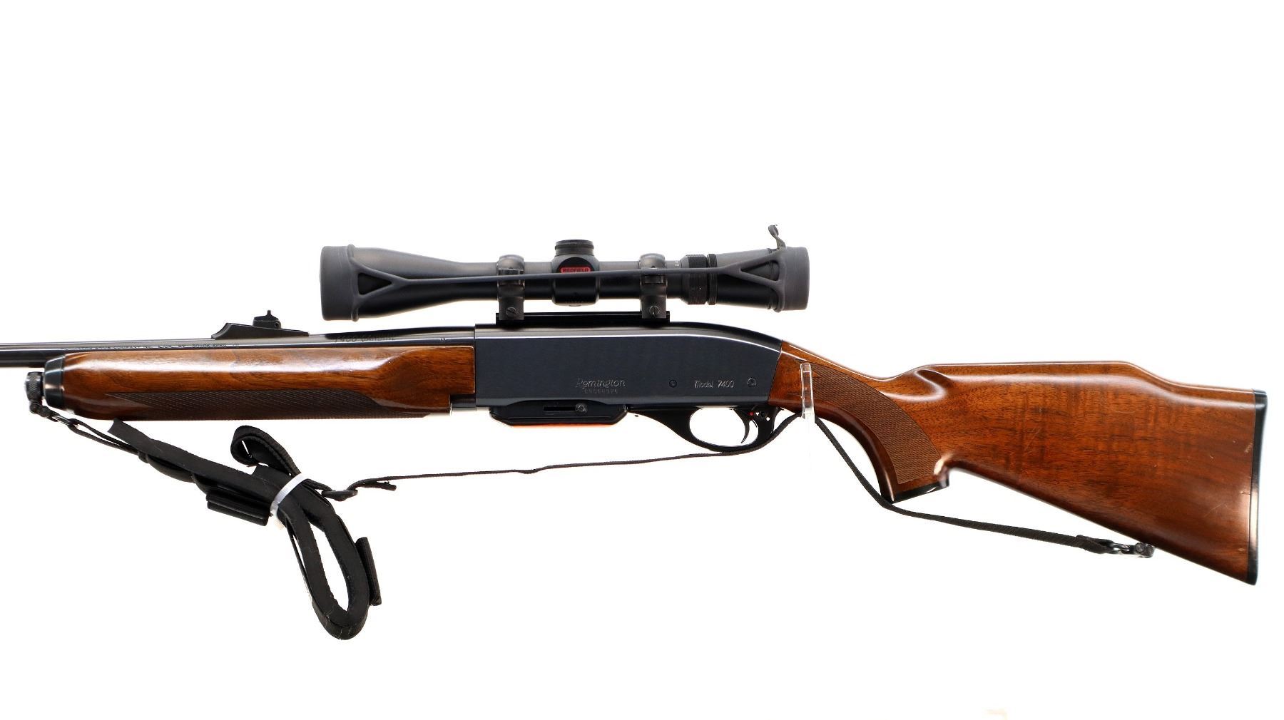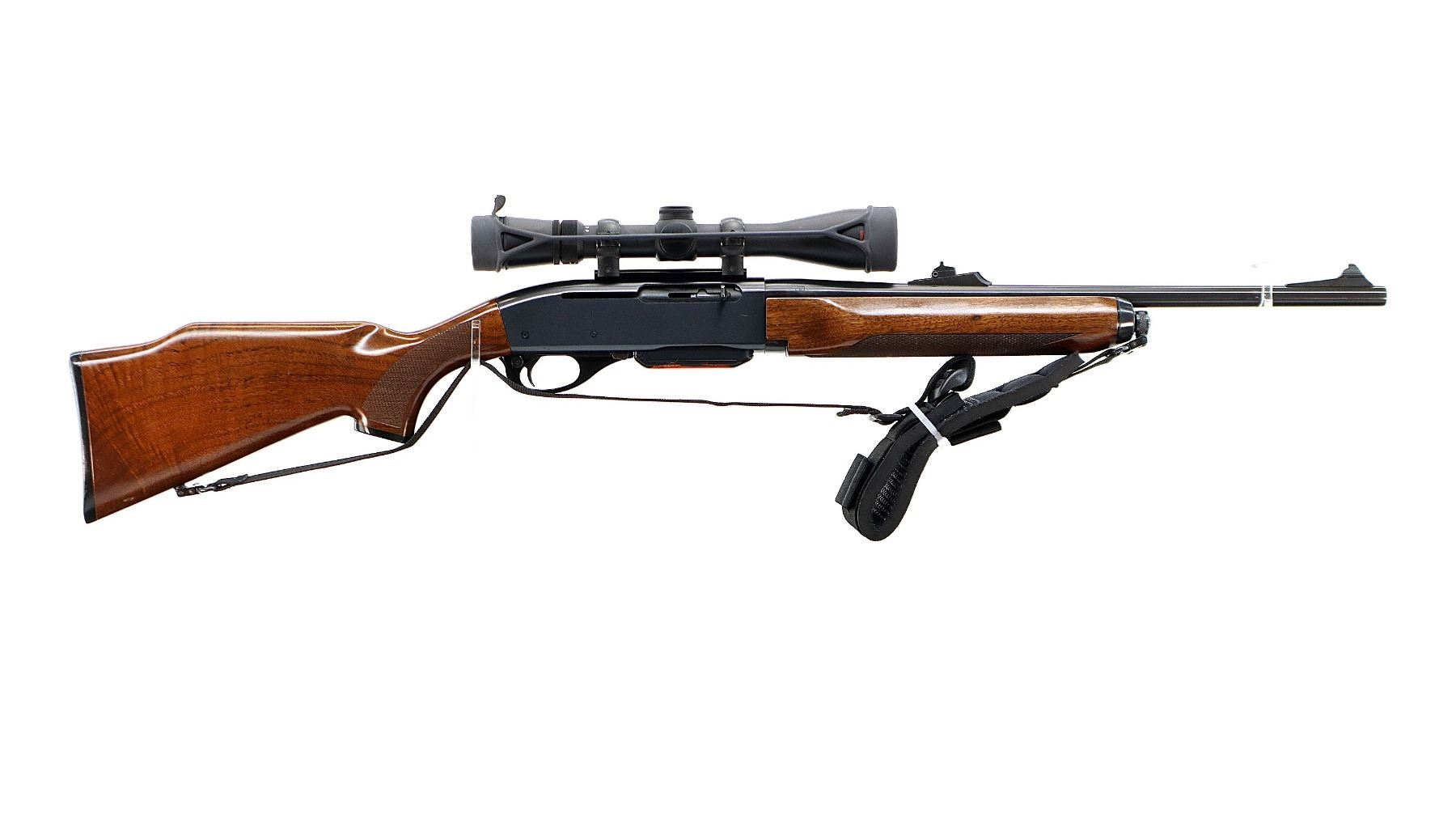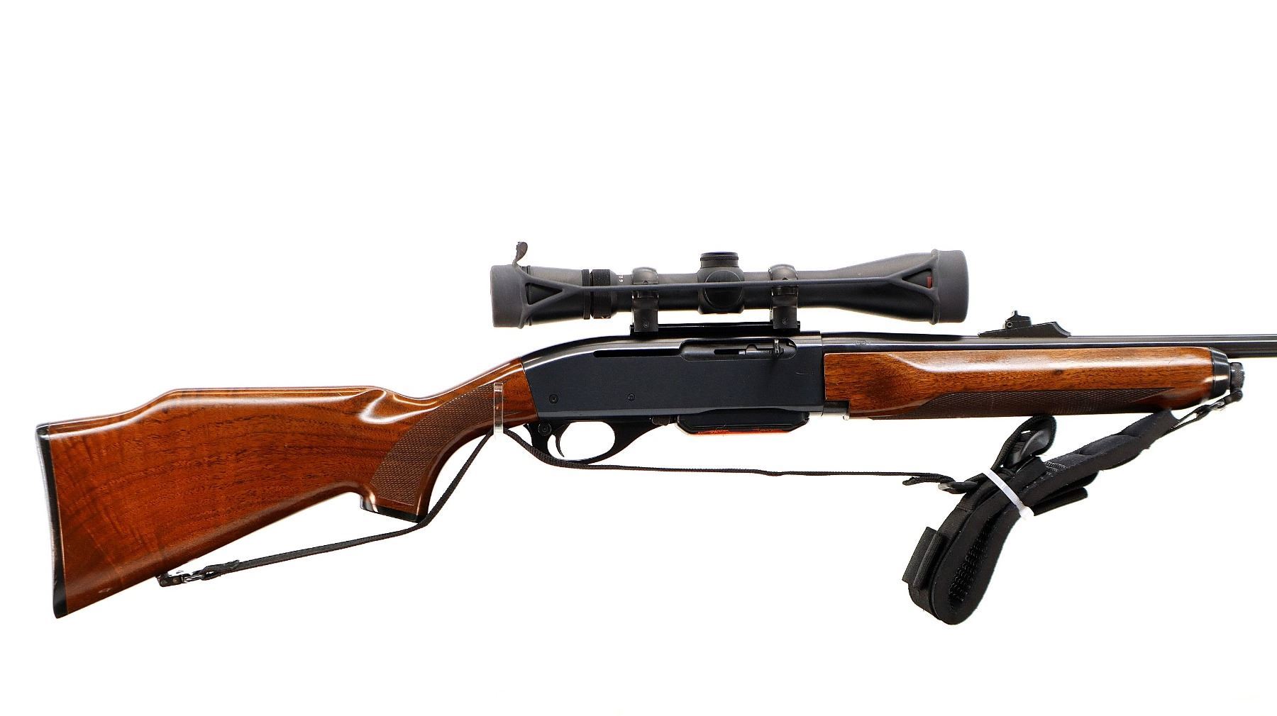 Main Description: Blade front sight with ramp, adjustable u notched rear sight with ramp, blued finish, receiver drilled and tapped with Redfield 3-9x40 scope installed, clear optics with duplex reticle with circle. Two piece wood stocks, checkered forearm cracked on left side, checkered pistol grip and black polymer butt plate, raised comb, grip cap, sling swivels with black nylon sling.