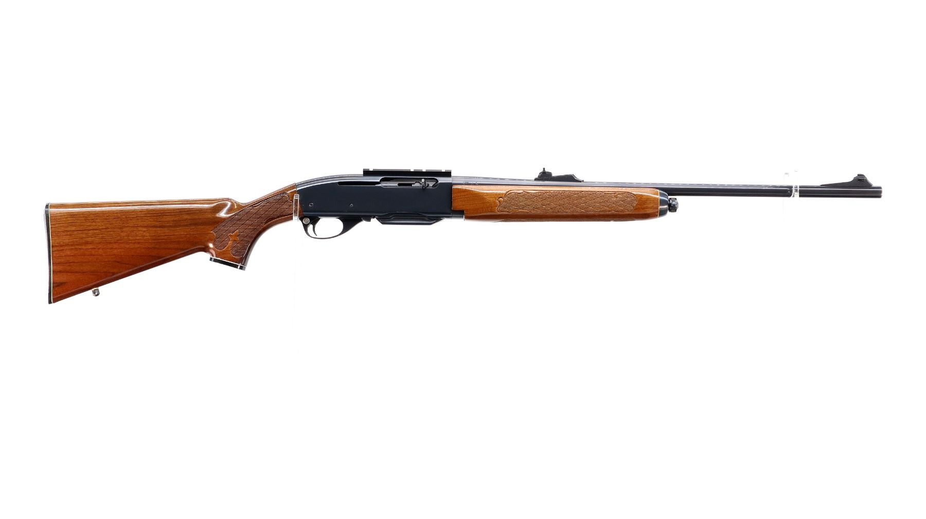 Main Description: Blade front sight with ramp, adjustable u notched rear sight with ramp, blued finish, receiver drilled and tapped with one piece scope base installed. Two piece wood stocks, checkered forearm and pistol grip, checkered black polymer butt plate, grip cap, swivel studs.