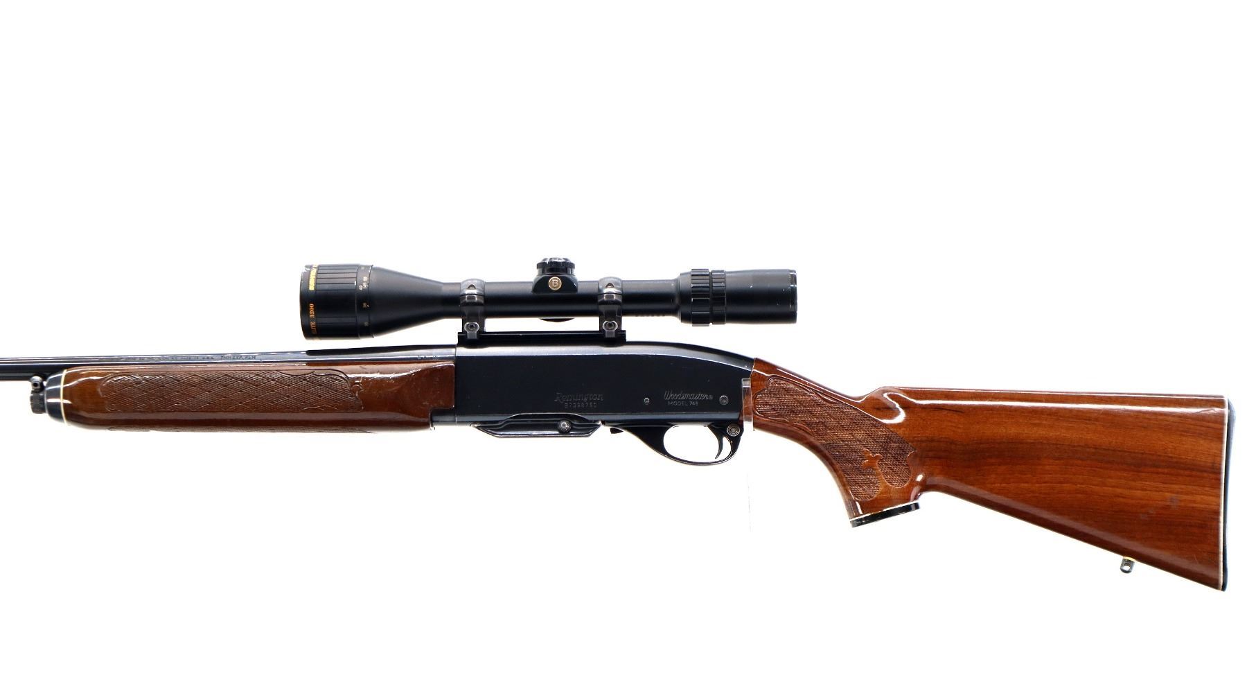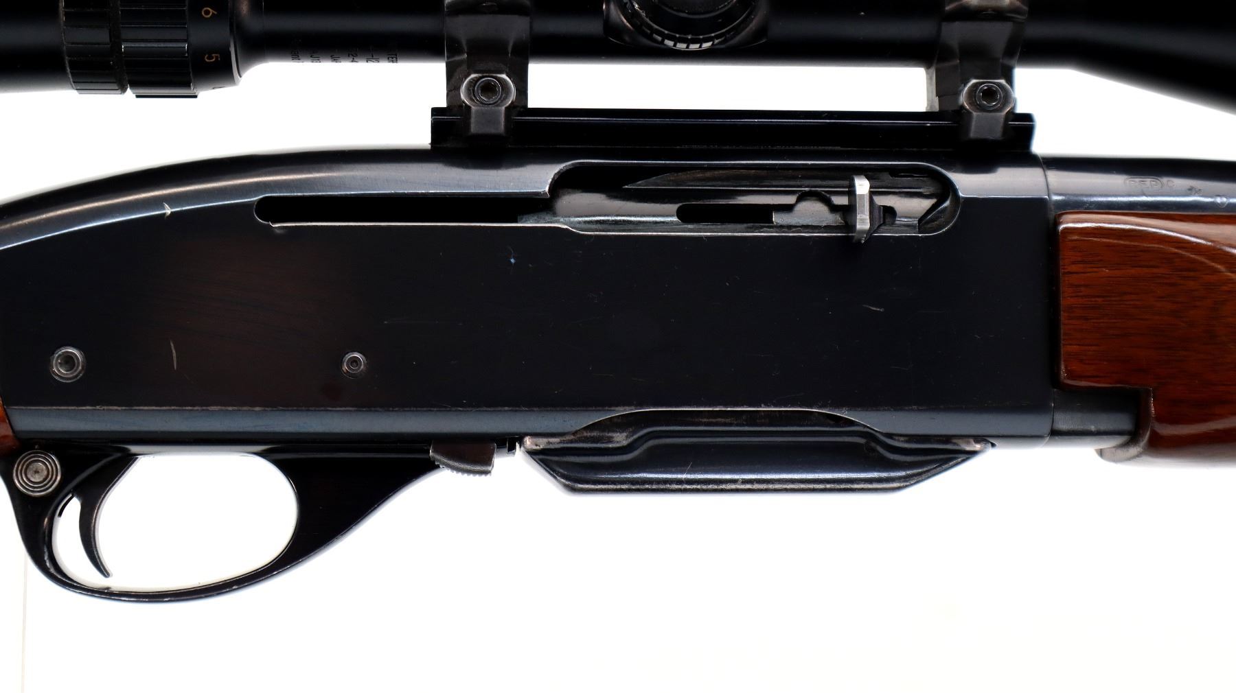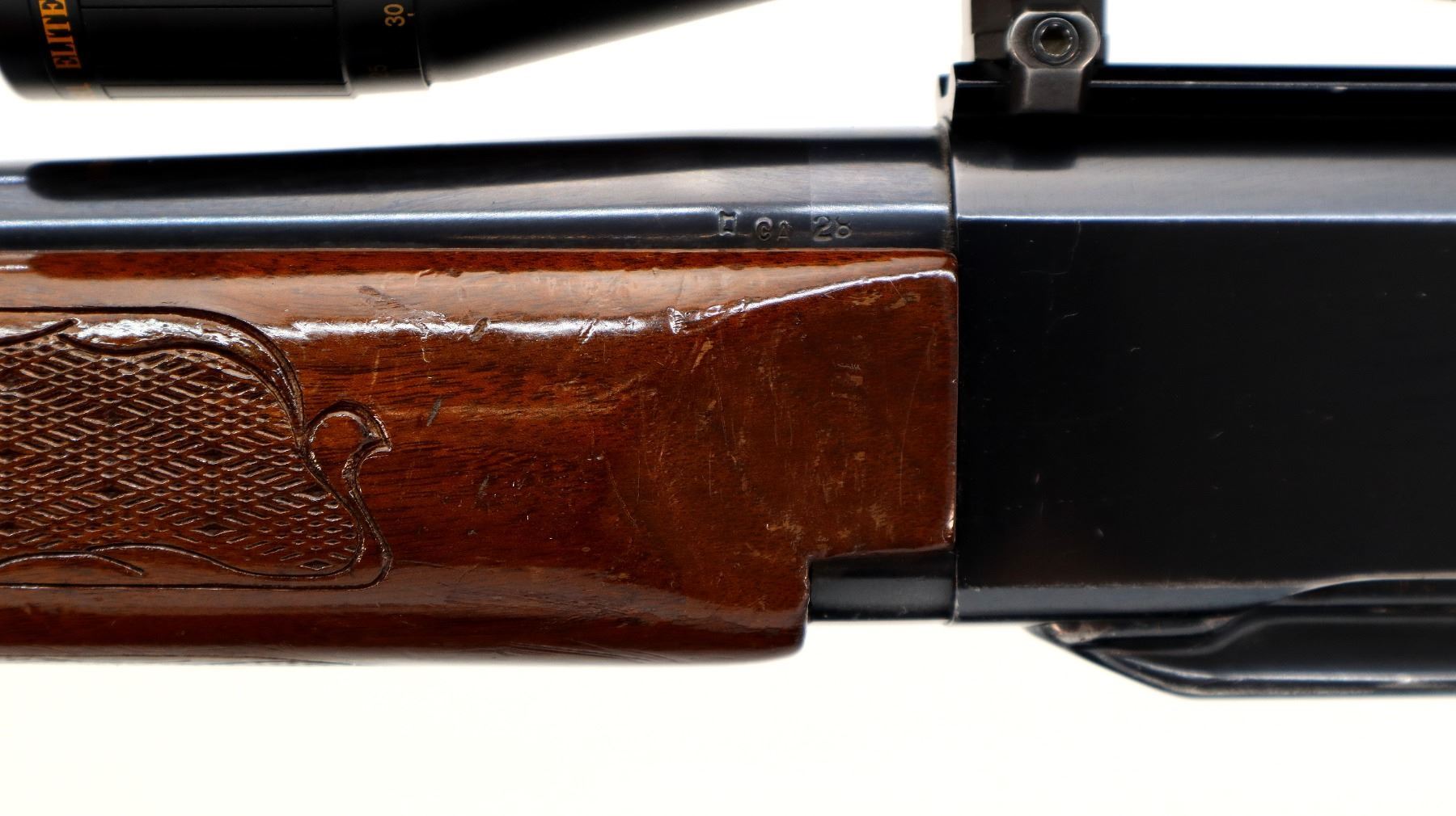 Main Description: Missing front and rear sights, threaded holes present, polish blued finish, receiver drilled and tapped with one piece scope base millet rings with Bushnell Elite 3200 4-12x40 AO Scope installed, clear optics with duplex crosshair. Two piece wood stocks, checkered forearm and pistol grip and black polymer butt plate, grip cap, swivel studs.