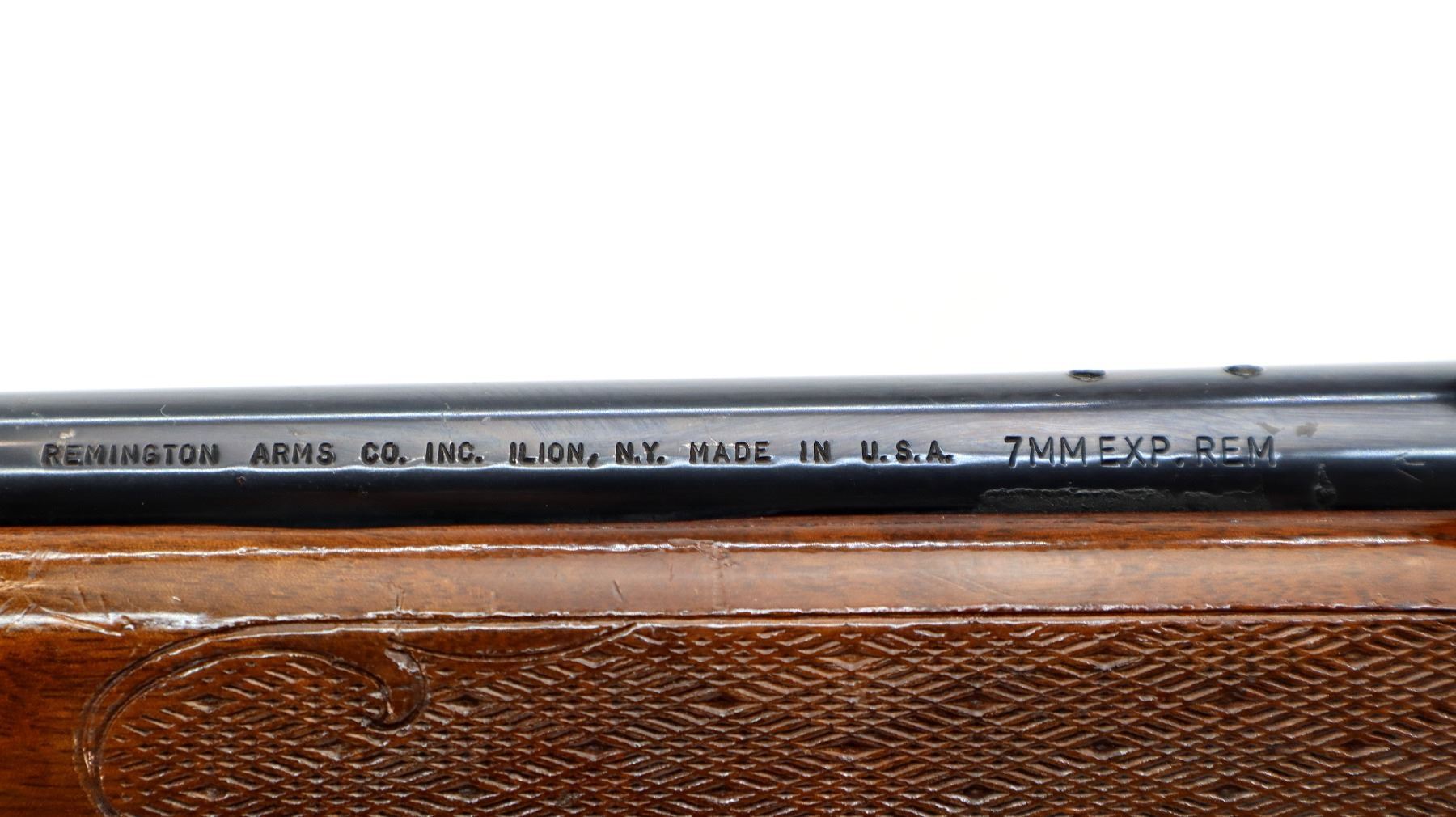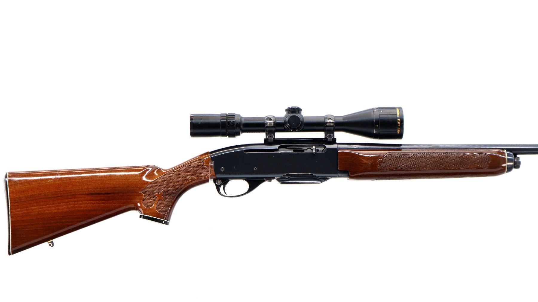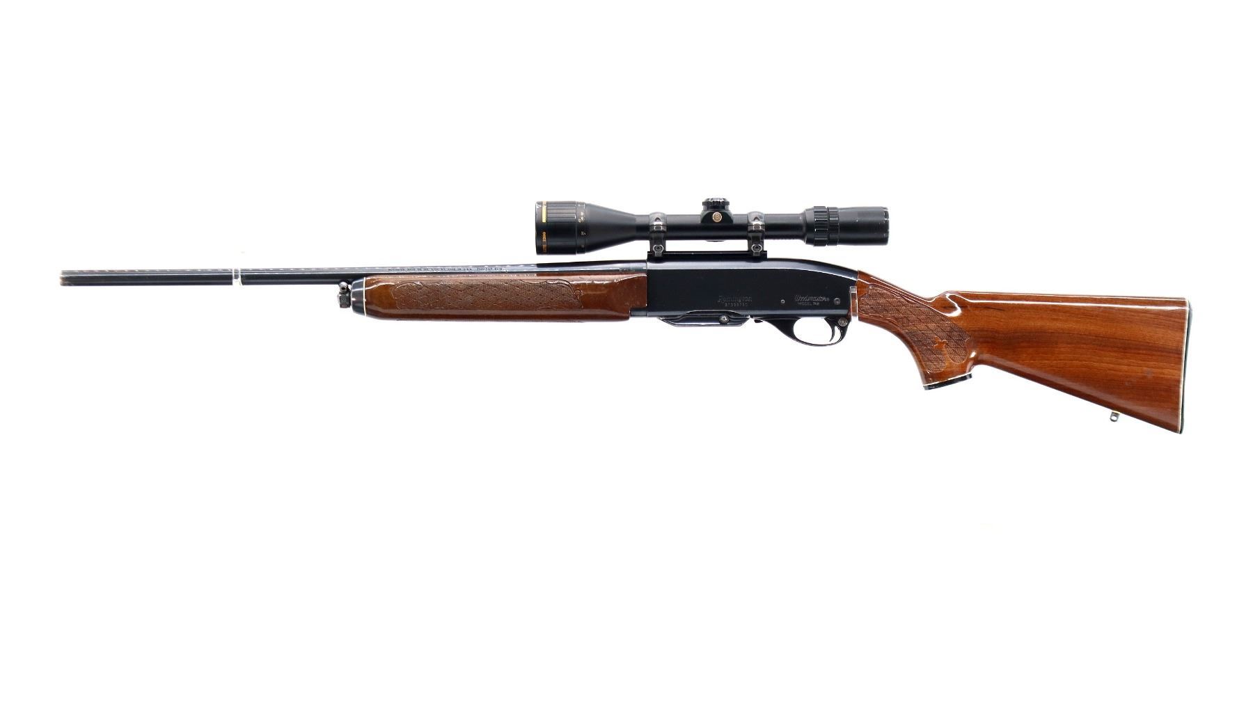 Main Description: Missing front and rear sights, threaded holes present, polish blued finish, receiver drilled and tapped with one piece scope base millet rings with Bushnell Elite 3200 4-12x40 AO Scope installed, clear optics with duplex crosshair. Two piece wood stocks, checkered forearm and pistol grip and black polymer butt plate, grip cap, swivel studs.
