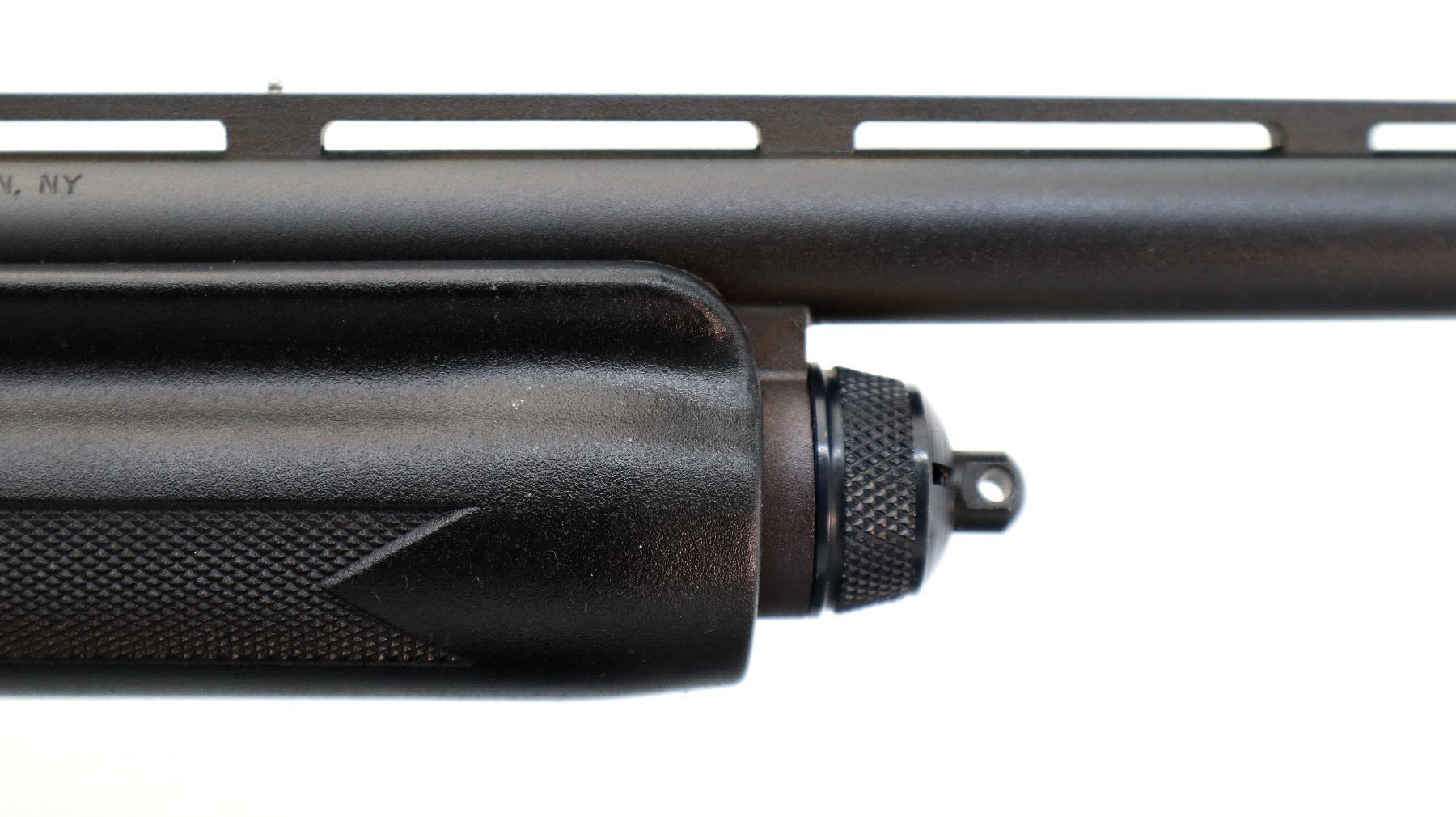 Main Description: White front and silver mid rib beads, Parkerized metal finish, vent rib. Two piece black synthetic stocks, finger grooved checkered forearm and pistol grip, black rubber recoil pad, swivel studs.