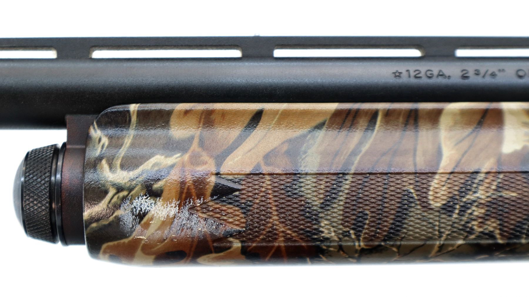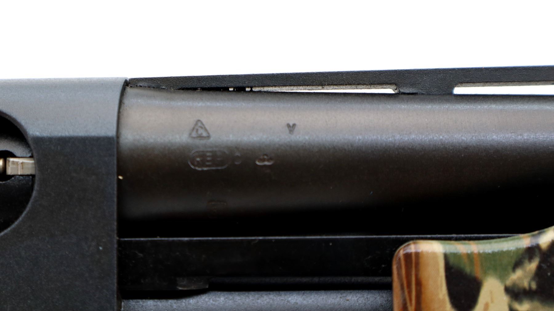 Main Description: White front and silver mid rib beads, Parkerized metal finish, vent rib. Two piece advantage camo synthetic stocks, finger grooved checkered forearm and pistol grip, black rubber recoil pad.