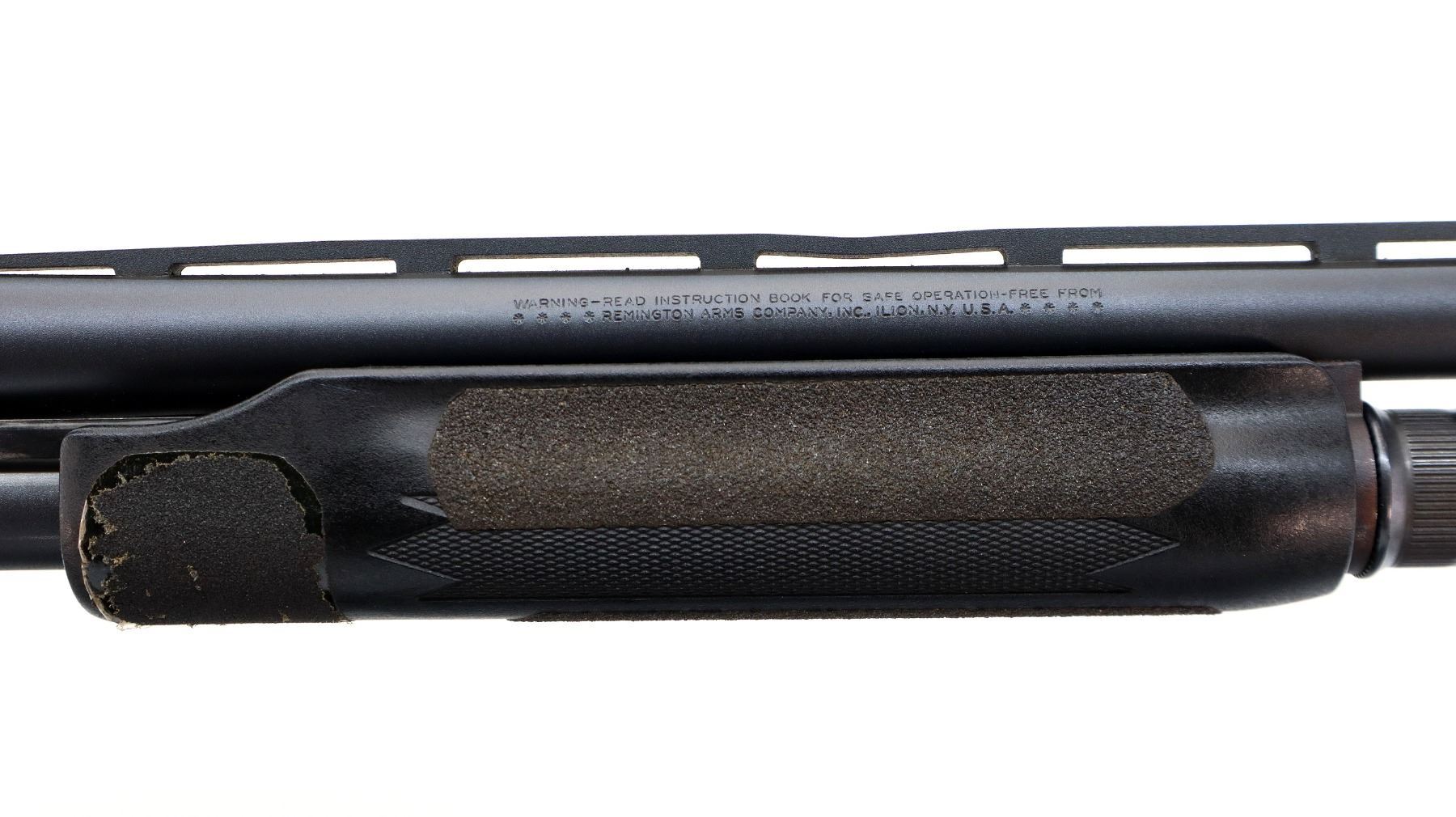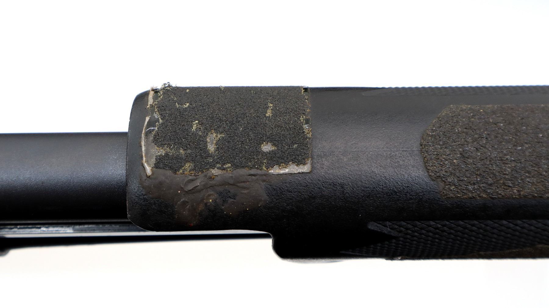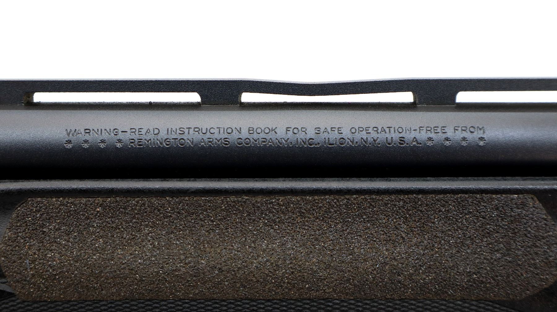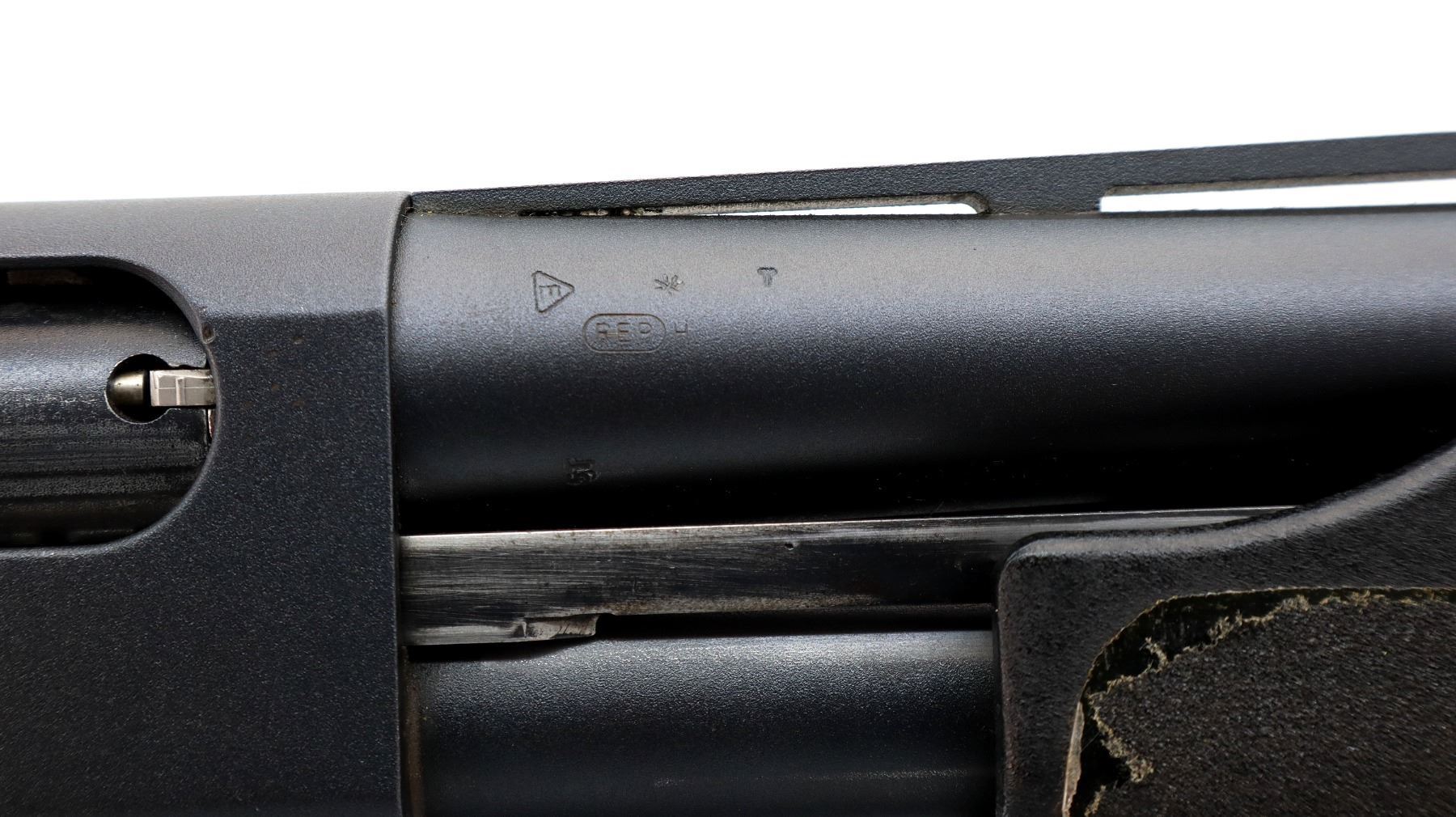 Main Description: Red bead with ramp, adjustable rear peep sight, Parkerized metal finish, ported vent rib barrel with dent in the middle, receiver has two plugged holes in front of rear sight. Two piece black synthetic stocks, modified checkered forearm with anti slip tape, checkered pistol grip, black rubber recoil pad, extended magtube with clamp and swivel stud.