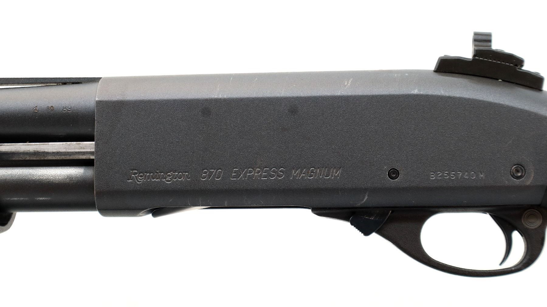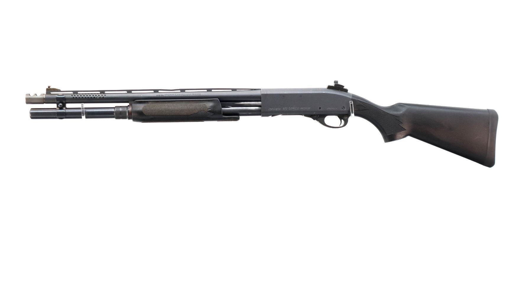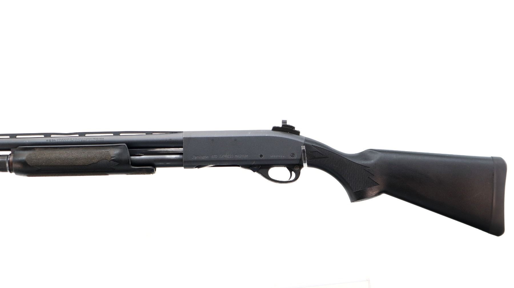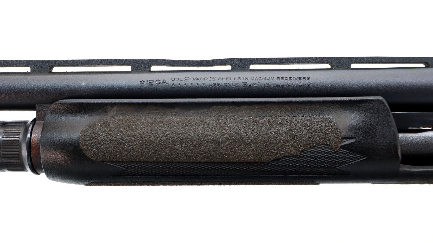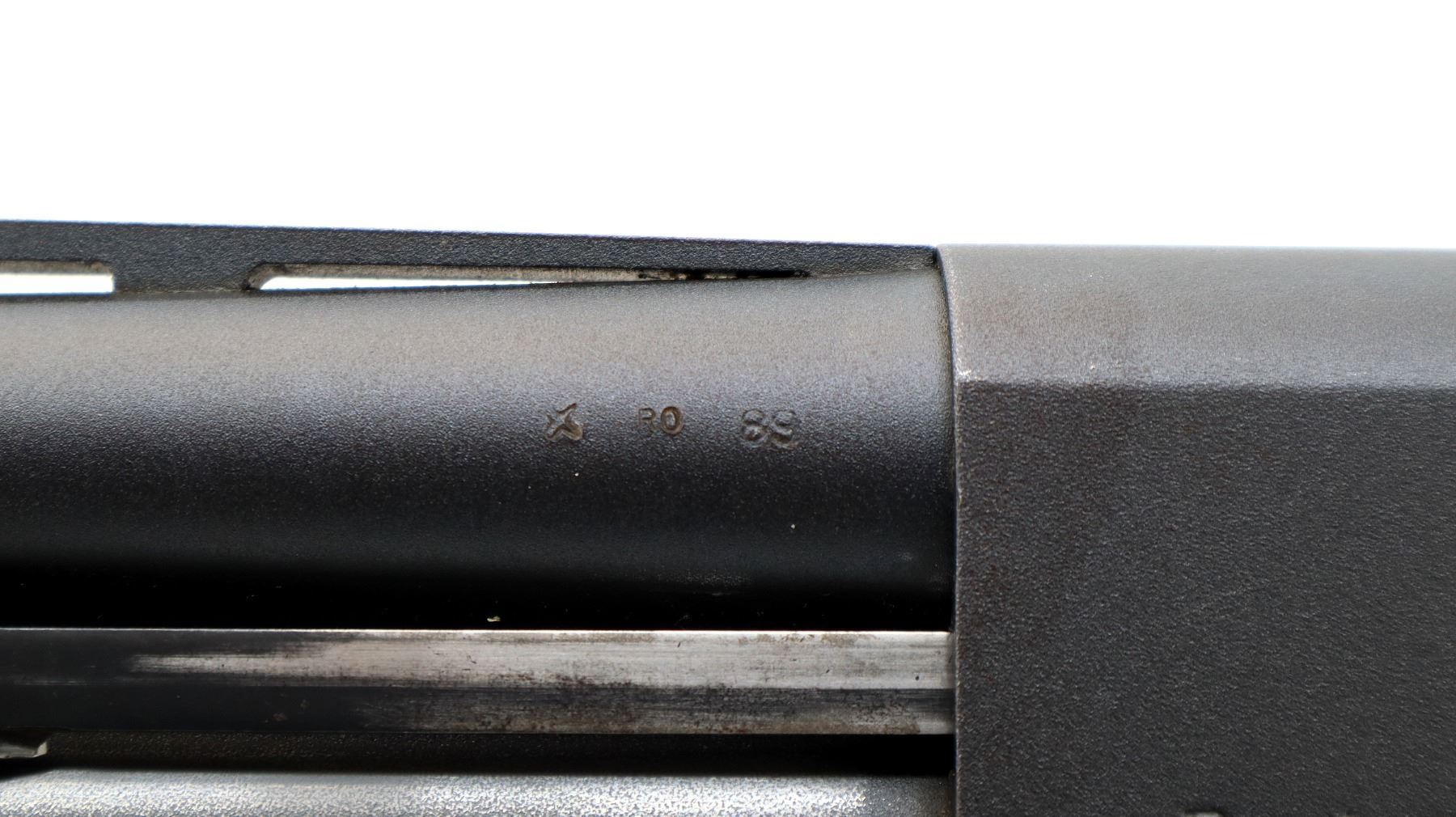 Main Description: Red bead with ramp, adjustable rear peep sight, Parkerized metal finish, ported vent rib barrel with dent in the middle, receiver has two plugged holes in front of rear sight. Two piece black synthetic stocks, modified checkered forearm with anti slip tape, checkered pistol grip, black rubber recoil pad, extended magtube with clamp and swivel stud.