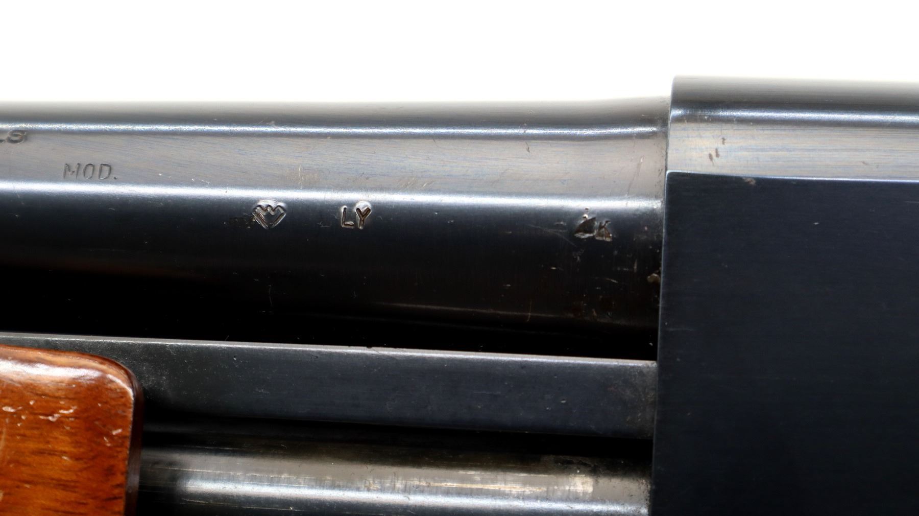 Main Description: No bead, shortened round barrel, polish blued finish. Two piece wood stocks, checkered forearm and pistol grip, brown vented rubber recoil pad, grip cap