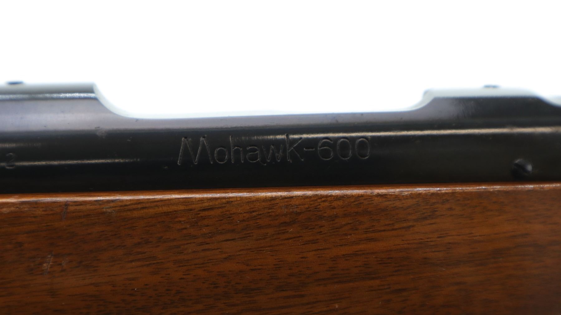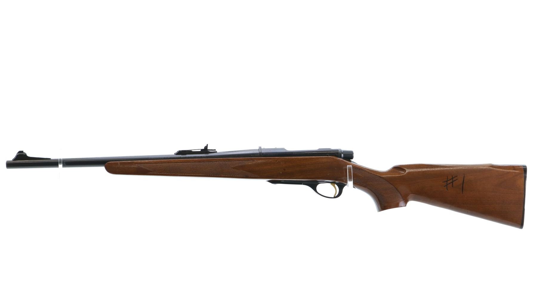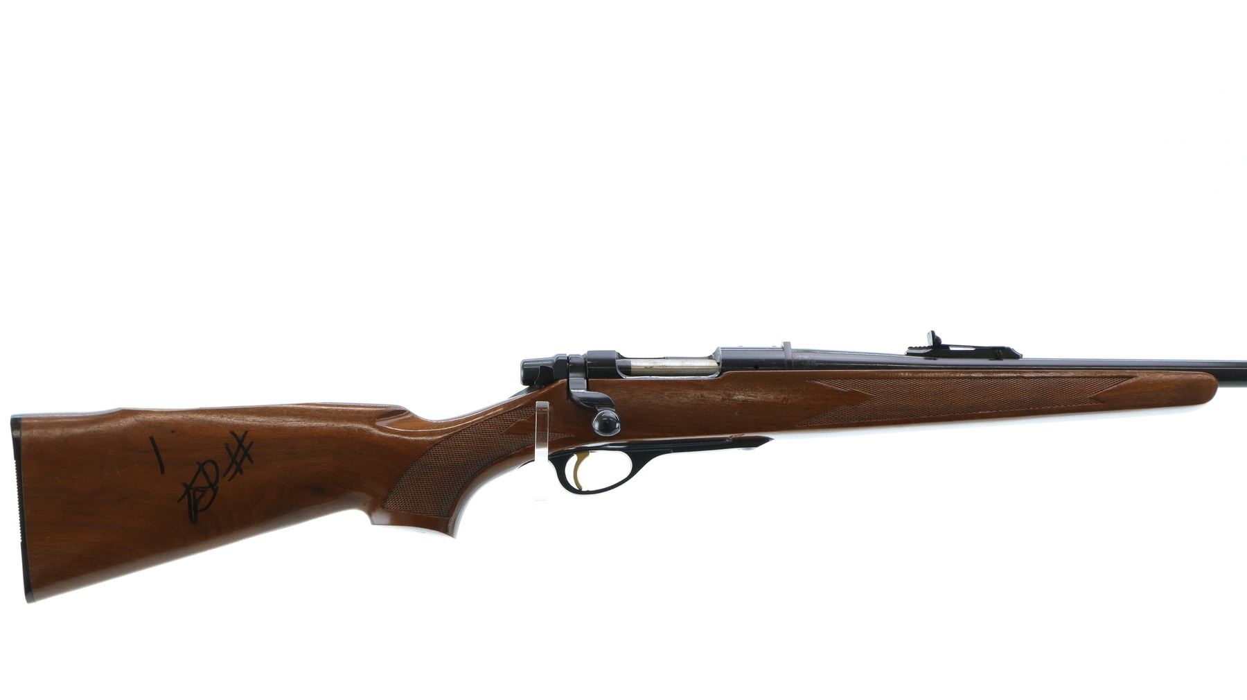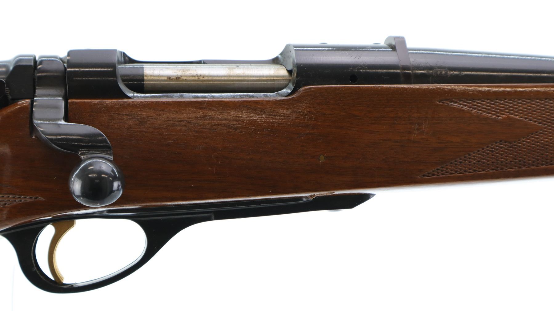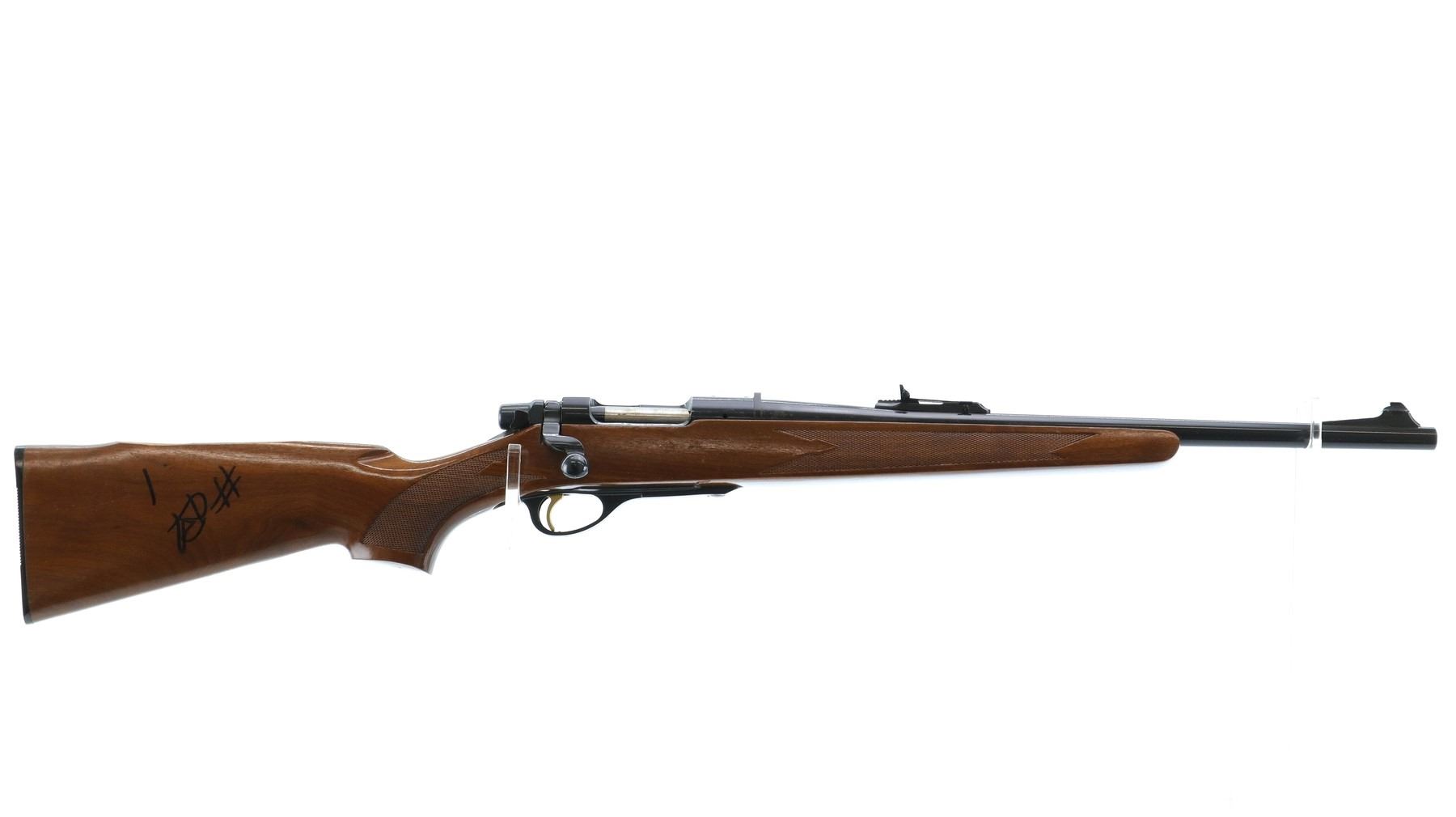 Main Description: Blade front sight with ramp, adjustable u notched rear sight, blued finish, receiver drilled and tapped with plug screws installed, checkered flat bottomed bolt knob. One piece wood stock, checkered forearm and pistol grip, modified comb with chip in crack, grooved black polymer butt plate, gold trigger, blind magazine.
