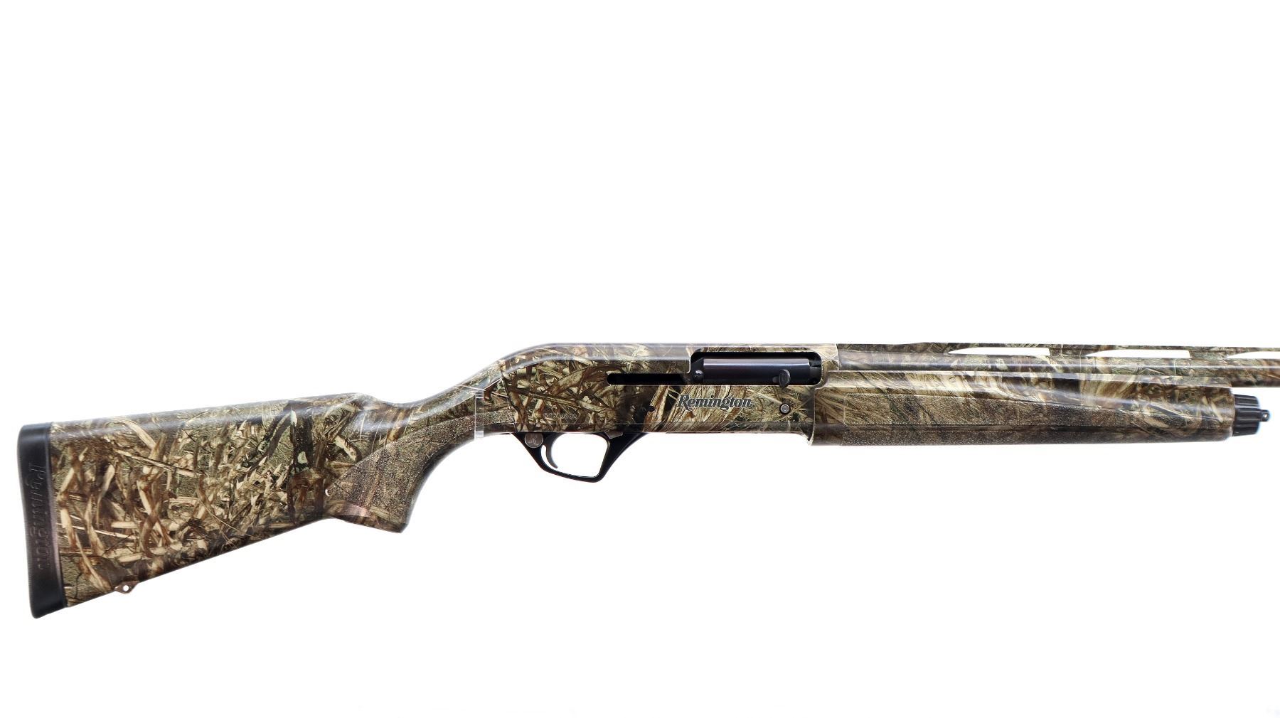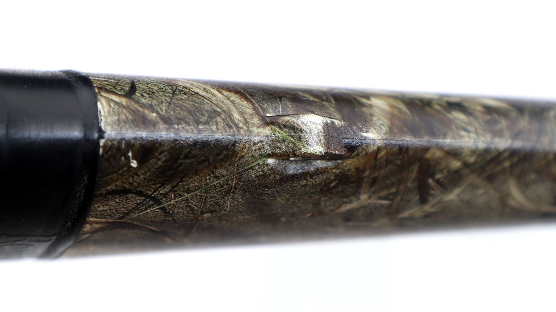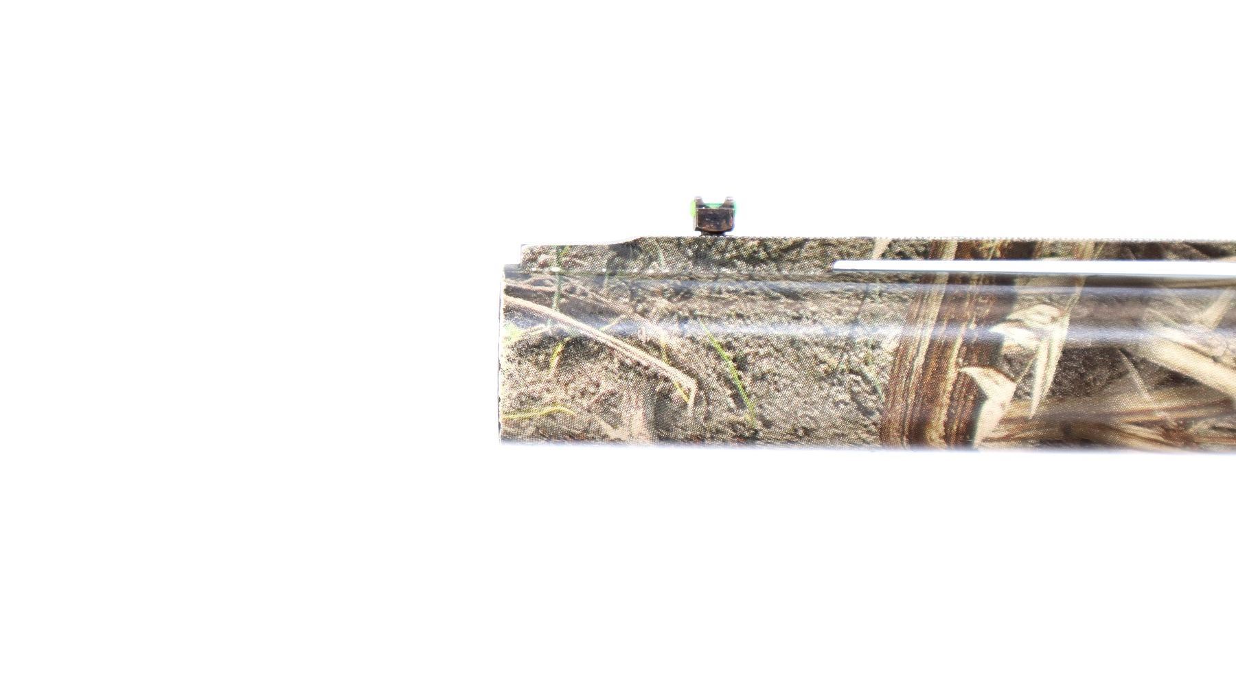 Main Description: Green fiber optic front bead, missing mid rib bead, Mossy Oak duck blind camo overall, vent rib, alloy receiver drilled and tapped with plug screws installed. Two piece synthetic stocks, finger grooved forearm with textured panels, pistol grip, black rubber recoil pad, grip cap, swivel studs.