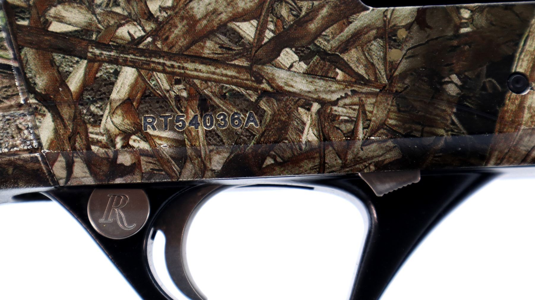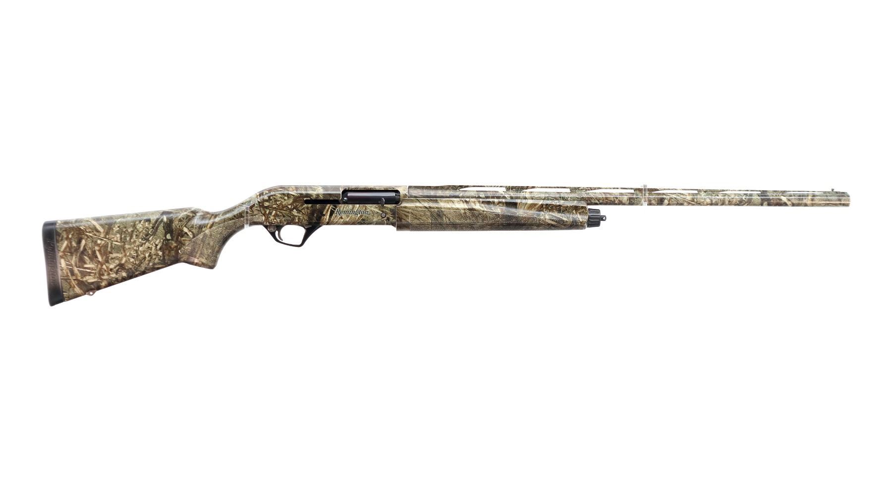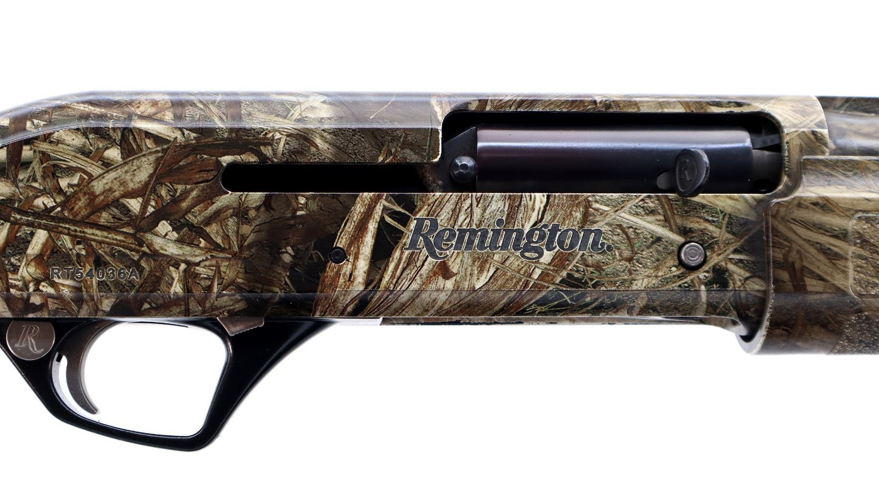 Main Description: Green fiber optic front bead, missing mid rib bead, Mossy Oak duck blind camo overall, vent rib, alloy receiver drilled and tapped with plug screws installed. Two piece synthetic stocks, finger grooved forearm with textured panels, pistol grip, black rubber recoil pad, grip cap, swivel studs.