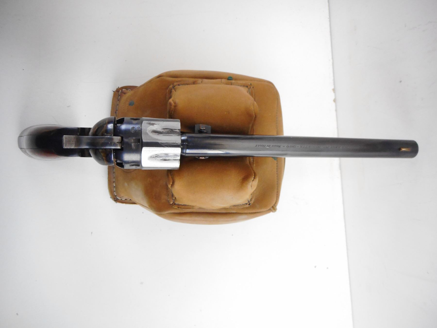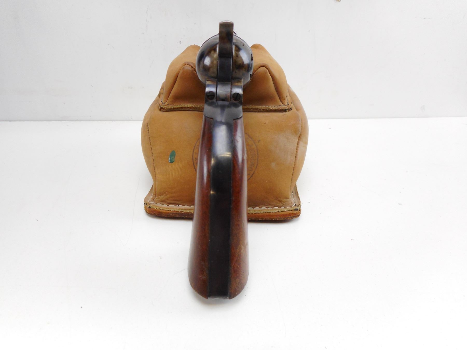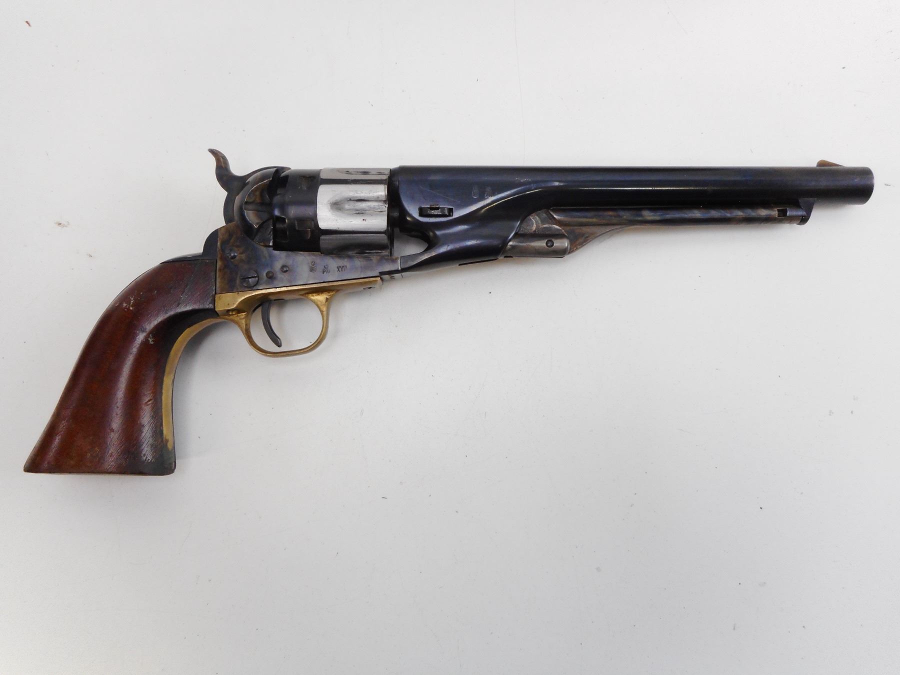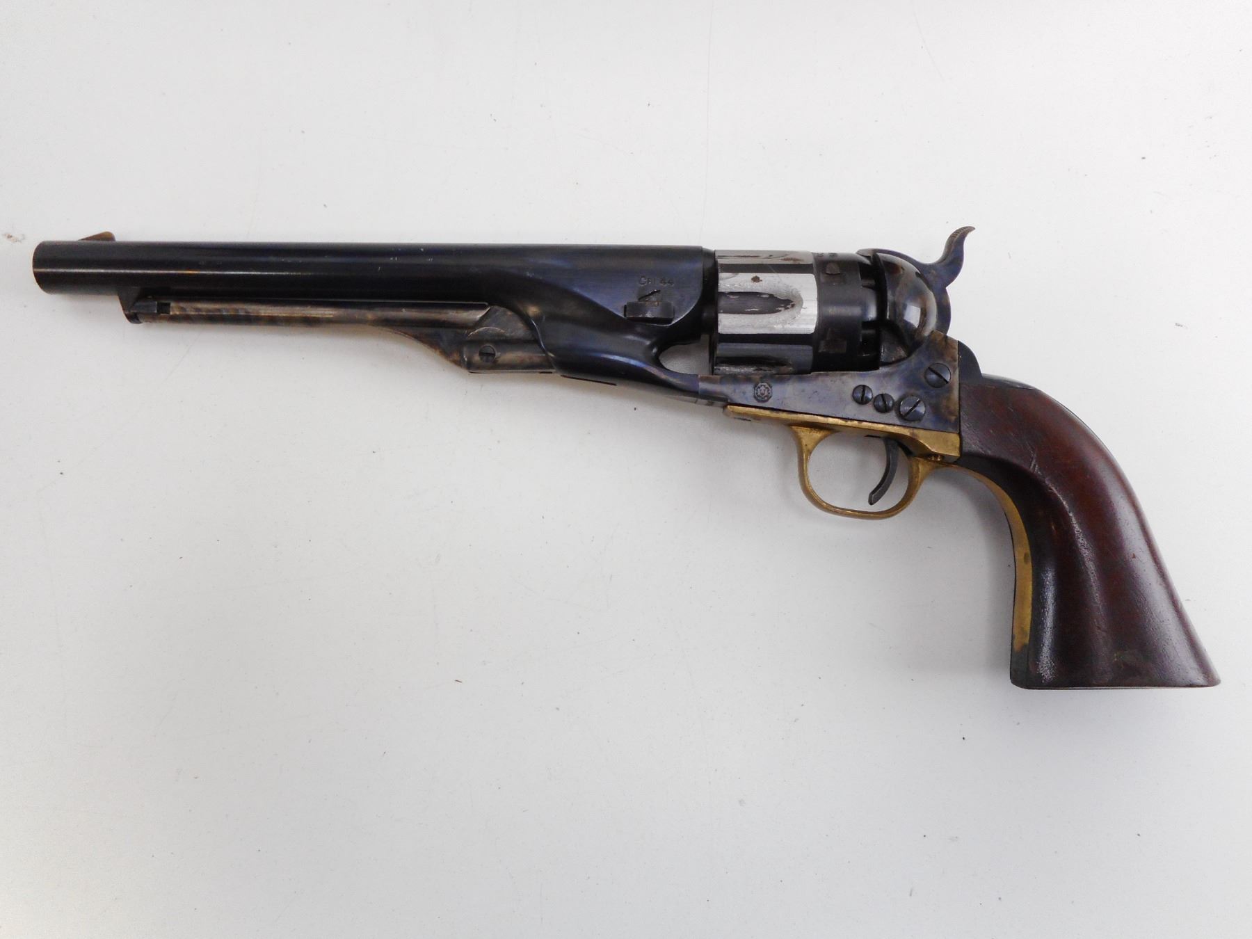 6/10 , REPLICA ARMS , MODEL: COLT 1860 ARMY REPRODUCTION , CALIBER: 44 CAL PERC , MANUFACTURED BY UBERTI. BORE IS GOOD. BLADE FRONT AND NOTCH HAMMER REAR SIGHT. CASE HARDENED RECEIVER. TWO PIECE PLAIN WOOD GRIPS. HOLDS COCK, SINGLE ACTION ONLY. FUNCTIONS WITH A ROUGH HAMMER PULL. SOME LIGHT SURFACE RUST ON THE RECEIVER. SHOWS SOME HANDLING MARKS. , ACTION: REVOLVER , BARREL LENGTH: 203MM , SERIAL# A9481 , CLASS: CANADIAN RESTRICTED CLASS