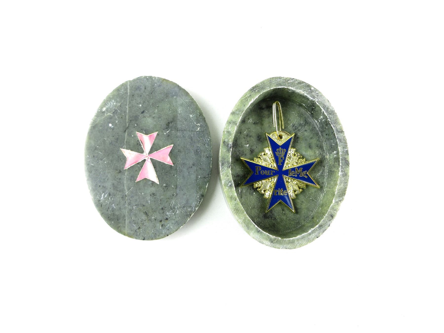 LOT INCLUDES; (1) REPRODUCTION POUR LE MERITE, ALSO KNOWN AS BLAUER MAX (GERMAN) OR BLUE MAX MEDAL, NO RIBBON & (1) STONE BOX WITH RED CROSS ON LID, NO VISIBLE MARKINGS, APPROX. 4" X 3" X 1 1/8". SEE PHOTOS.