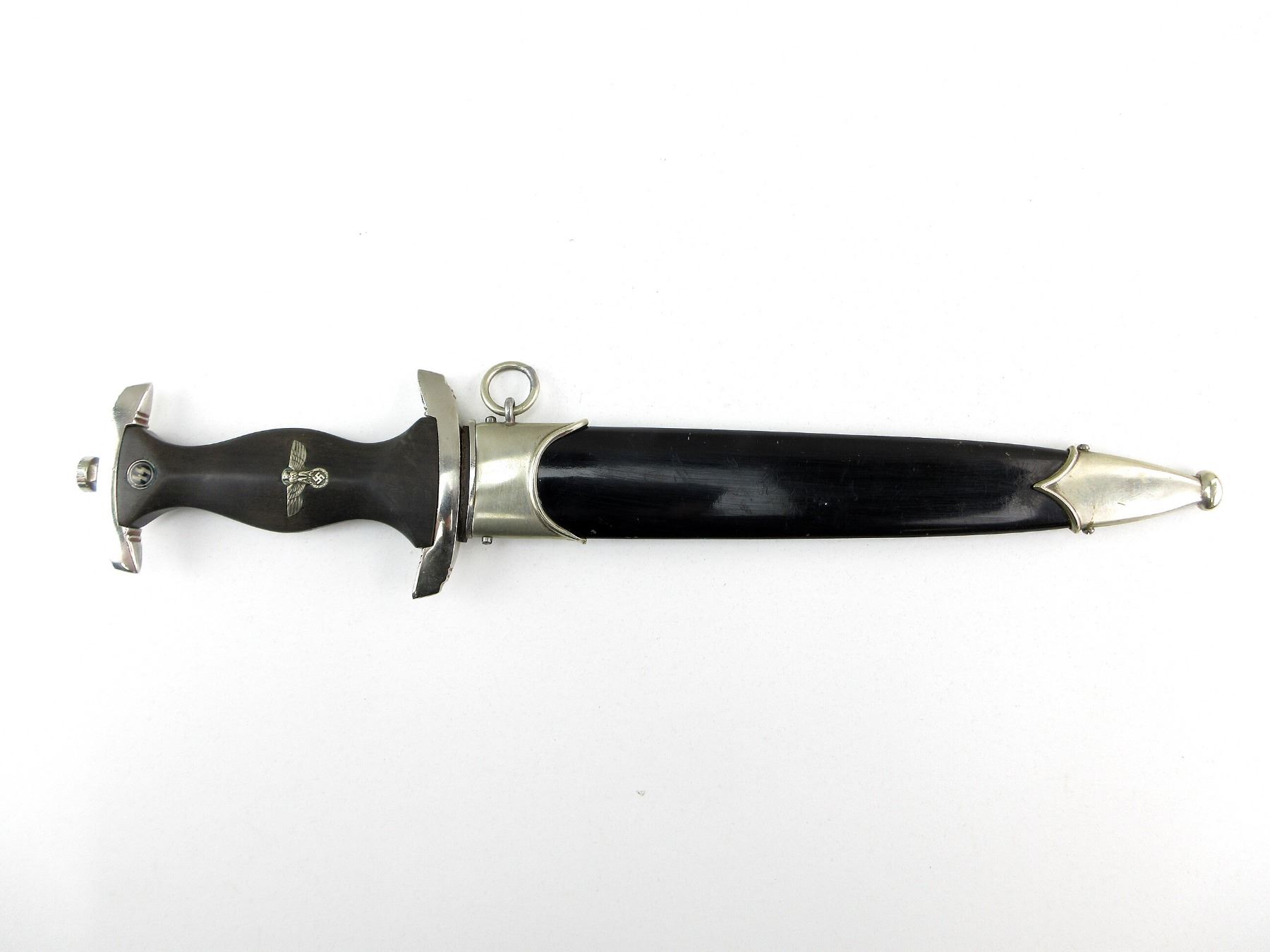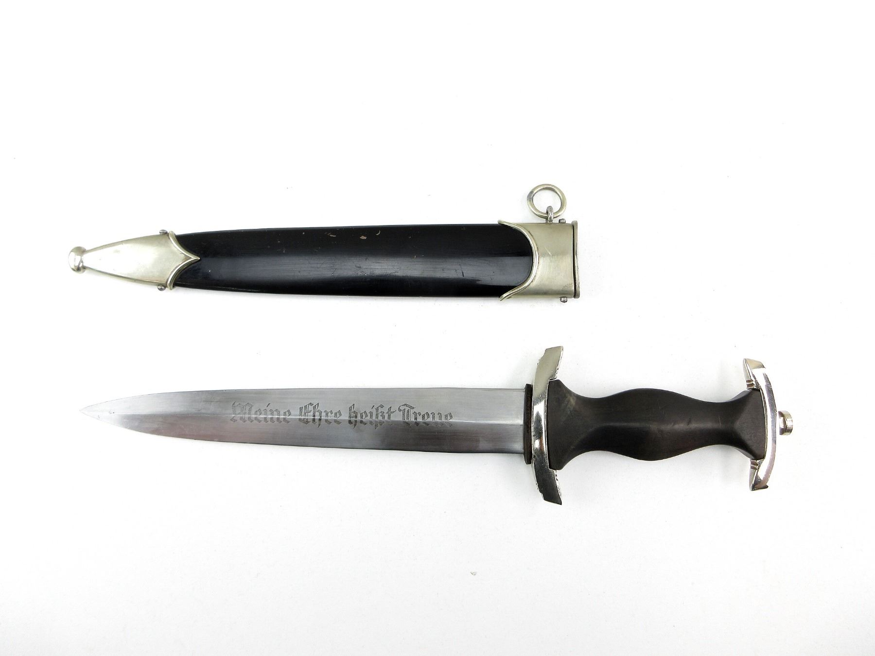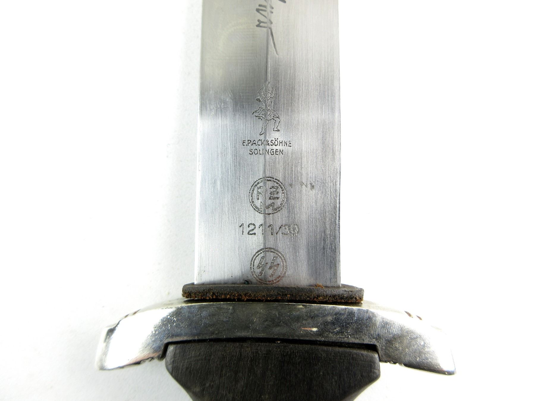 (1) DOUBLE-EDGED DAGGER, RICASSO MARKED: DANCING FIGURE OVER "E.PACK & SOHNE, SOLINGEN" (INCORRECT MFG) OVER "RZM, 1211/39" OVER "SS" IN A CIRCLE, BLADE MARKED WITH TWO INSCRIPTIONS, ONE READS: "MEINE EHRE HEIST TREUE", BLADE IS LOOSE, LEATHER WASHER / BUFFER PAD, WOOD HANDLE WITH MEDALLIONS, METAL POMMEL, NO VISIBLE MARKINGS, BLACK PAINTED STEEL SCABBARD WITH SILVER THROAT / TIP, THROAT HAS METAL RING, NO VISIBLE MARKINGS, BLADE APPROX. 8 5/8" & OAL APPROX. 13 5/8". SEE PHOTOS.