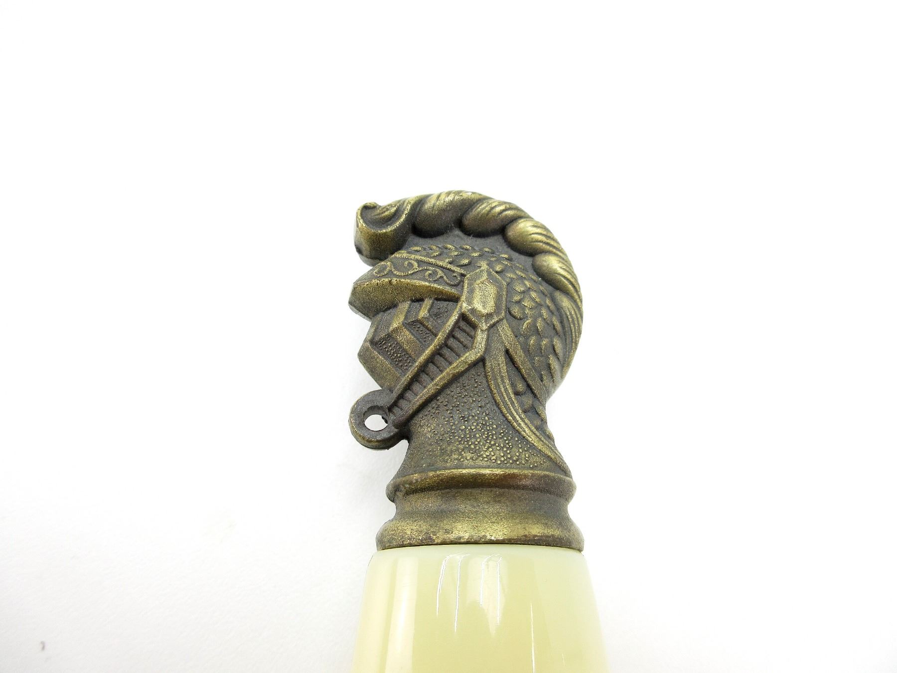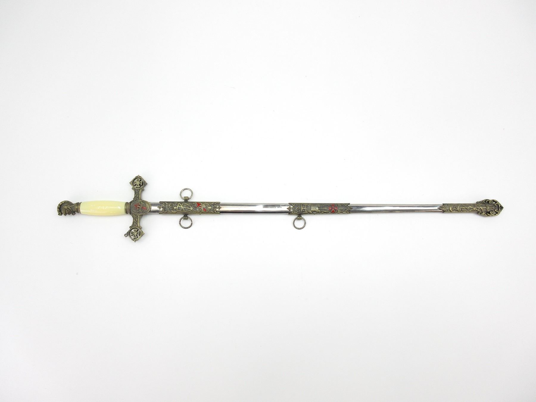 (1) THIN STRAIGHT DOUBLE-EDGED SWORD, BLADE MARKED: "440, STAINLESS, CHINA", DECORATIVE BRASS CROSS-PIECE WITH RED CROSS & CROWN IN CIRCLE, MARKED: "IN HOC SIGUD VINCES" AROUND CROSS / CROWN, CROSSES ON ENDS WITH DECORATIVE FLORAL PATTERNS, CREAM COLOURED GRIP, WITH BRASS KNIGHT'S HEAD POMMEL, NO VISIBLE MARKINGS, METAL & BRASS SCABBARD, BRASS PORTIONS WITH DECORATIVE SHIELD, CROWN, CROSSES, BODY ARMOUR, WEAPONRY ETC., THREE METAL HANGERS, NO VISIBLE MARKINGS, BLADE APPROX. 27 1/8" & OAL APPROX. 33.5". SEE PHOTOS.