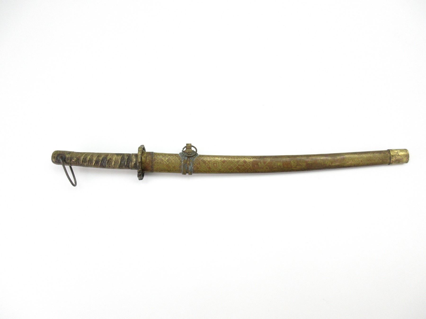 (1) SINGLE-EDGED SWORD, RICASSO MARKED WITH VARIOUS CHINESE CHARACTERS ON EITHER SIDE, CHINESE NATIONALIST FLAG ON ONE SIDE WITH "40127", FLORAL SHAPED BRASS CROSS-GUARD WITH FLORAL DESIGNS, SCABBARD RELEASE BUTTON WITH CHINESE CHARACTERS ON EITHER SIDE OF BUTTON, RELEASE BUTTON NO-LONGER CATCHES / HOLDS SCABBARD, BRASS GRIP / POMMEL, GRIP DESIGNED / ETCHED TO LOOK WRAPPED WITH FLORAL DESIGNS, METAL LOOP THROUGH POMMEL, BRASS & WOOD SCABBARD, MARKED WITH VARIOUS CHINESE CHARACTERS ON EITHER SIDE, CHECKERED DESIGN, DECORATIVE PIECE WITH METAL HANGER, BLADE APPROX. 18 3/8" & OAL APPROX. 24.75". SEE PHOTOS.