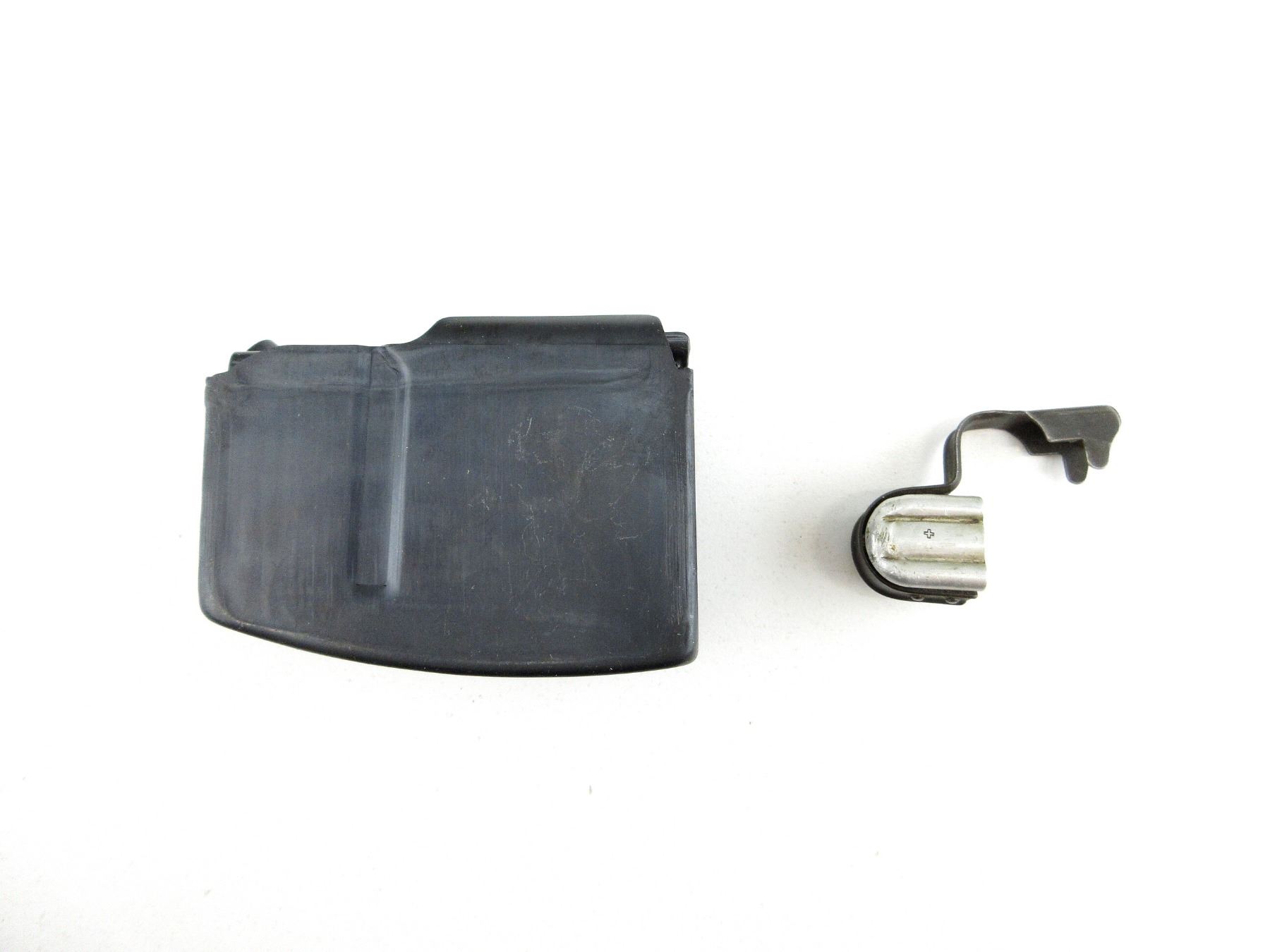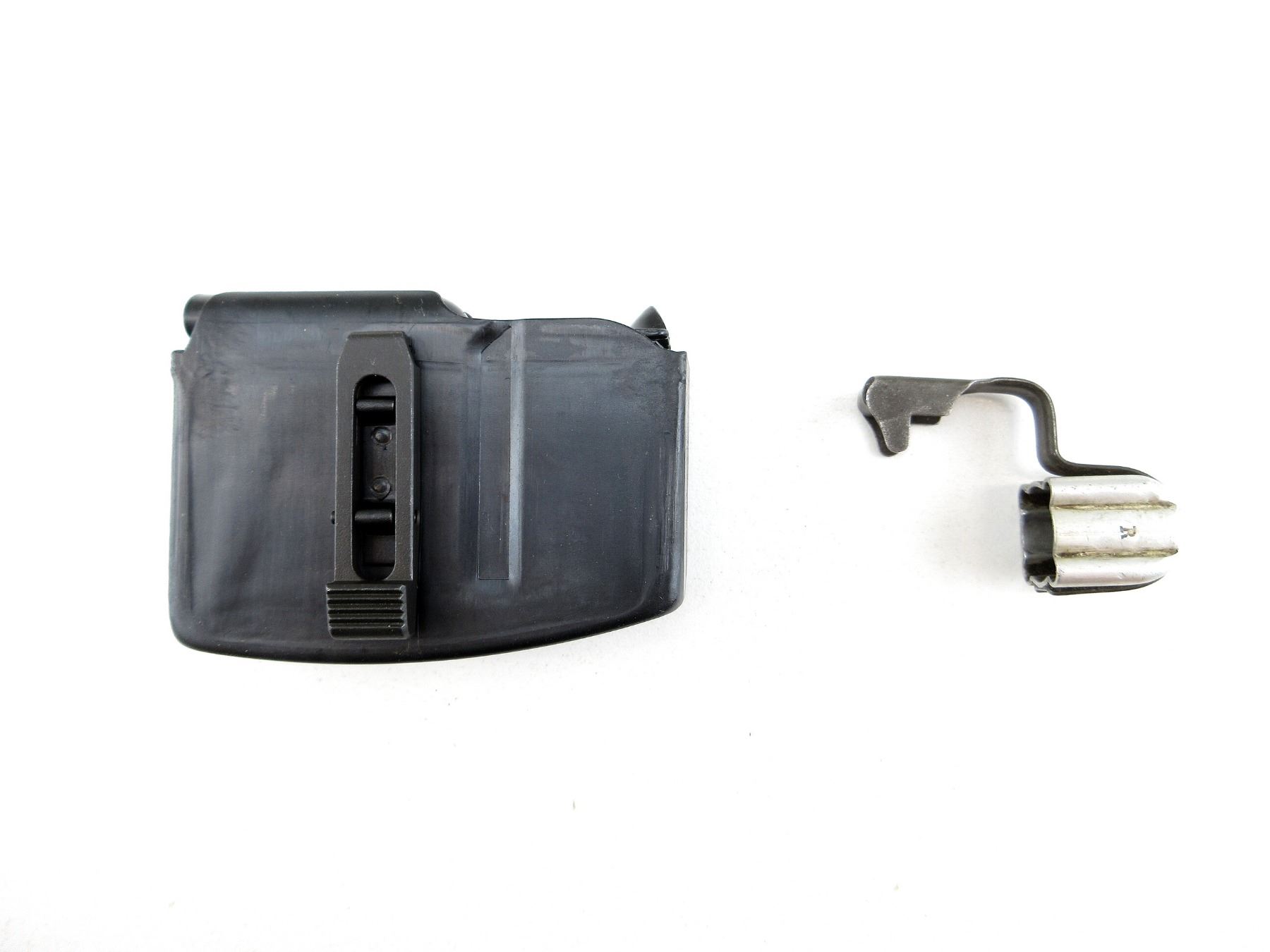 LOT INCLUDES; (1) RIFLE MAGAZINE, 7.5X55MM, 6 ROUND MAG, BLUED STEEL CONSTRUCTION, UNMARKED, (1) MUZZLE CAP, MARKED: "R", WITH SWISS CROSS. SEE PHOTOS. PAL REQUIRED.