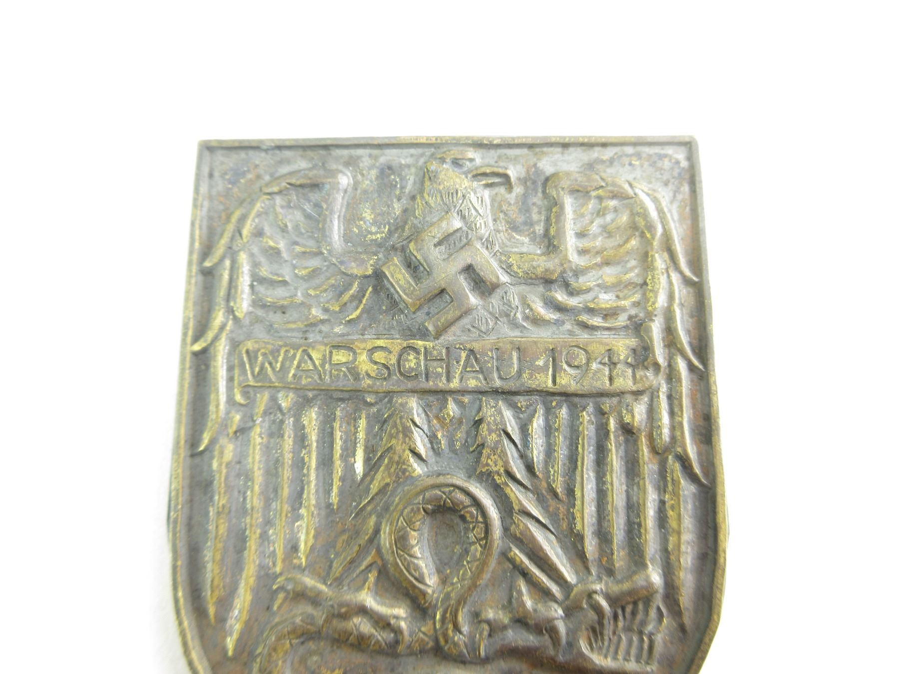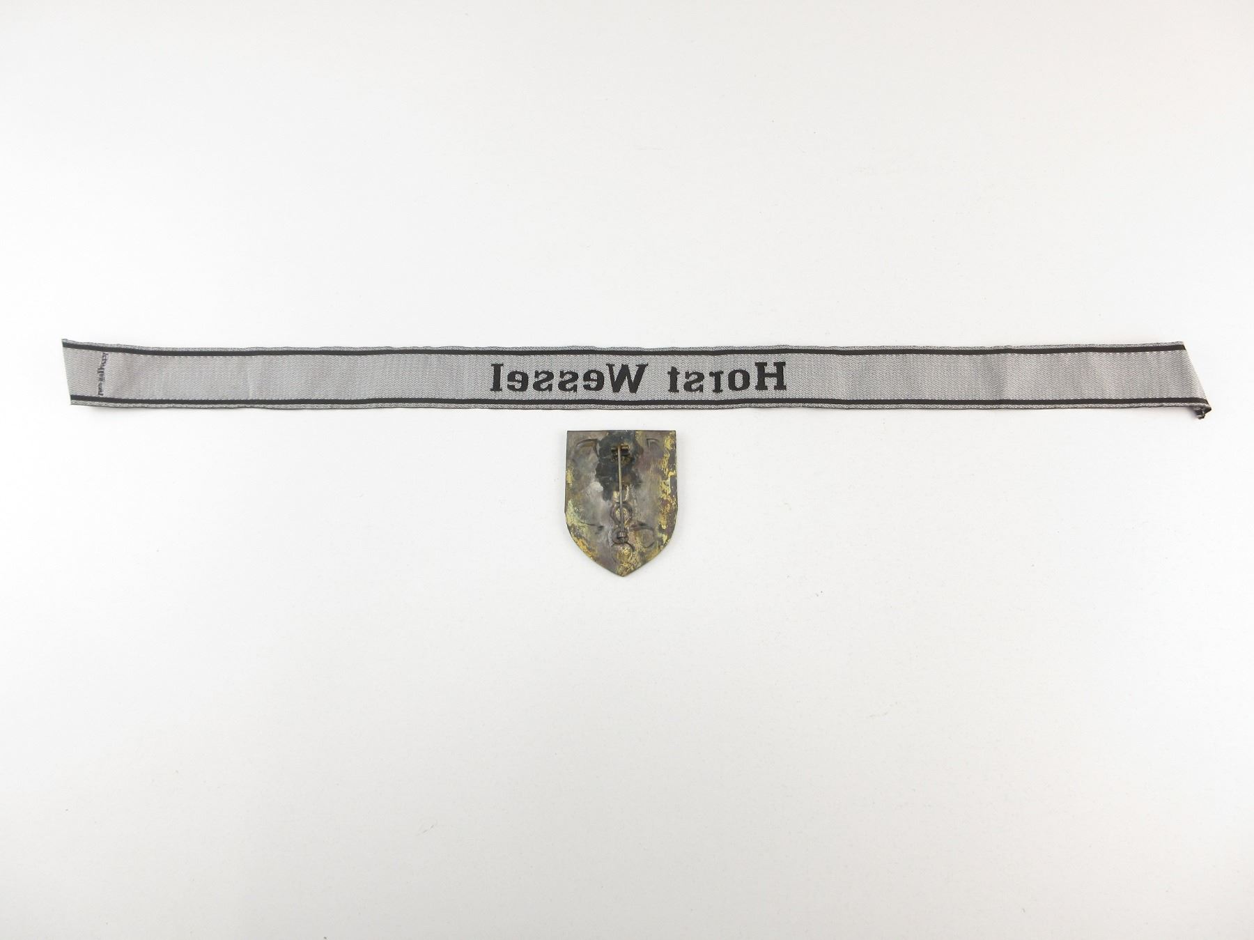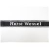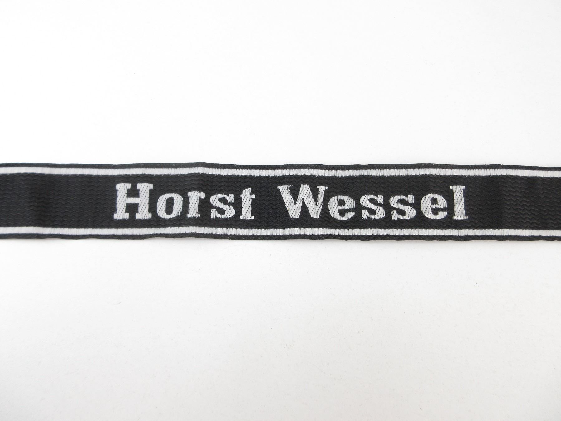 LOT INCLUDES; (1) BEVO CUFF TITLE MARKED: "HORST WESSEL" & "BEVO-WUPPERTAL", GLOWS UNDER BLACK LIGHT, OAL APPROX. 24" & (1) WARSAW SHIELD BADGE, MARKED: "WARSCHAU 1944", WITH PIN BACKING, NO VISIBLE MARKER'S MARKS. SEE PHOTOS.