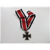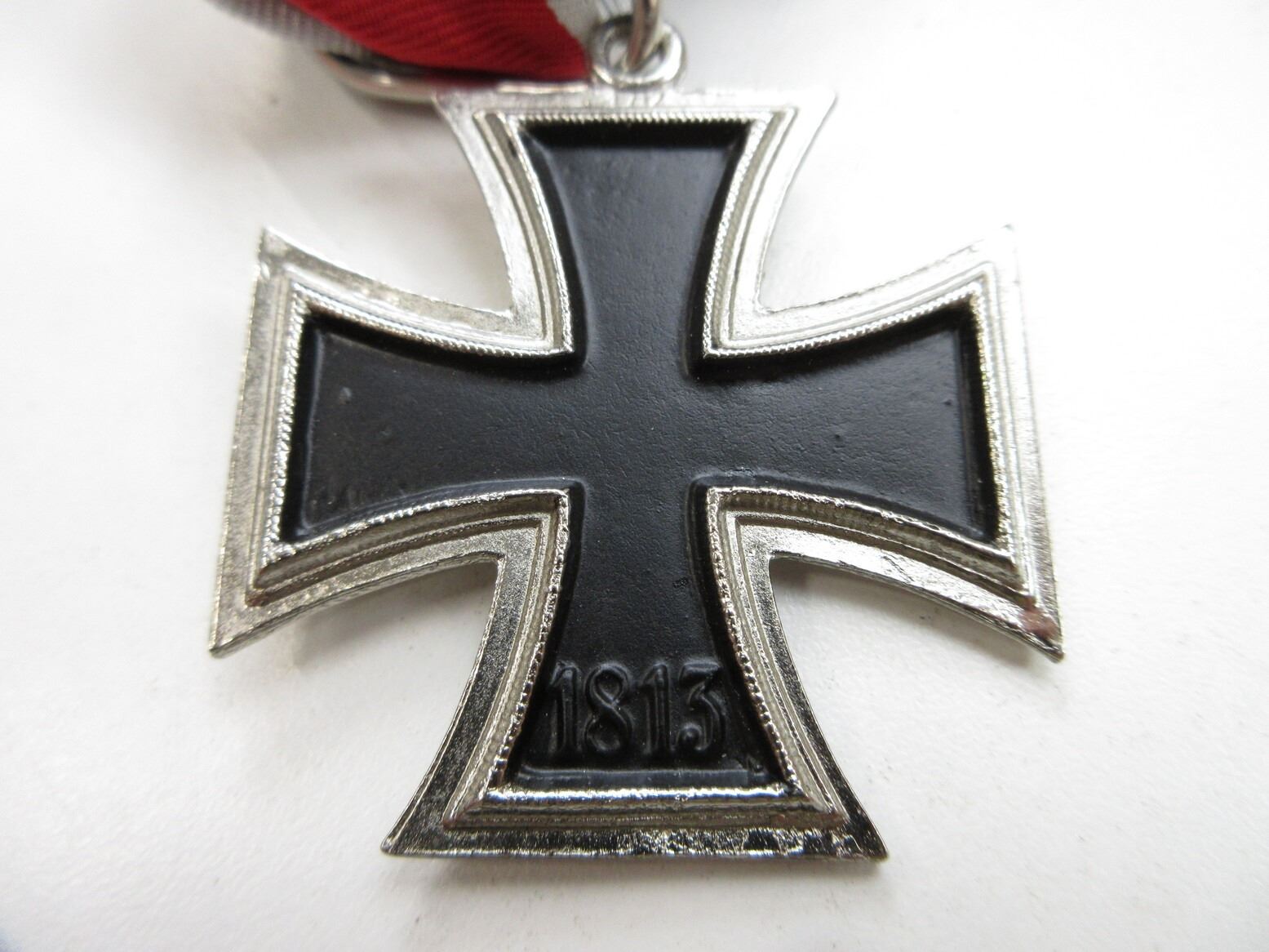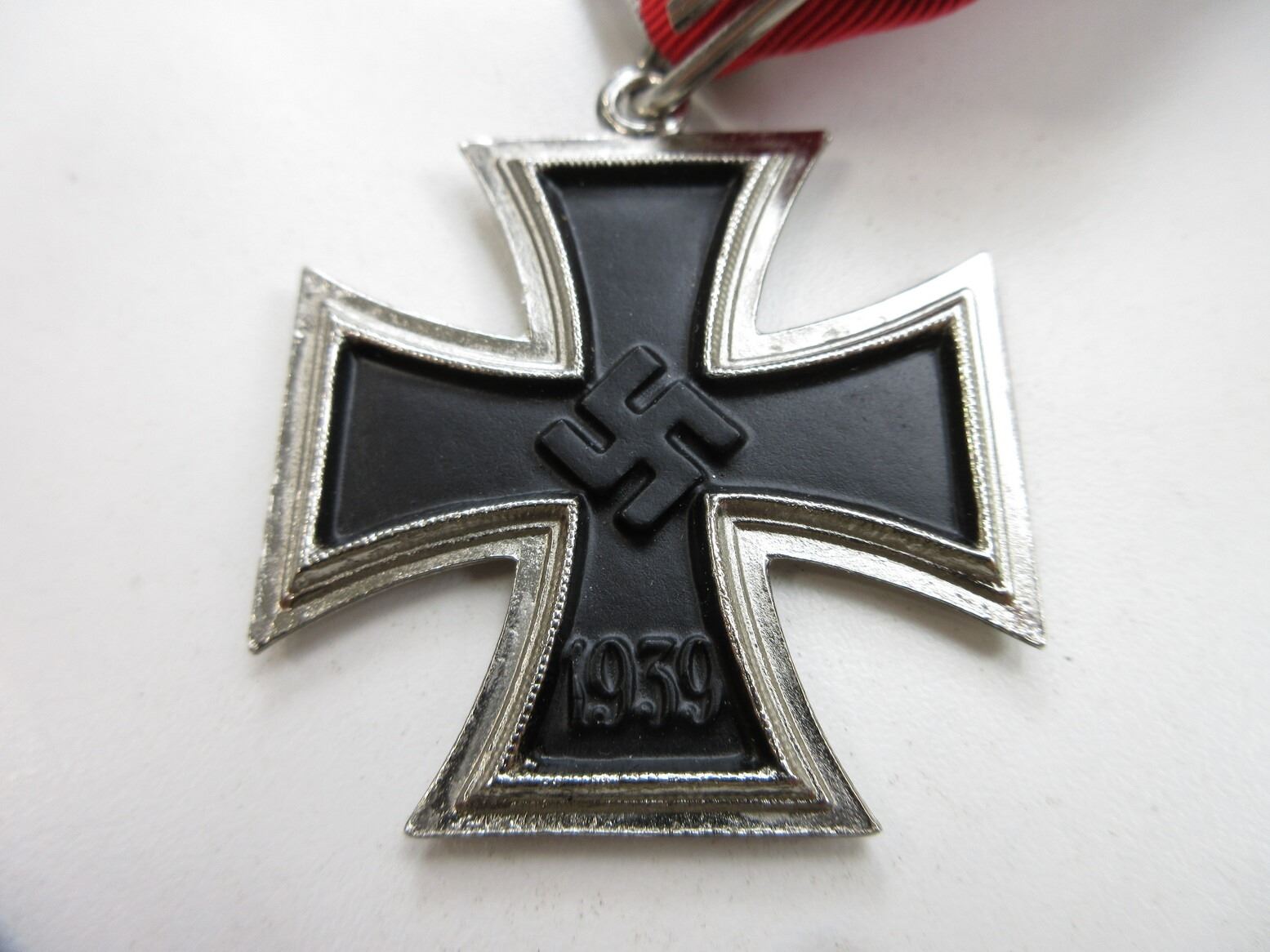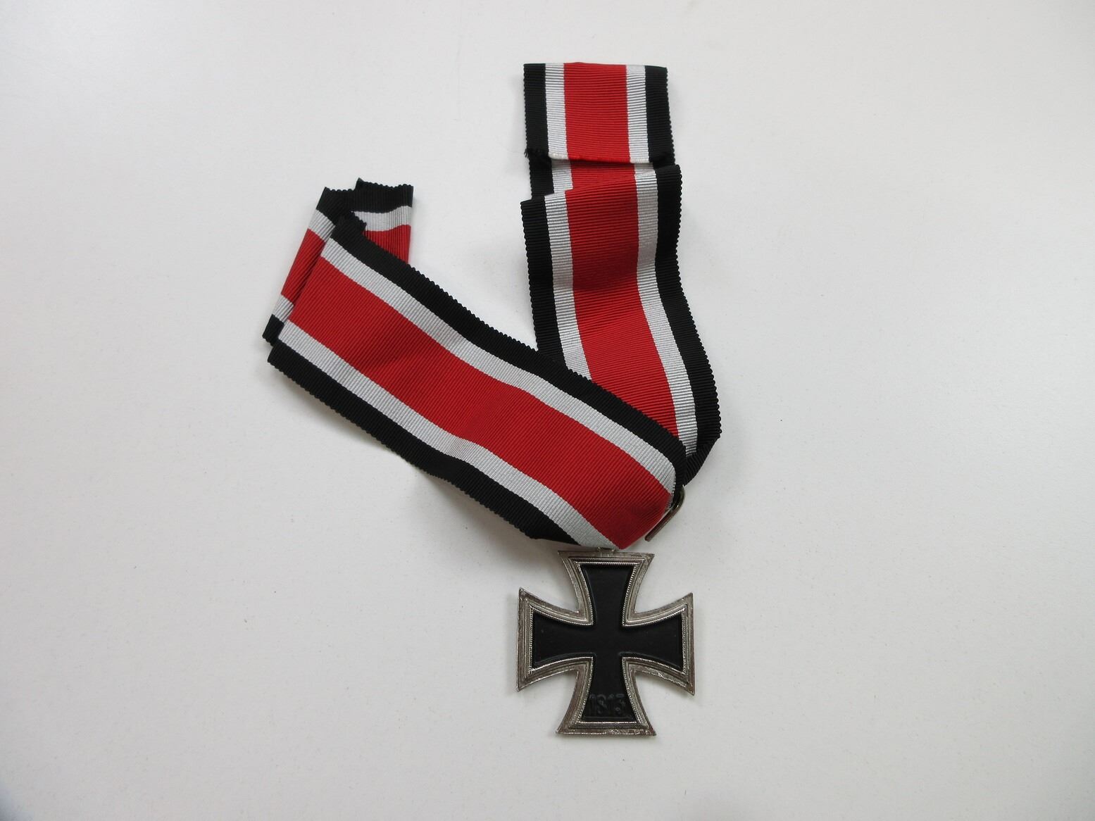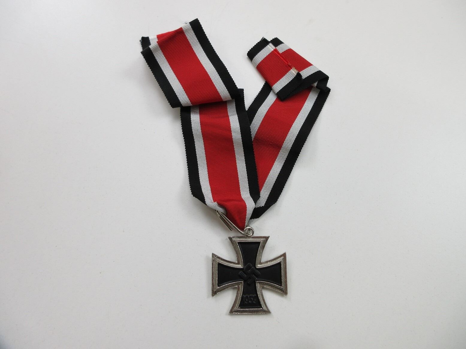 REPRODUCTION WWII GERMAN "KNIGHT'S CROSS OF THE IRON CROSS 1939" MEDAL. (1) NON-MAGNETIC, SILVER WITH BLACK FRONT MARKED: SWASTIKA OVER "1939", BACK MARKED: "1813", WIDE BLACK / WHITE / RED RIBBON. SEE PHOTOS.