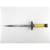 (1) REPRODUCTION 2ND MODEL AIRFORCE DAGGER, DOUBLE EDGED BLADE, BLADE MARKED: "CHINA", DECORATIVE ENGRAVED BLADE, FLYING EAGLE HOLDING SWASTIKA & PEBBLED CROSS-GUARD, CROSS-GUARD IS LOOSE, DECORATIVE OAK LEAVES ABOVE CROSS-GUARD, YELLOW GROOVED GRIP, WIRE WRAP IS MISSING, HEART SHAPED POMMEL WITH SWASTIKA, OAK LEAVES & ACORNS, POMMEL IS LOOSE, NO SCABBARD, BLADE APPROX. 9.5" & OAL APPROX. 15". SEE PHOTOS.