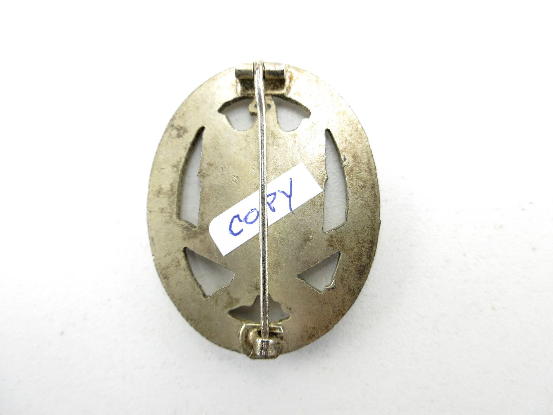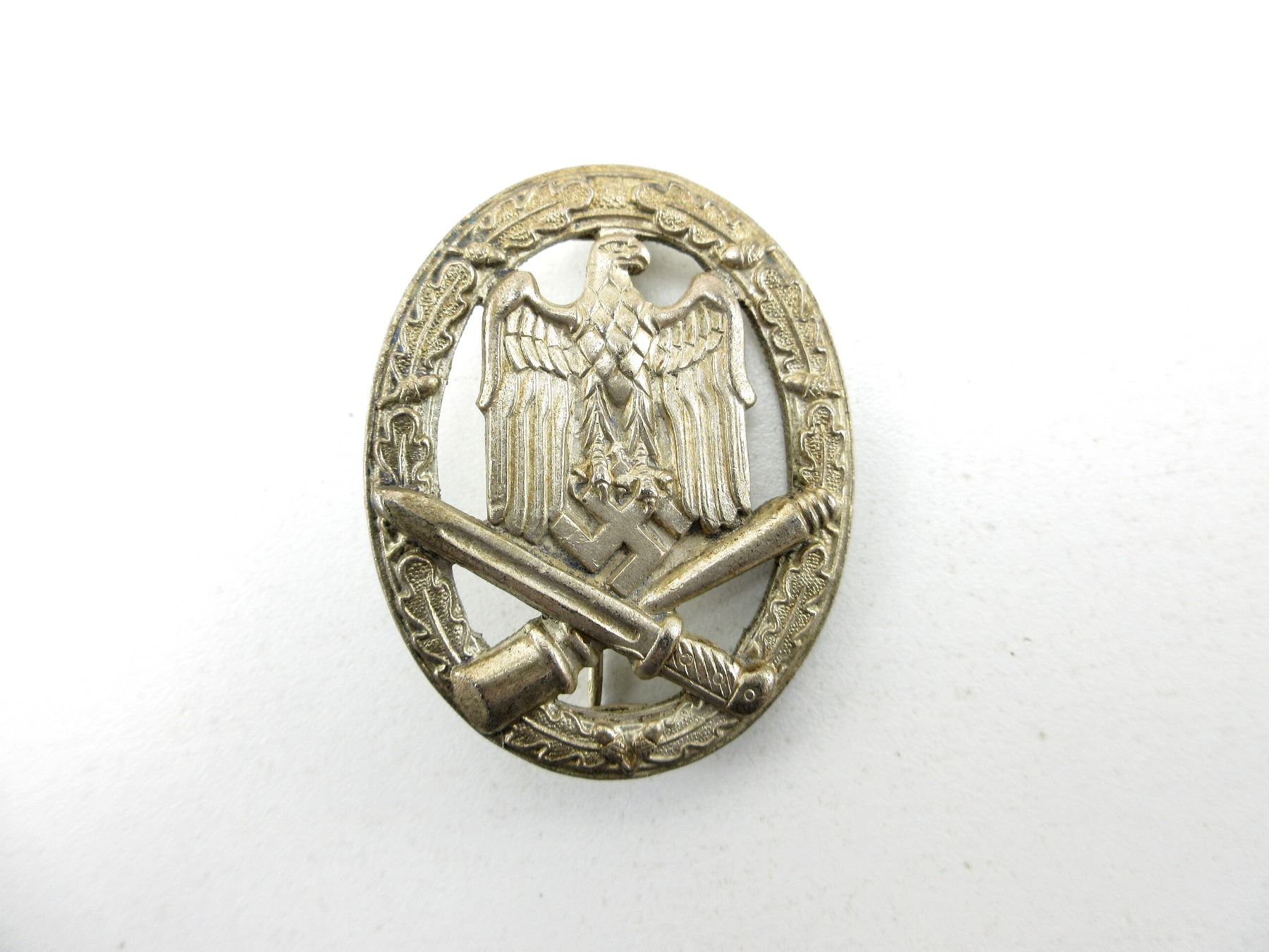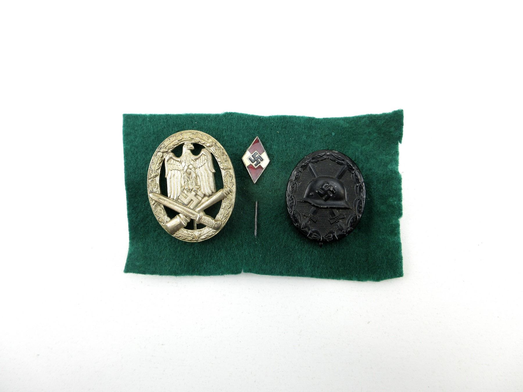 LOT INCLUDES; (1) REPRODUCTION METAL GENERAL ASSAULT BADGE, MARKED: "COPY" ON STICKER ON BACK, PIN INTACT, (1) REPRODUCTION HITLER YOUTH MEMBERSHIP PIN, MARKED: "COPY" ON STICKER ON BACK, PIN INTACT & (1) REPRODUCTION BLACK PAINTED METAL WOUND BADGE, MARKED: "81" ON BACK, PIN INTACT. SEE PHOTOS.