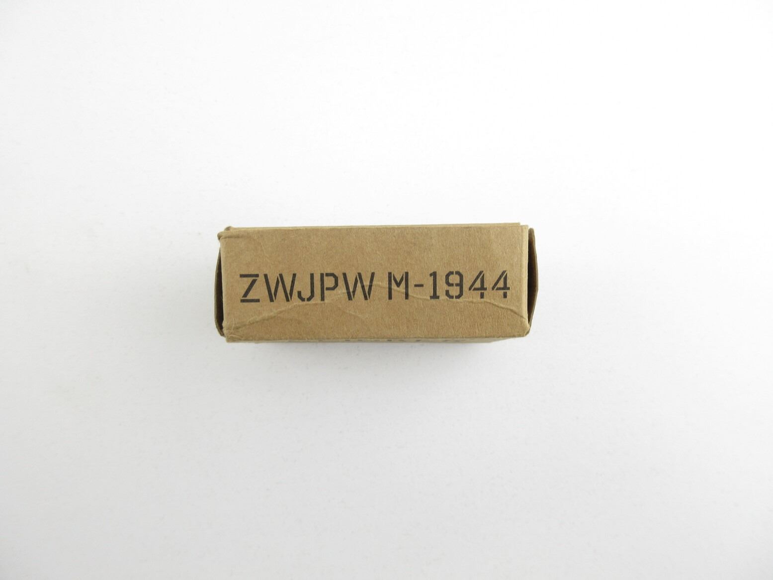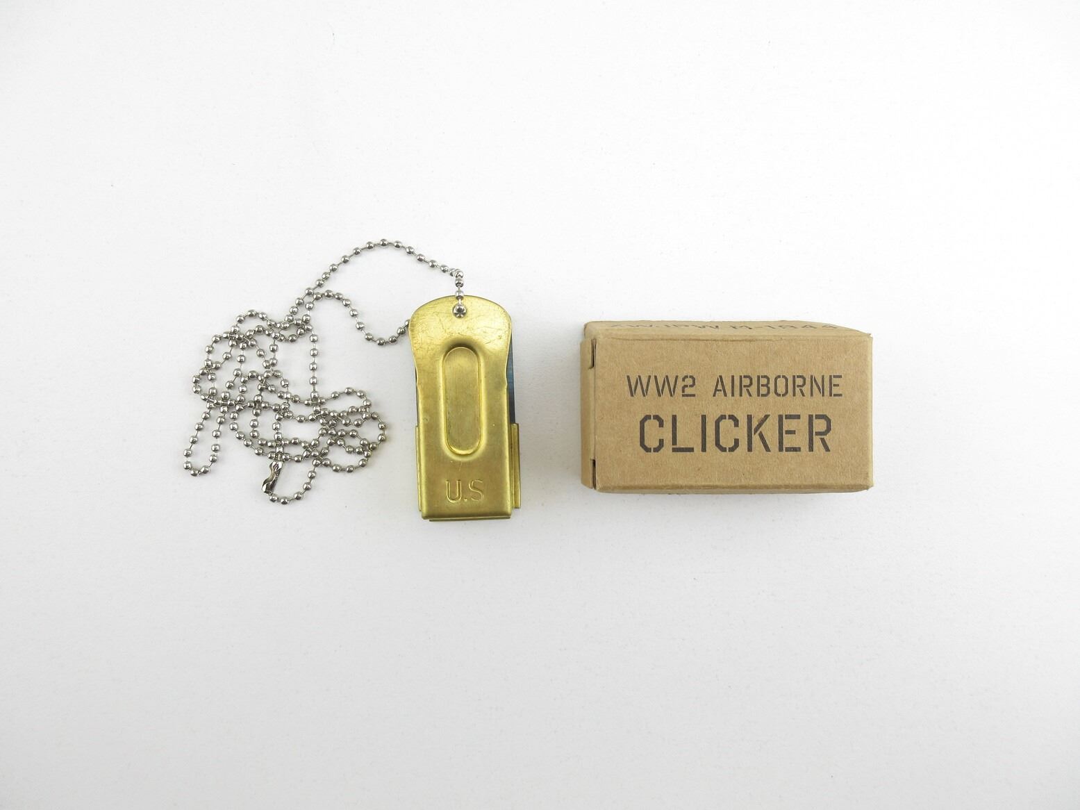 (1) BRASS AIRBORNE CLICKER WITH CHAIN, MARKED: "U.S.", COMES WITH BOX, BOX MARKED: "WW2 AIRBORNE CLICKER", "ZWJPW, M-1944" & "D-DAY KEEP HISTORY ALIVE" & CLICKER OAL APPROX.2 1/8". SEE PHOTOS.