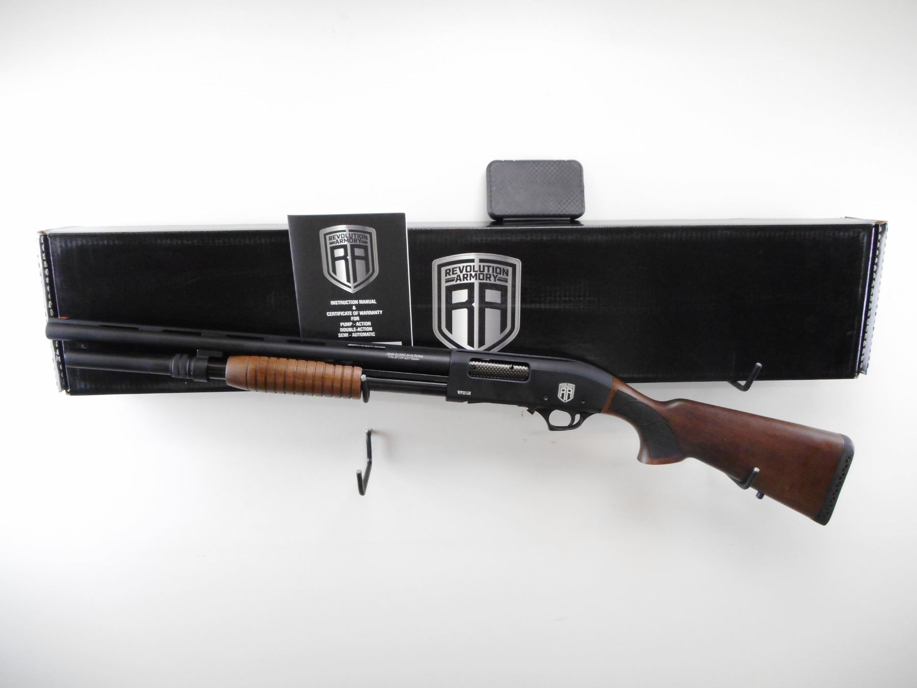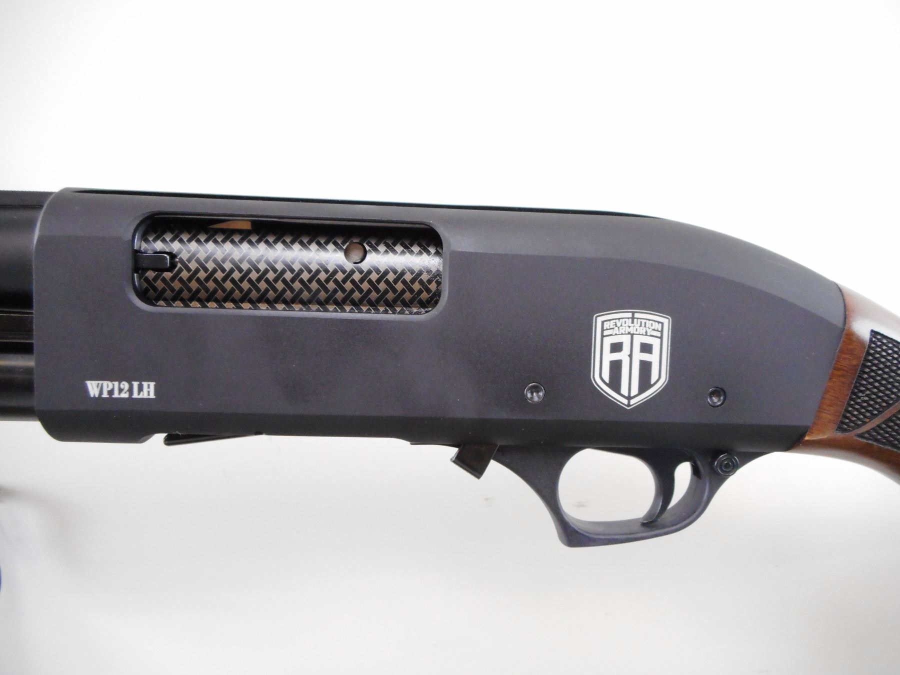 REVOLUTION ARMOURY , MODEL: WP12LR (LEFT HAND) , CALIBER: 12GA X 3" , COMES WITH BOX, 3 CHOKES, MANUAL AND WRENCH. BORE IS EXCELLENT, APPEARS AS NEW MAY HAVE BEEN TEST FIRED AT FACTORY. RED FIBER OPTIC FRONT BEAD SIGHT. VENTED RIB. BLACK MATTE FINISH ON METAL PARTS. EXTENDED MAG TUBE. TWO PIECE WOOD STOCK. GROOVED FOREND. CHECKERED PISTOL GRIP. BLACK VENTED RUBBER RECOIL PAD. SHOWS SLIGHT MARKS ON THE MAG TUBE. , SERIAL # WP12LH121092 , ACTION: PUMP ACTION SHOTGUN , BARREL LENGTH: 20" , CONDITION: AS NEW IN BOX , CLASS: CANADIAN NON RESTRICTED CLASS