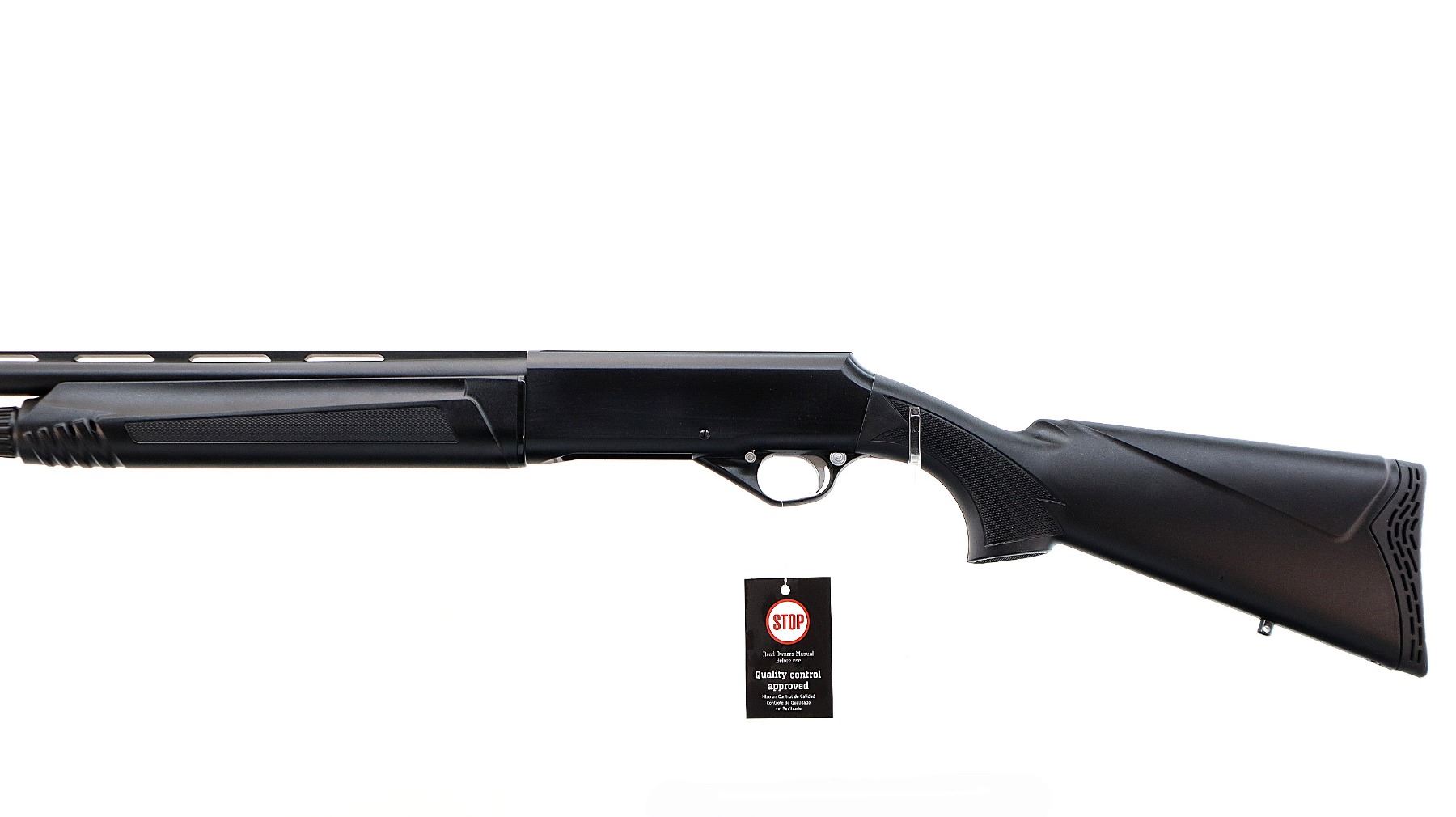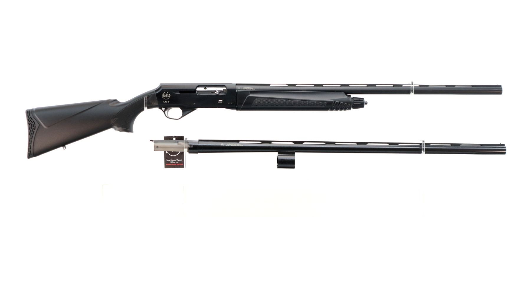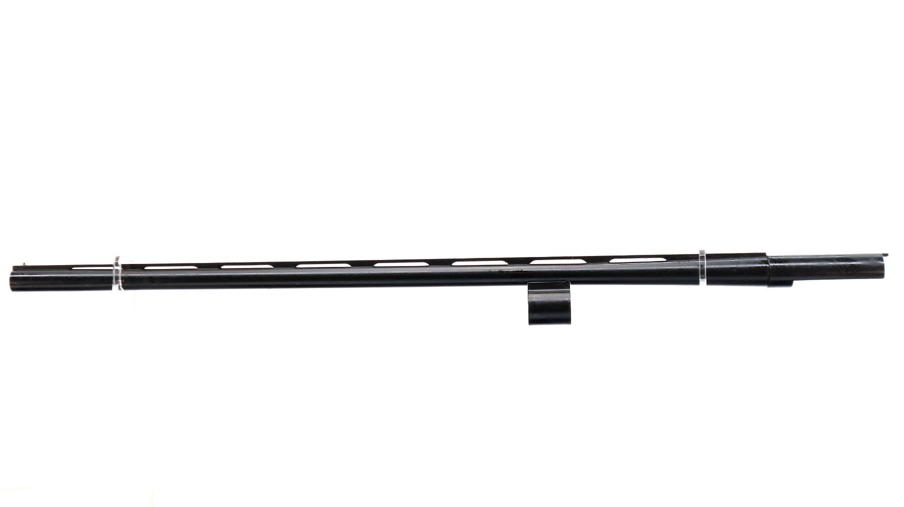 Main Description: May have been test fired in factory. Brass bead, Parkerized vent rib barrel, grooved black alloy receiver. Two piece black synthetic stocks, checkered forearm and pistol grip, ambi cheek rest, black vented rubber recoil pad, grip cap, swivel studs, retains factory hand tag. Spare Barrel: 12 G X 3", 30", Excellent Bore, Removable IM Choke Installed, Brass bead, Parkerized finished vent rib. Accessories include: Spare Extra Full and IC Chokes with wrench and case.