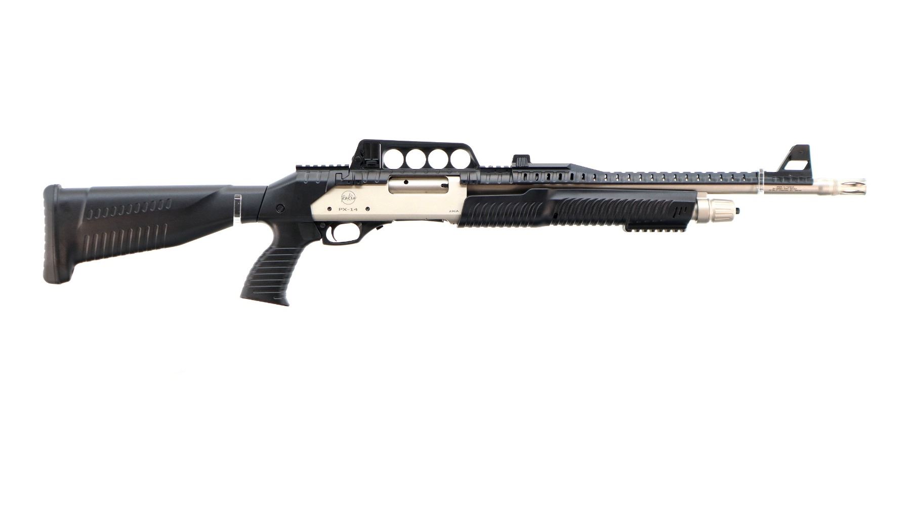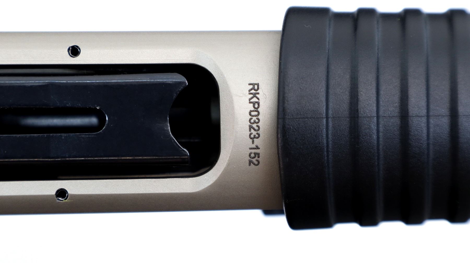 Main Description: May have been test fired in factory. Post front sight with ears and ramp, adjustable two position rear sight, stainless round barrel, silver alloy receiver. Barrel and receiver have black polymer shrouds with short rails. Three piece black synthetic stocks, grooved extended forearm with rail, grooved pistol grip, removable butt stock, grooved black rubber recoil pad, front swivel stud.