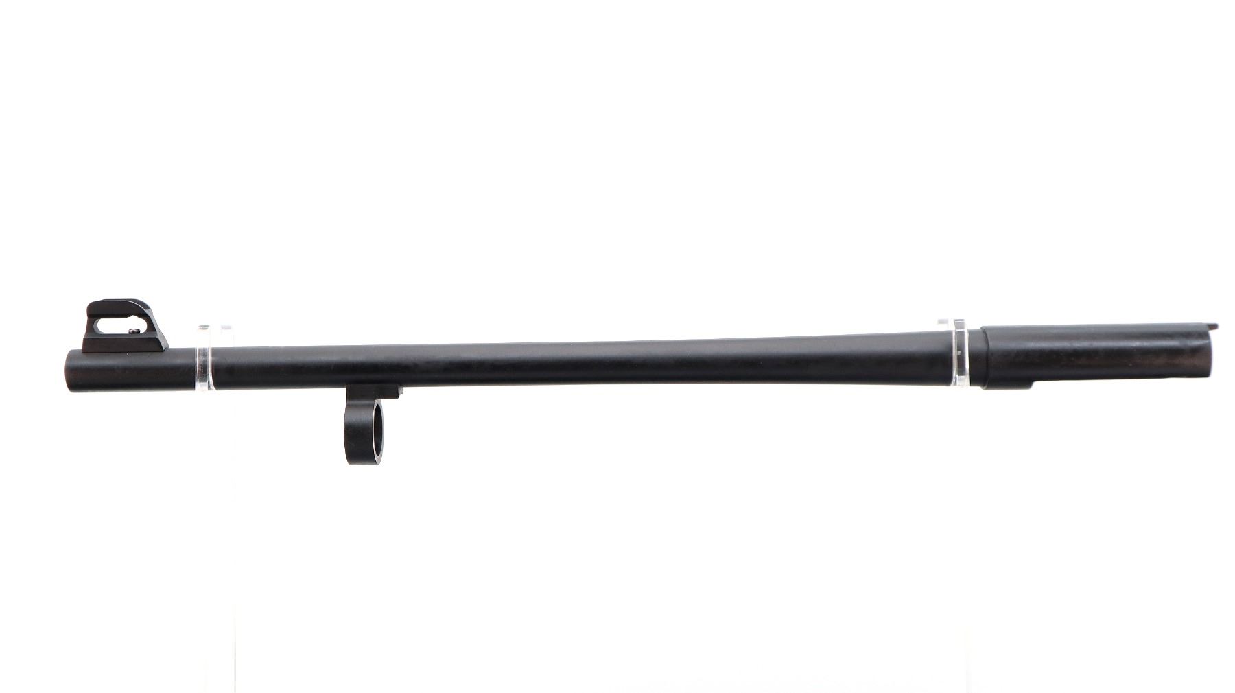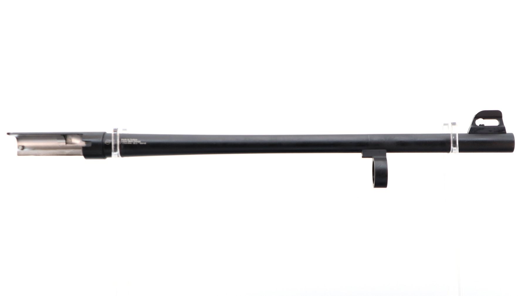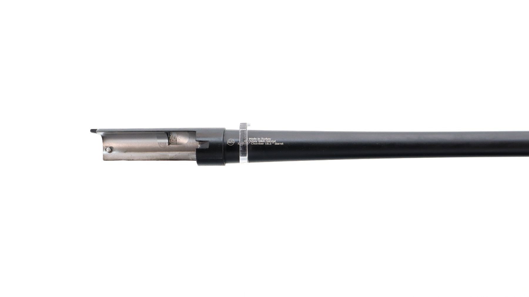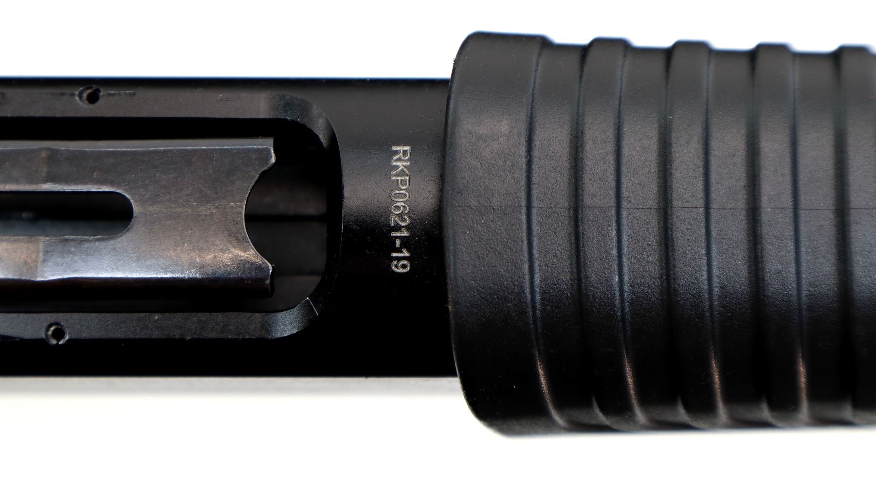 Main Description: May have been test fired in factory. Blade front sight, Parkerized round barrel, black matte grooved alloy receiver. Two piece black synthetic stocks, grooved extended forearm with rail on bottom, checkered pistol grip, ambi cheek rest, black vented rubber recoil pad, grip cap, swivel studs, retains Factory hand tag. Spare Barrel: 12 G X 3", 18.5", Excellent Bore, Fixed IC Choke, Red fiber optic front sight with ears and ramp, Parkerized round barrel.