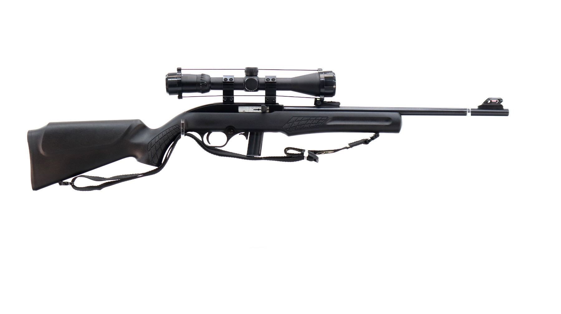 Main Description: Red fiber optic front sight with ramp, adjustable u notched green fiber optic rear sight, blued round barrel, grooved black alloy receiver with Tasco Rimfire 3-9x40 scope installed, clear optics with duplex crosshair. One piece black synthetic stock, finger grooved and textured forearm and pistol grip panels, ambi cheek rest, grooved butt plate, grip cap, sling swivels with black nylon sling.